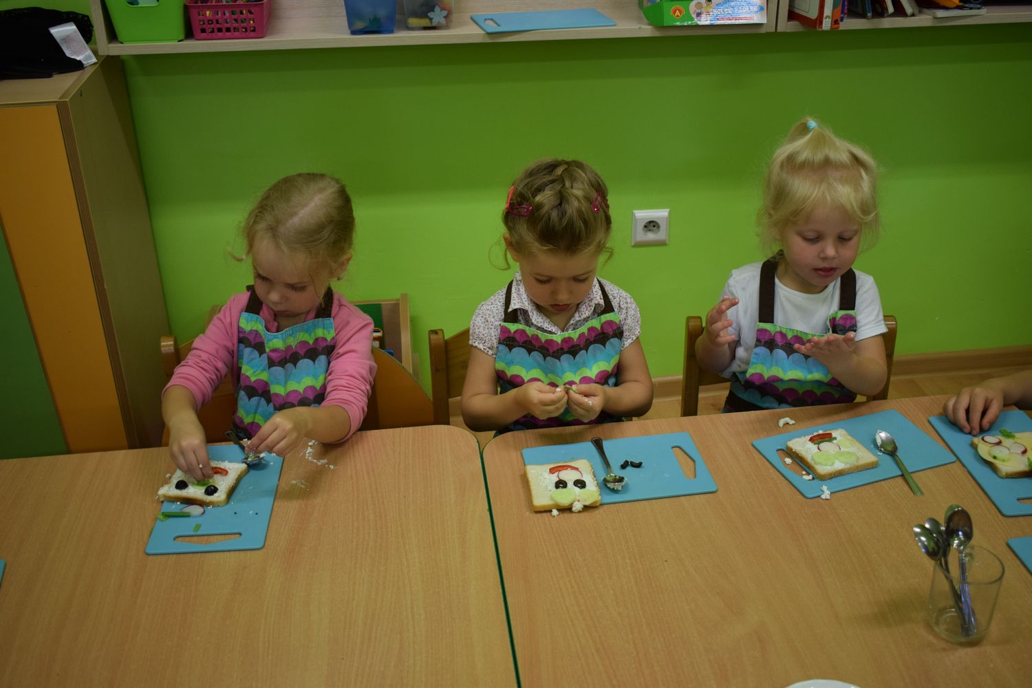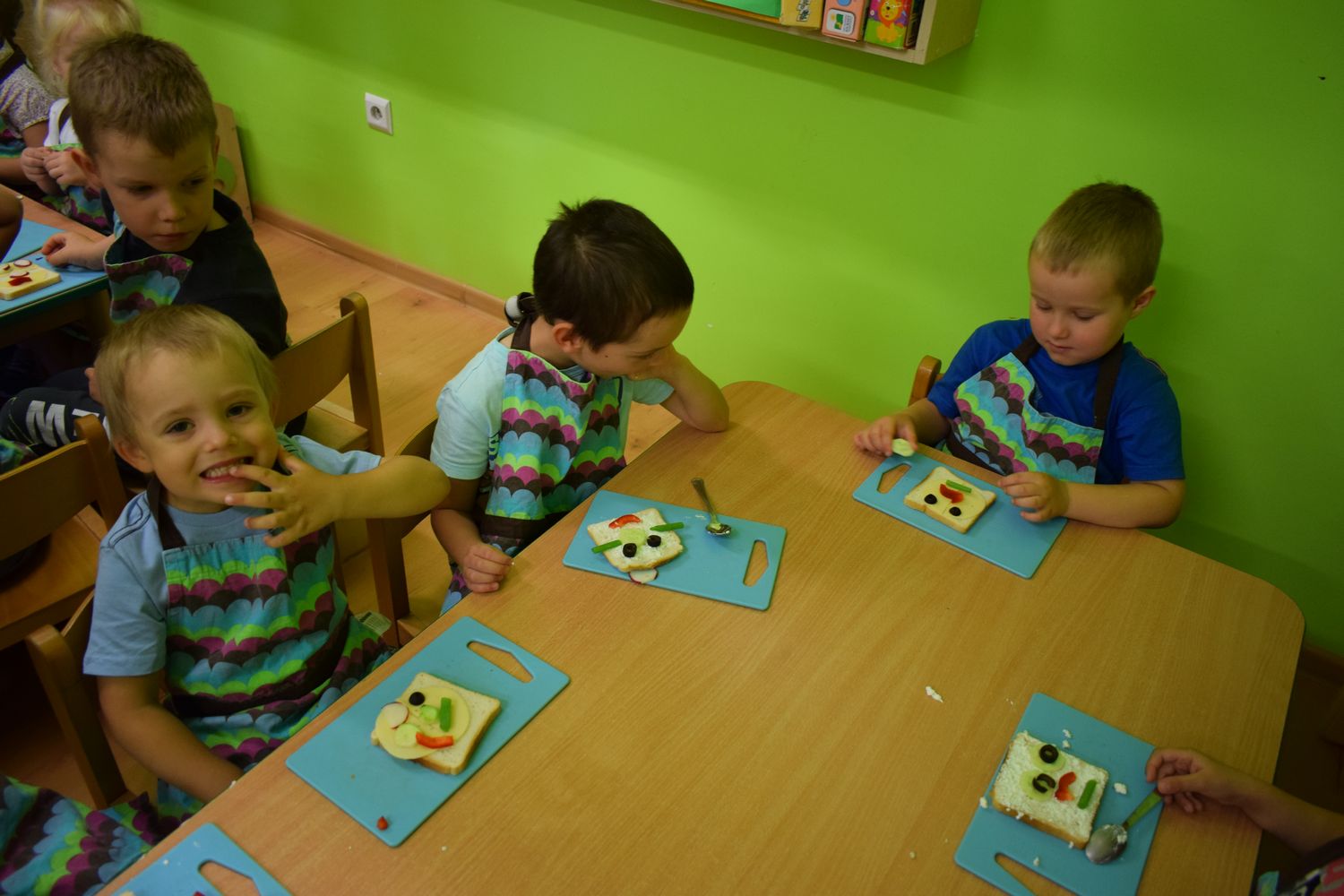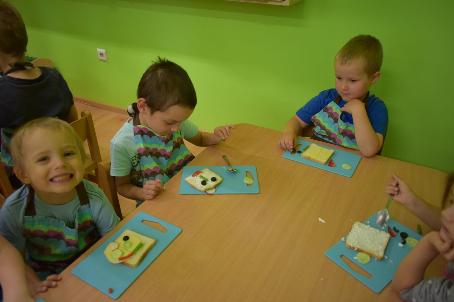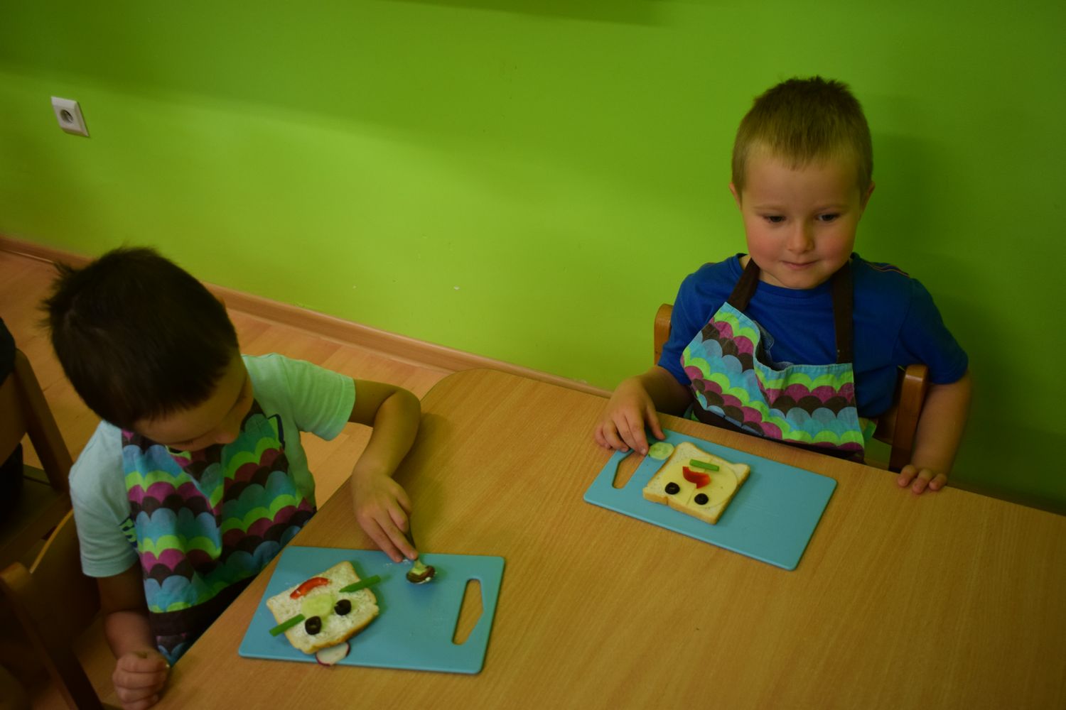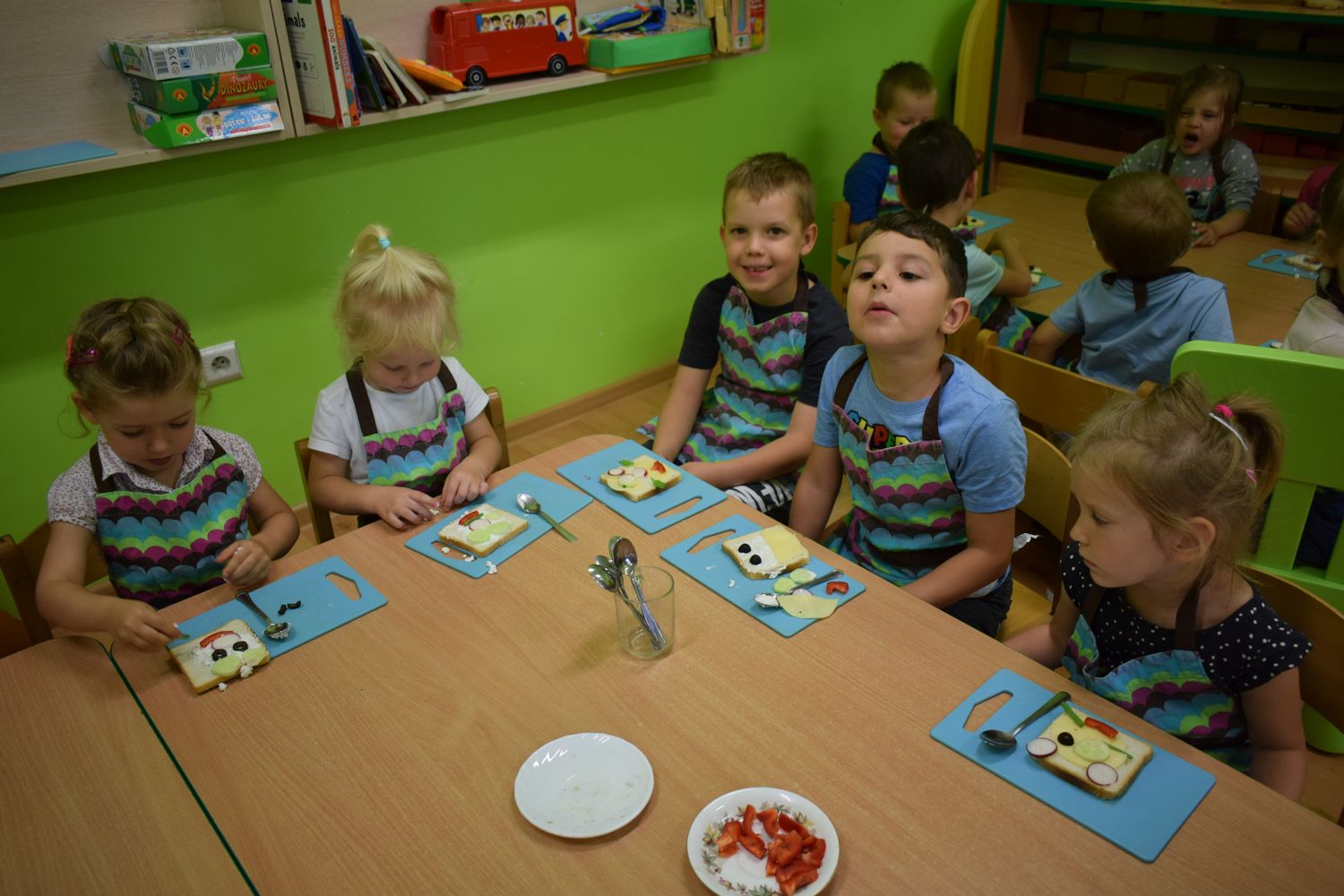 Na zaję­ciach z kuch­ci­kowa przed­szko­laki robiły kanap­kowe zwie­rzaki z twa­rożku i kolo­ro­wych warzyw.
