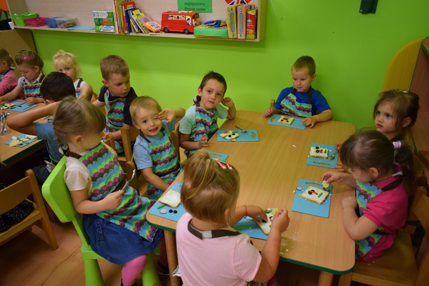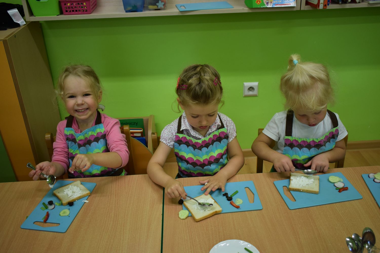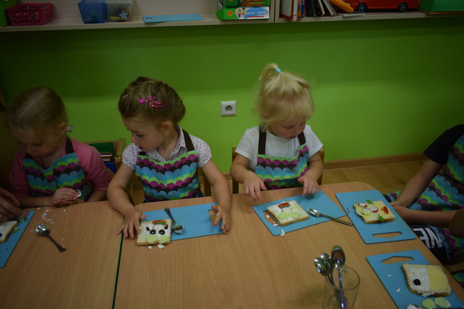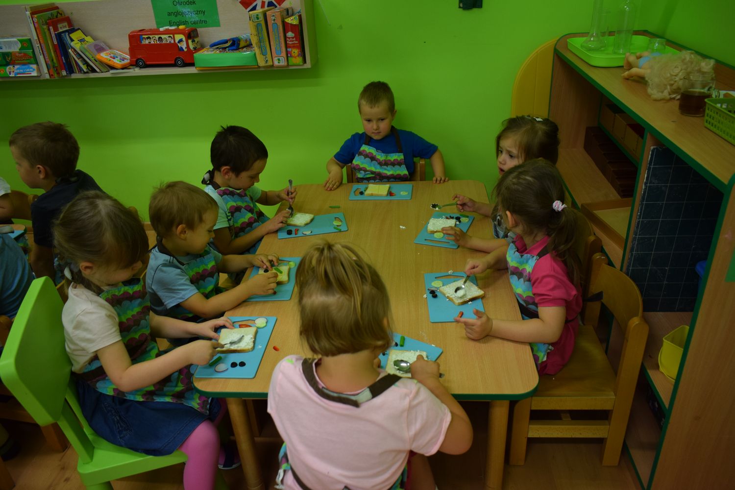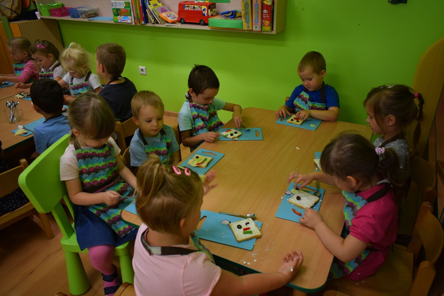 Na zaję­ciach z kuch­ci­kowa przed­szko­laki robiły kanap­kowe zwie­rzaki z twa­rożku i kolo­ro­wych warzyw.