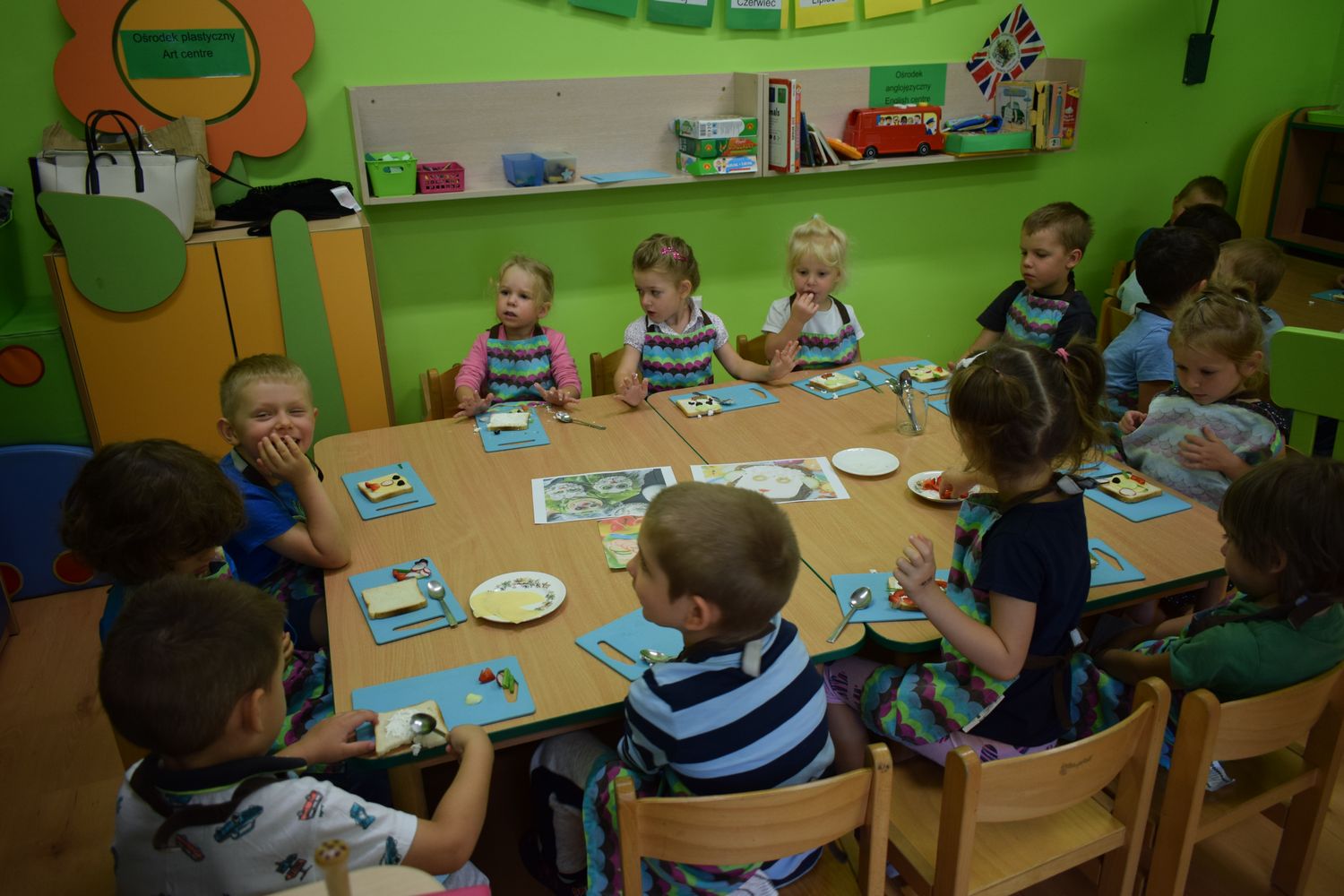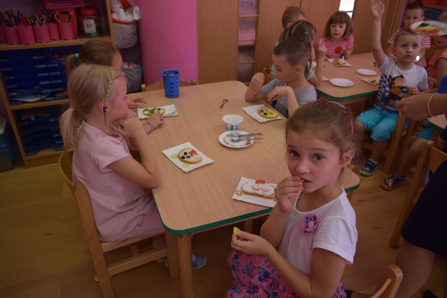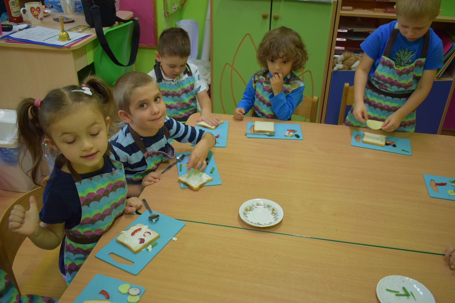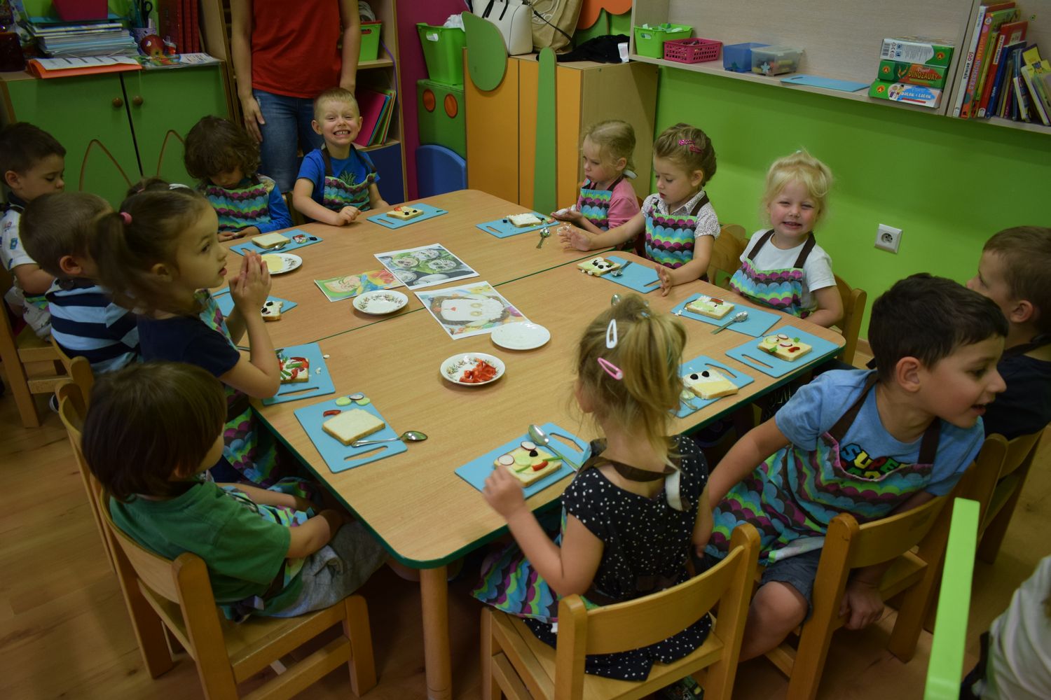 Na zaję­ciach z kuch­ci­kowa przed­szko­laki robiły kanap­kowe zwie­rzaki z twa­rożku i kolo­ro­wych warzyw.