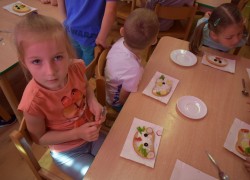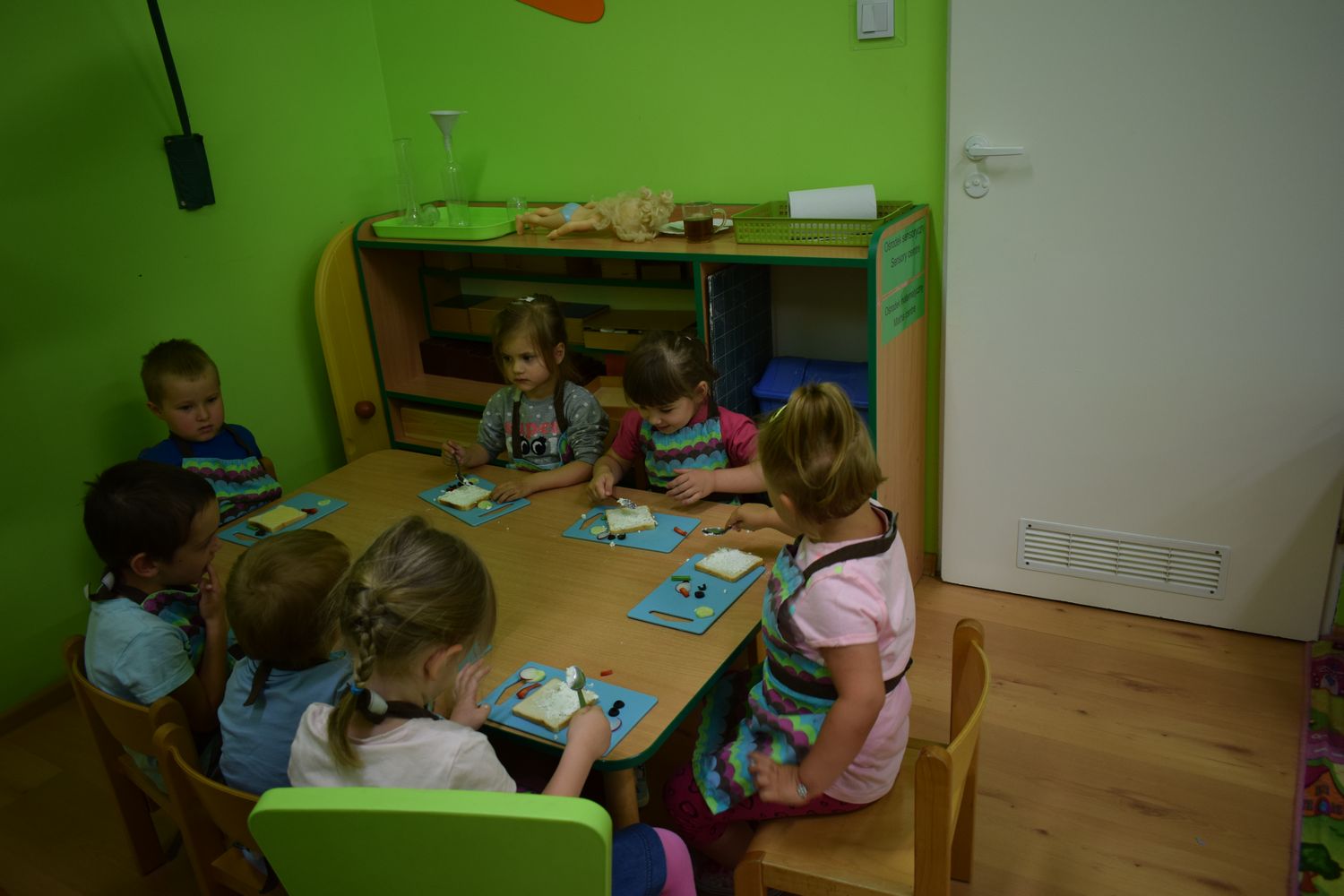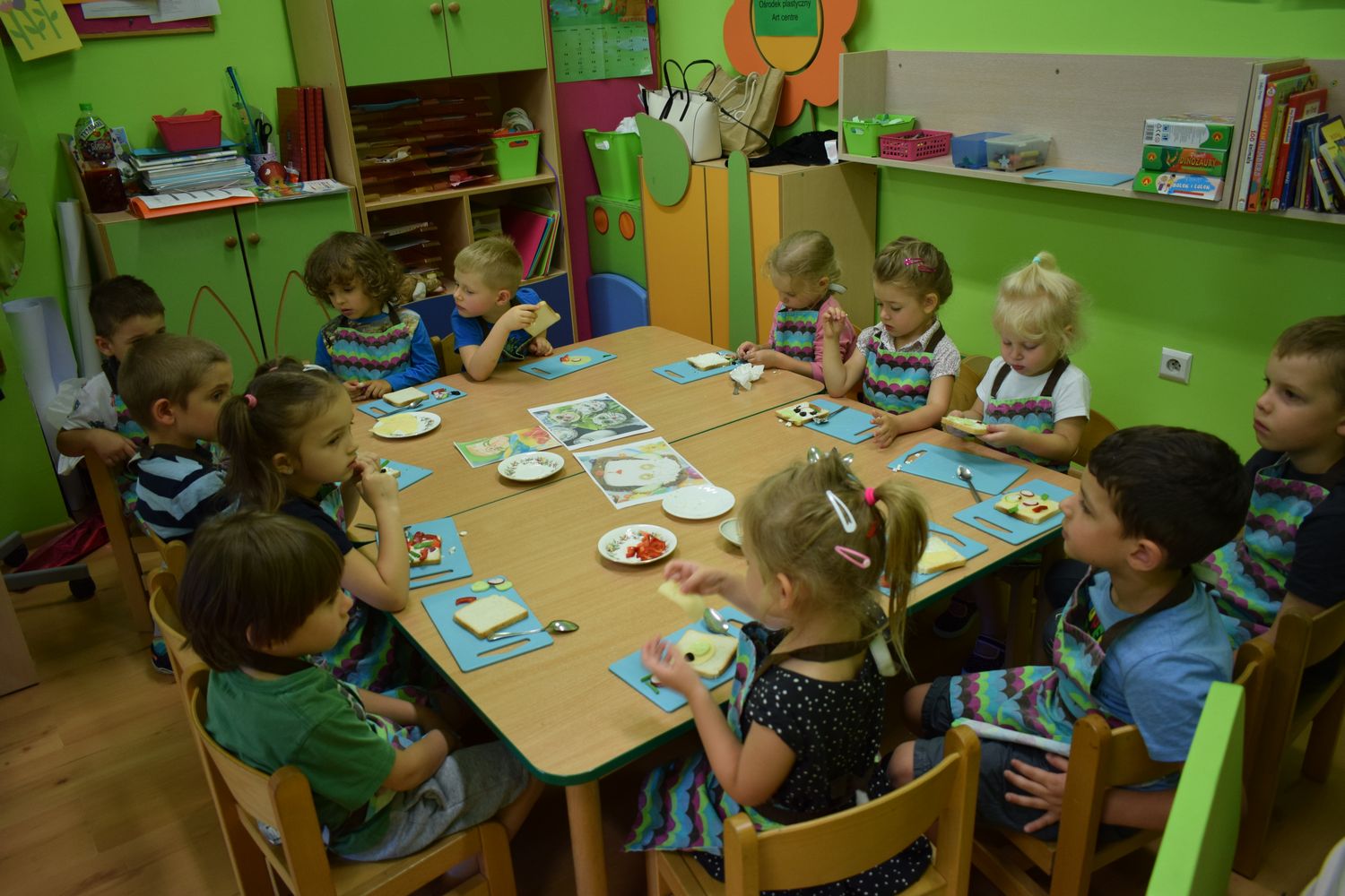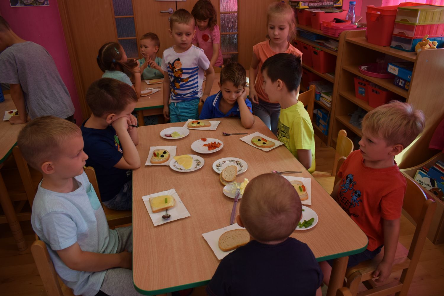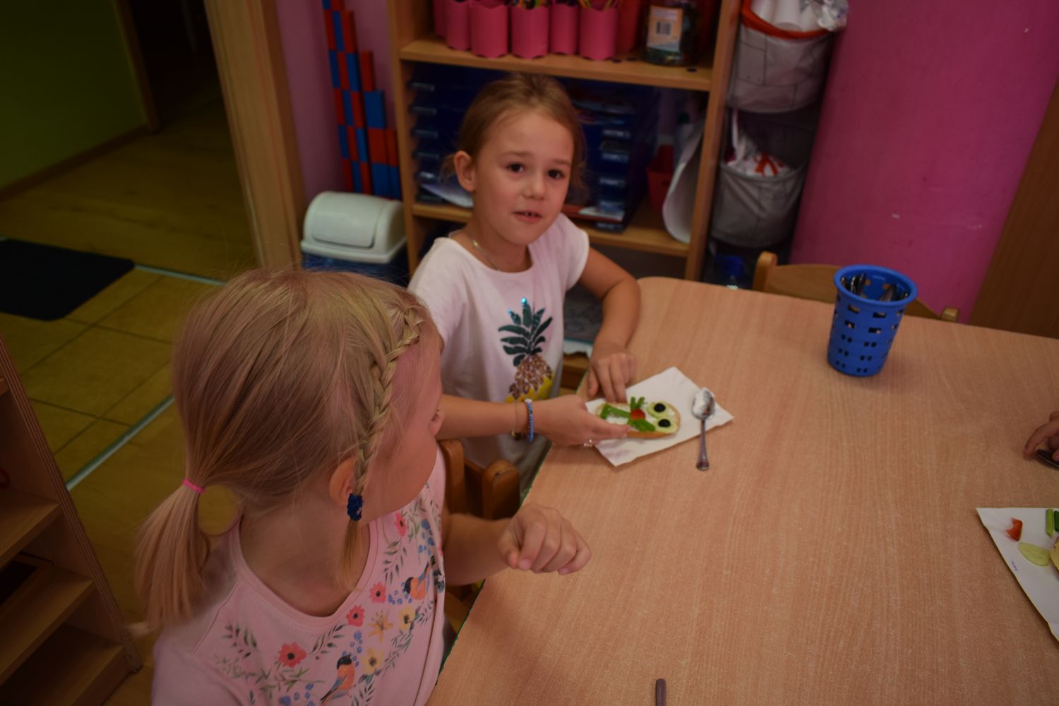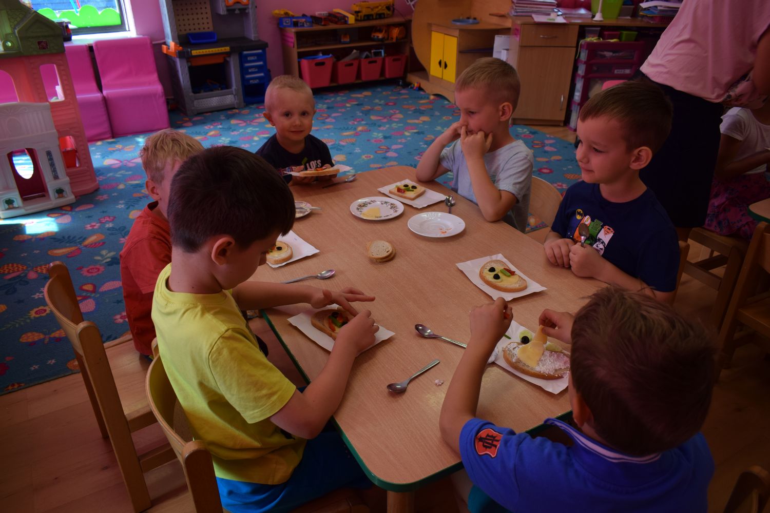 Na zaję­ciach z kuch­ci­kowa przed­szko­laki robiły kanap­kowe zwie­rzaki z twa­rożku i kolo­ro­wych warzyw.