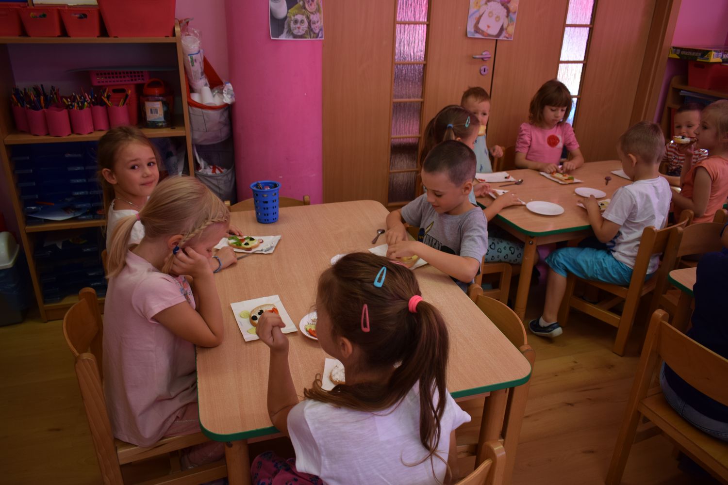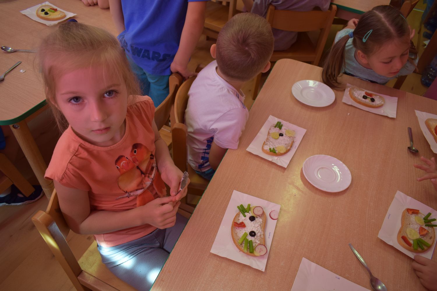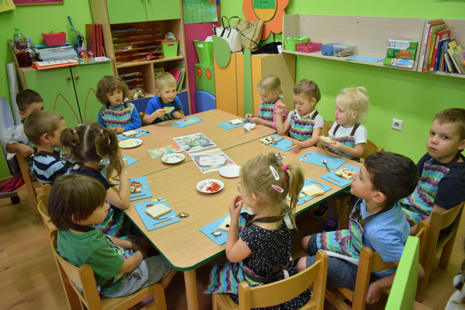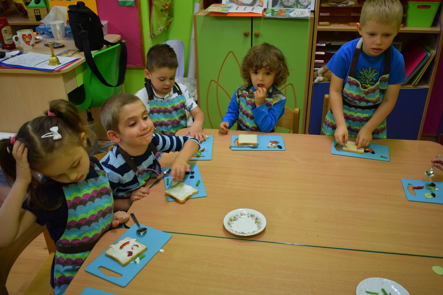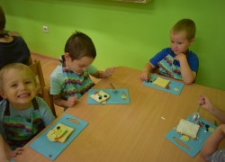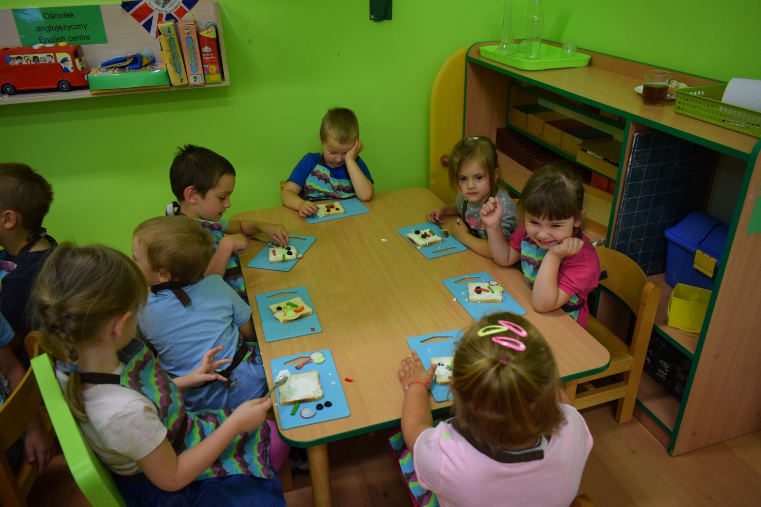 Na zaję­ciach z kuch­ci­kowa przed­szko­laki robiły kanap­kowe zwie­rzaki z twa­rożku i kolo­ro­wych warzyw.