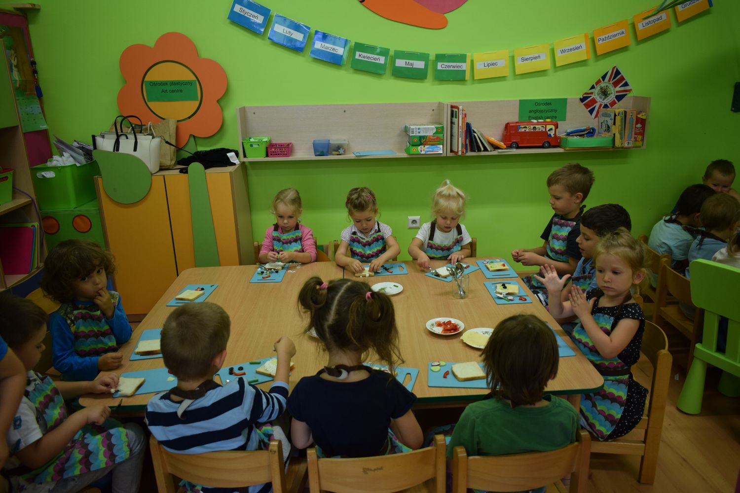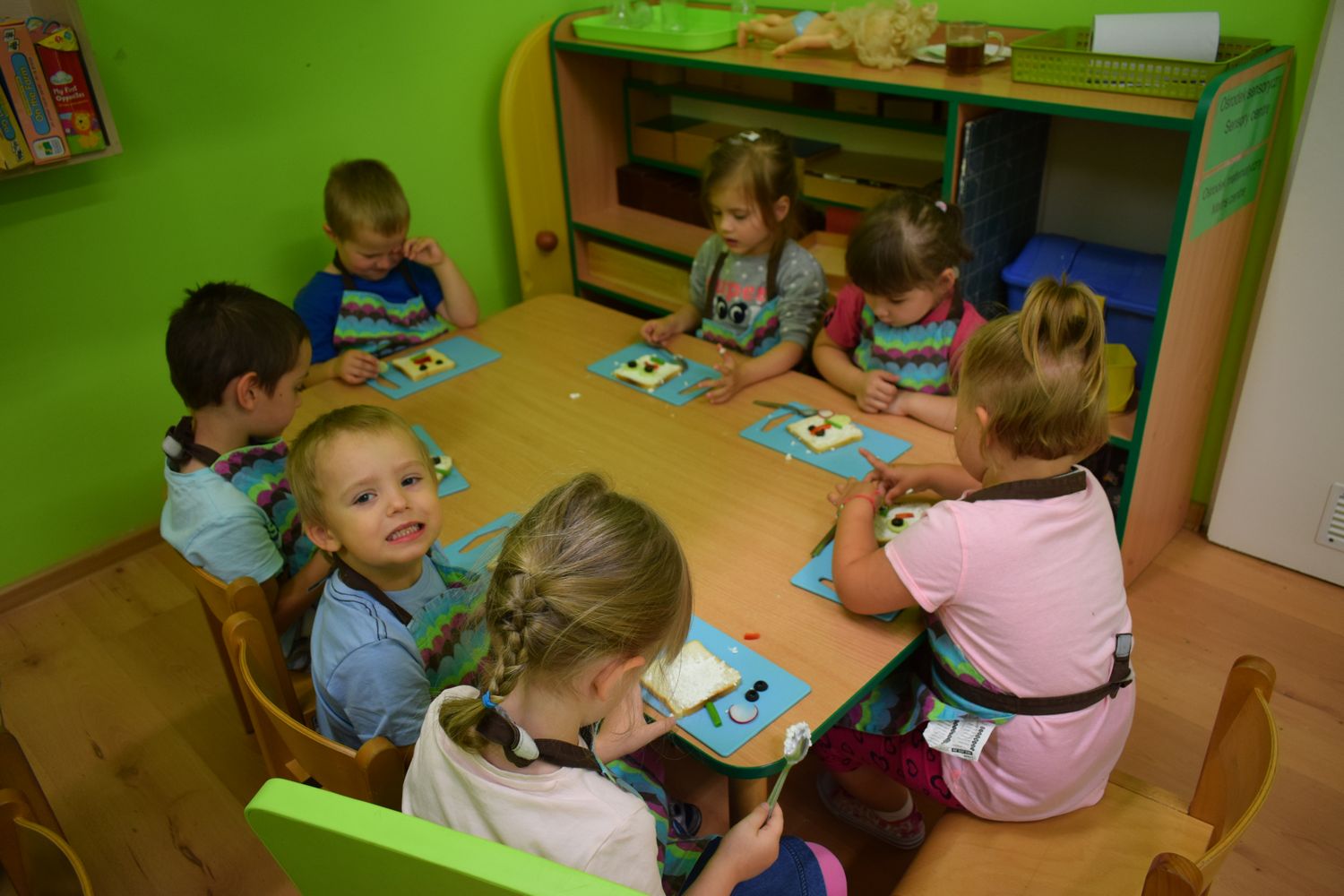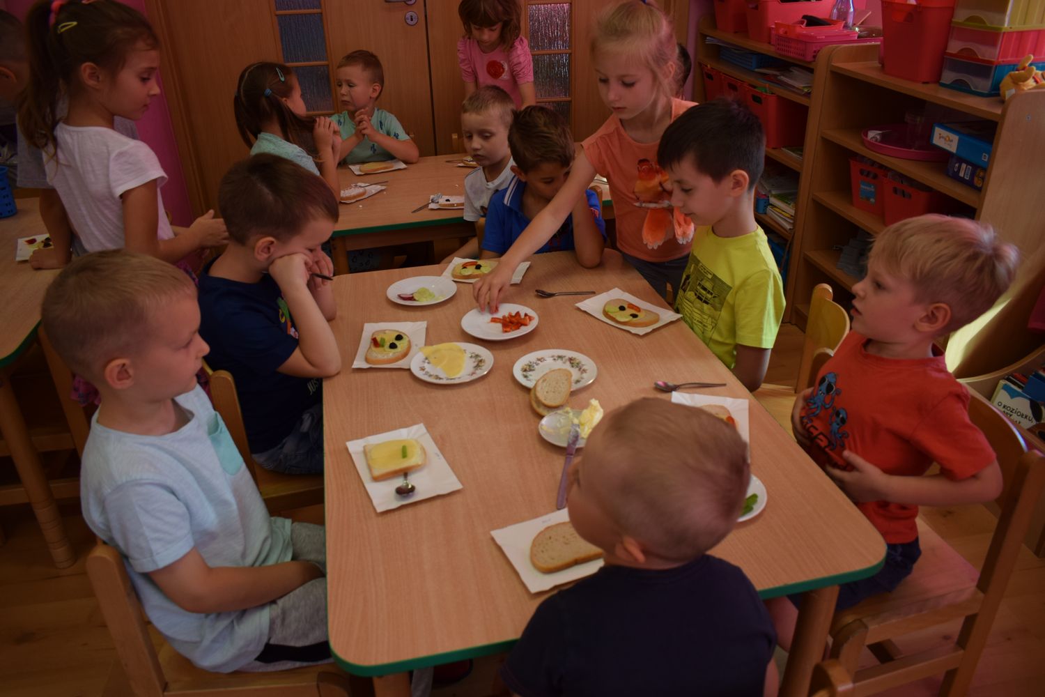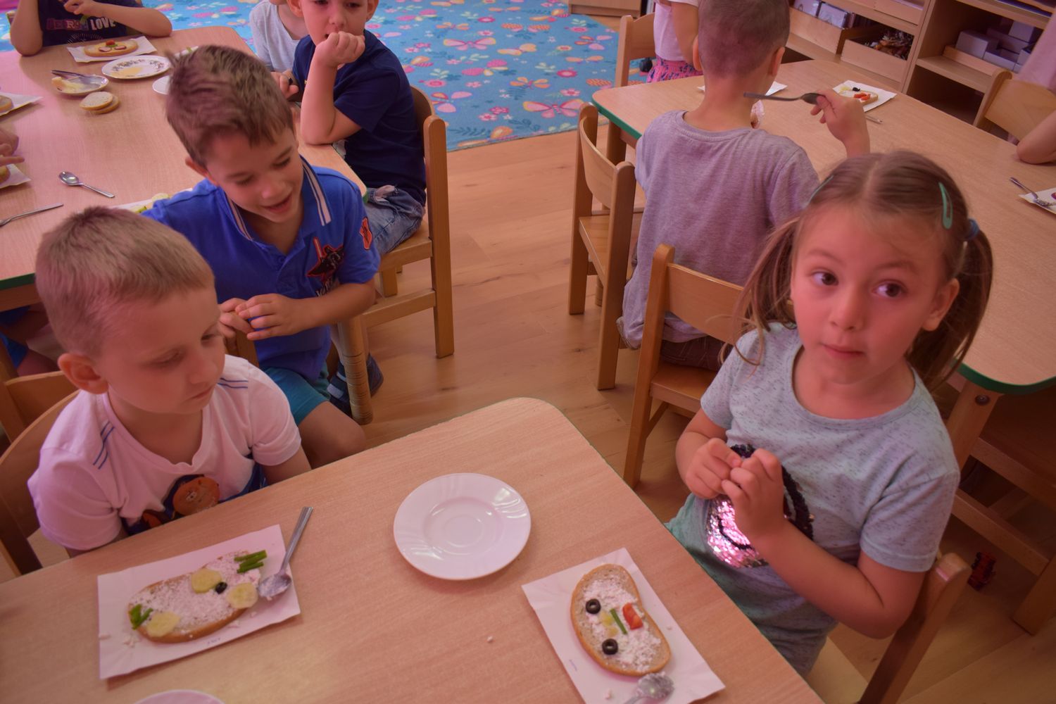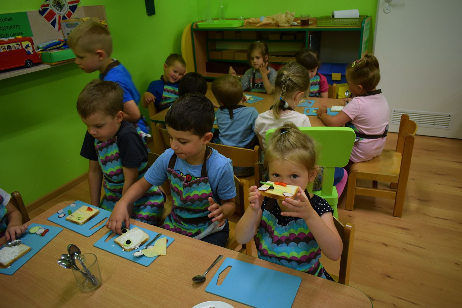 Na zaję­ciach z kuch­ci­kowa przed­szko­laki robiły kanap­kowe zwie­rzaki z twa­rożku i kolo­ro­wych warzyw.