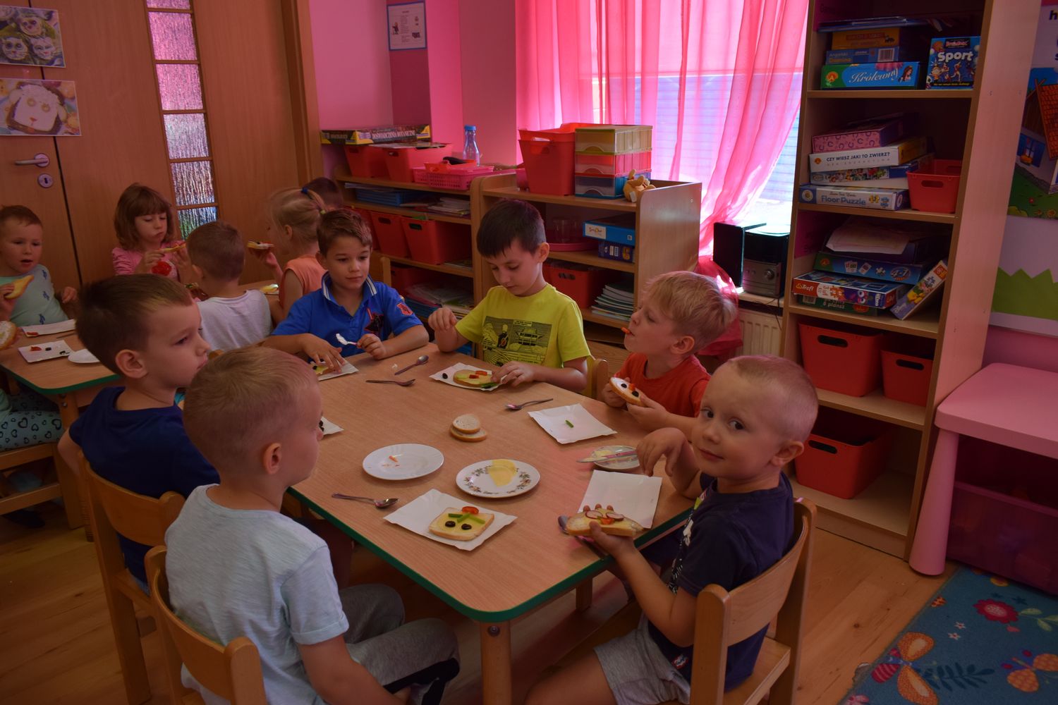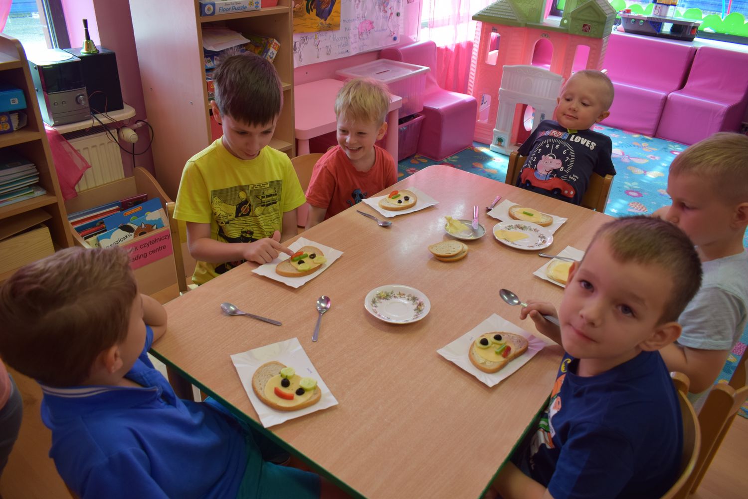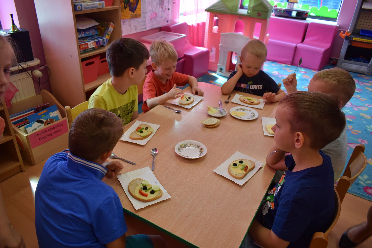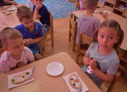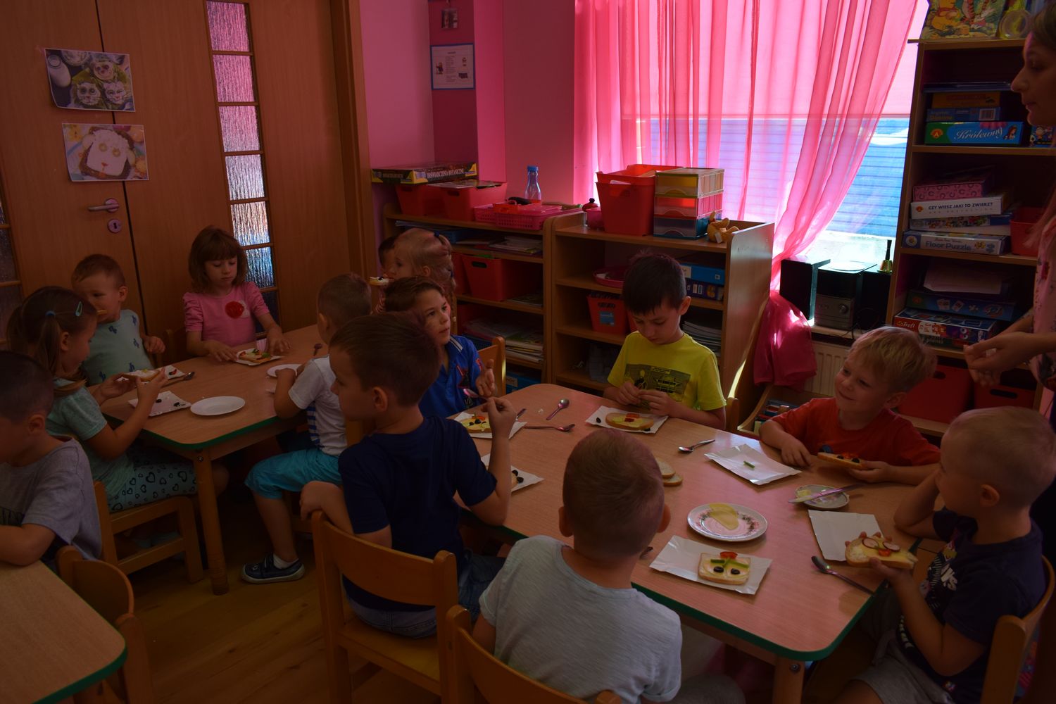 Na zaję­ciach z kuch­ci­kowa przed­szko­laki robiły kanap­kowe zwie­rzaki z twa­rożku i kolo­ro­wych warzyw.