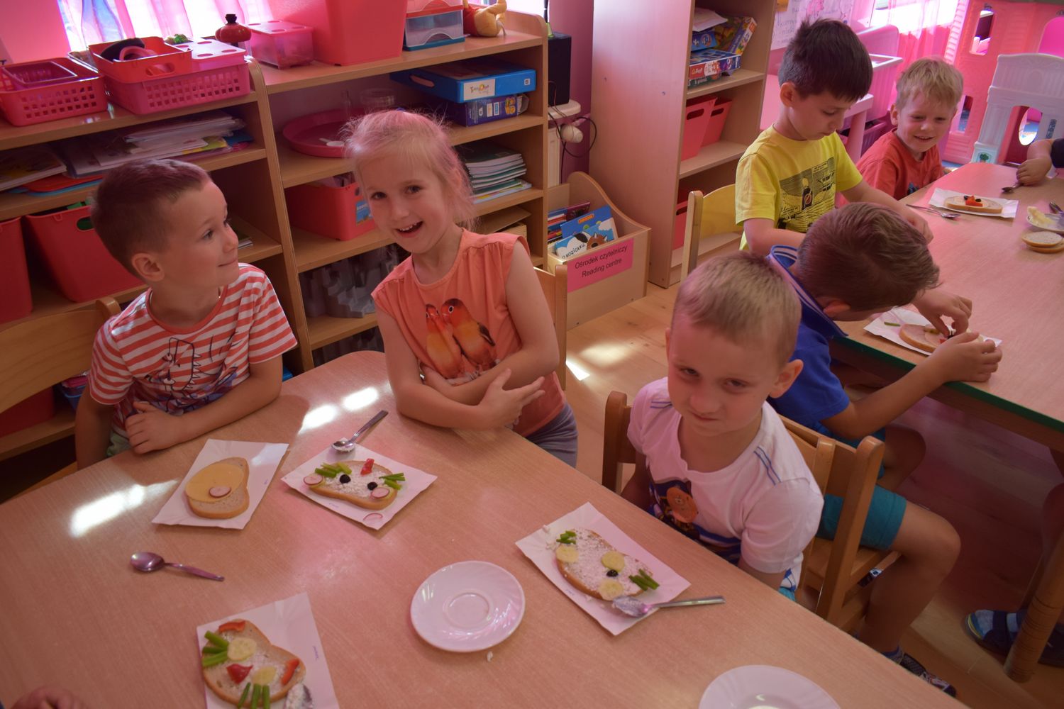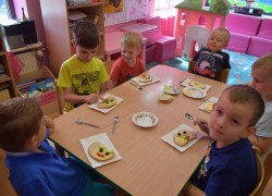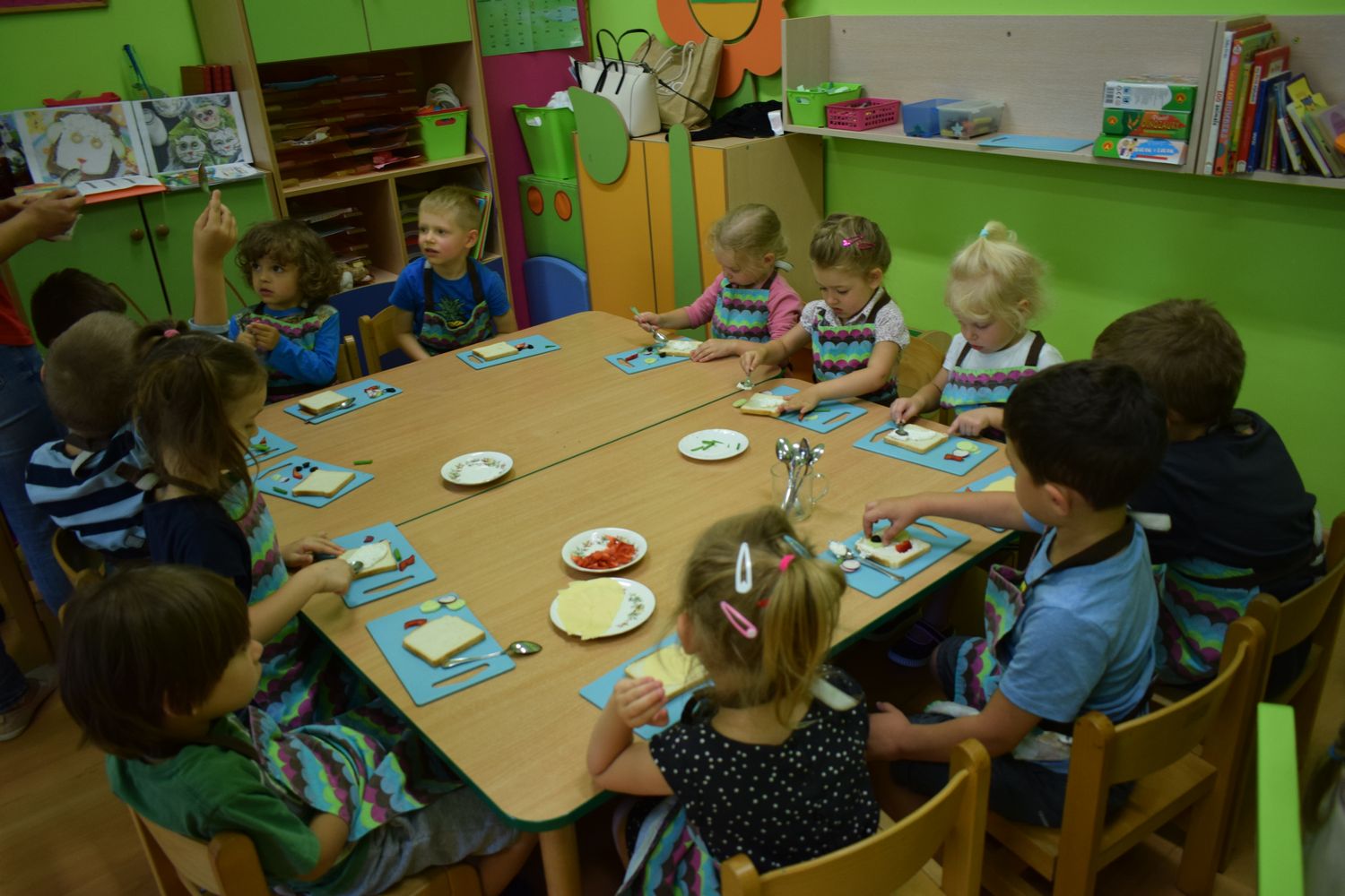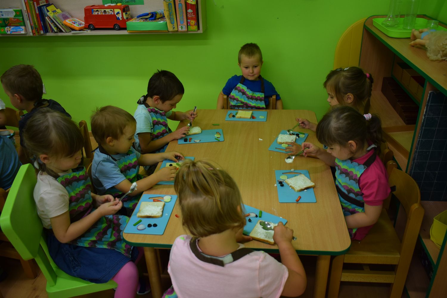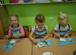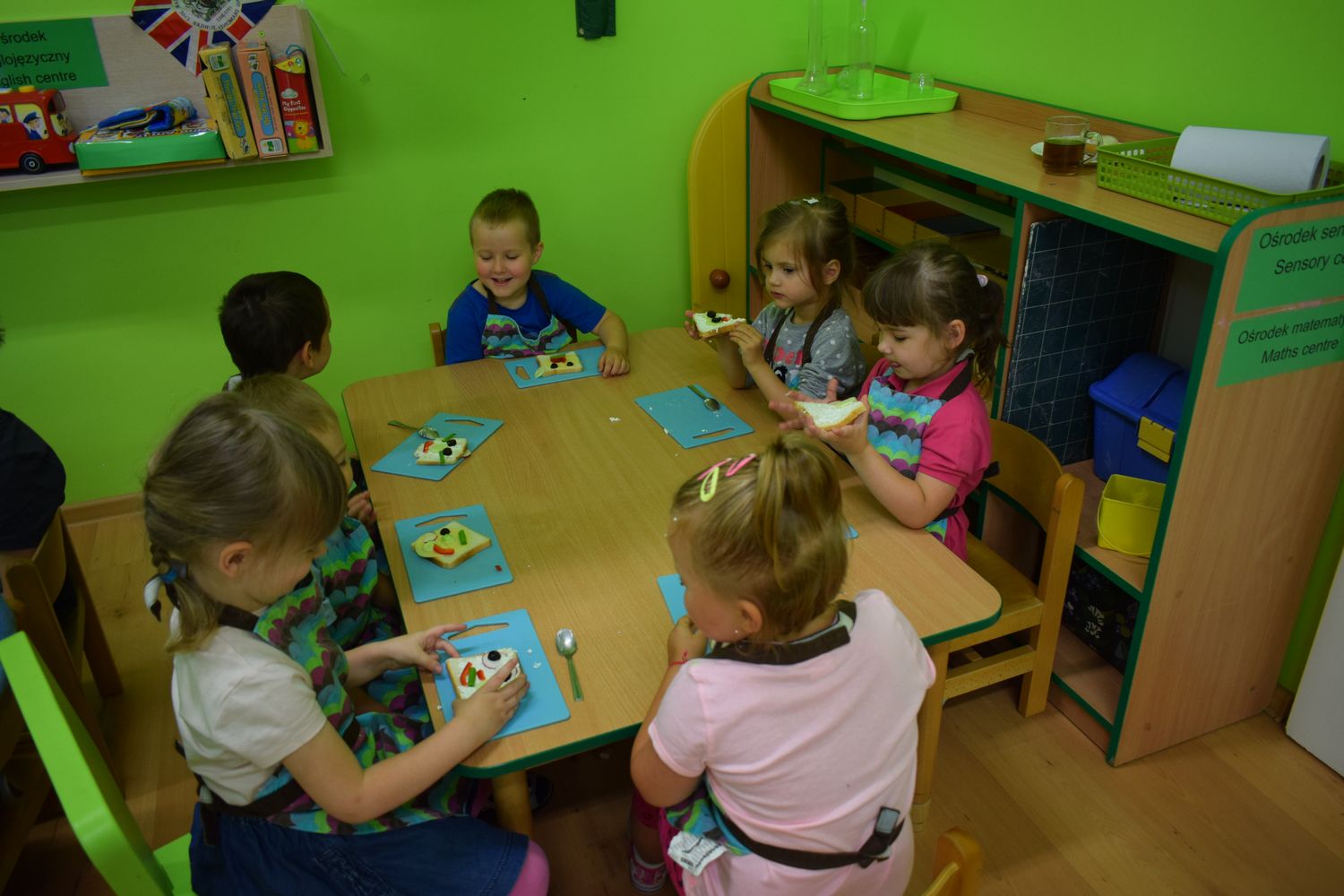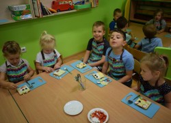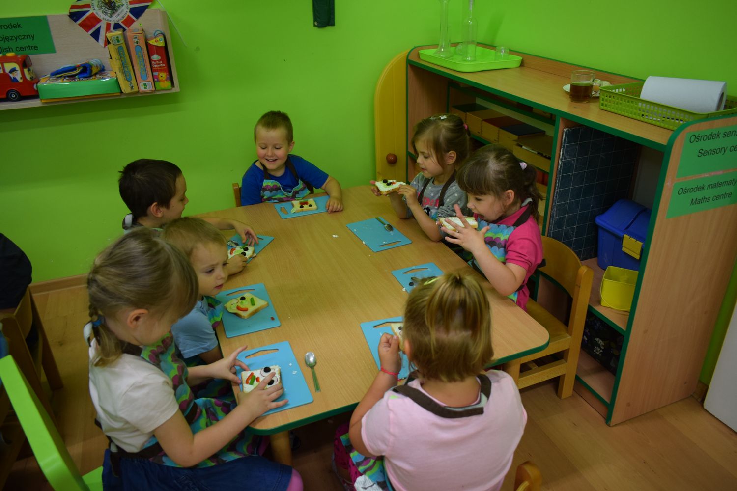Na zaję­ciach z kuch­ci­kowa przed­szko­laki robiły kanap­kowe zwie­rzaki z twa­rożku i kolo­ro­wych warzyw.