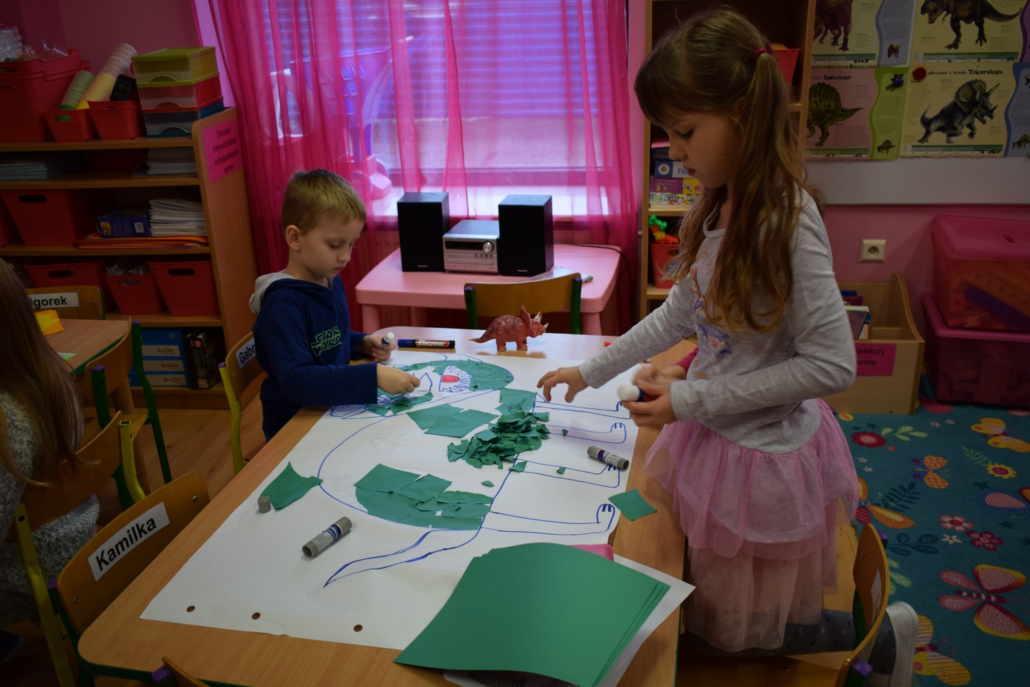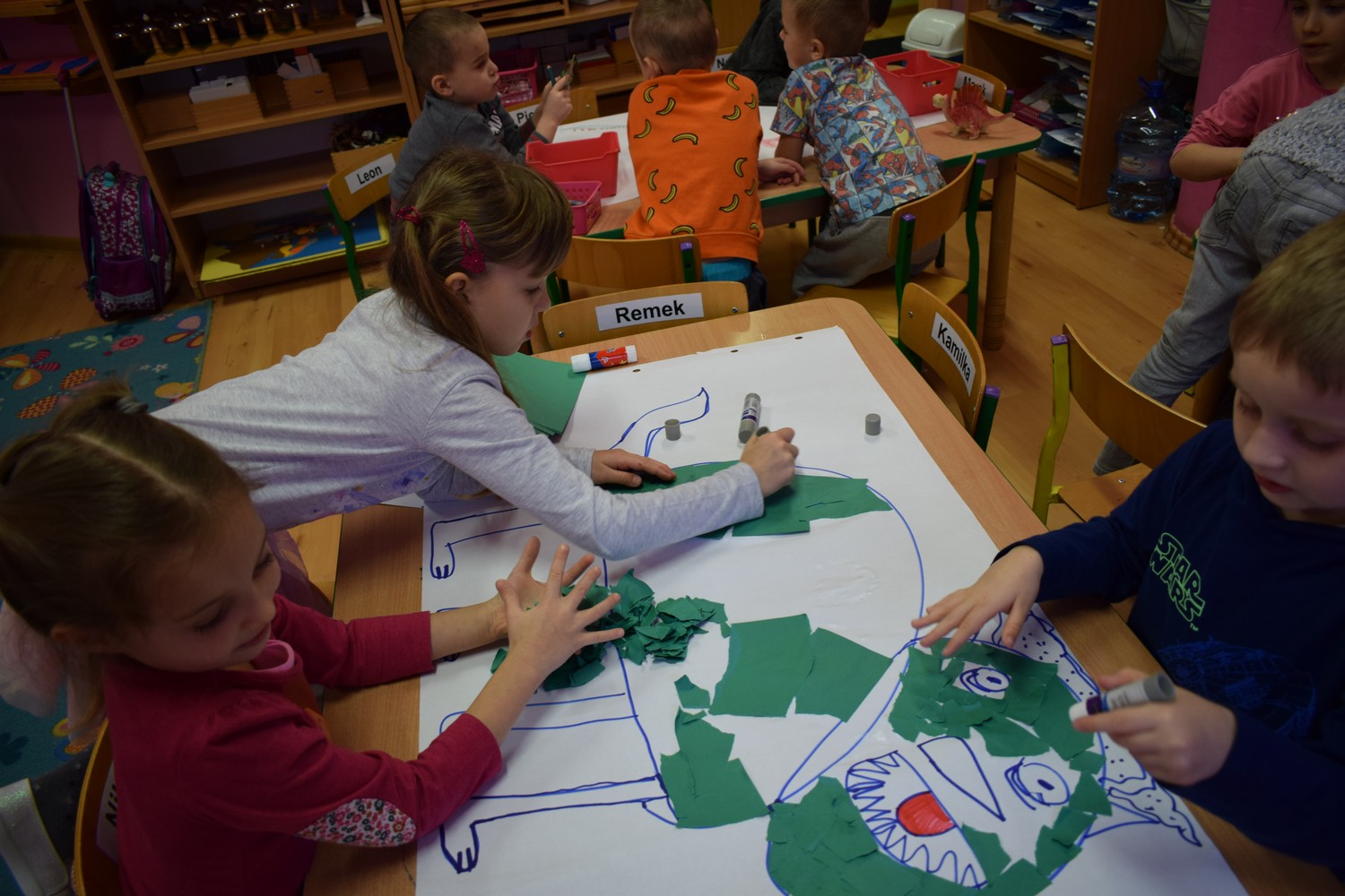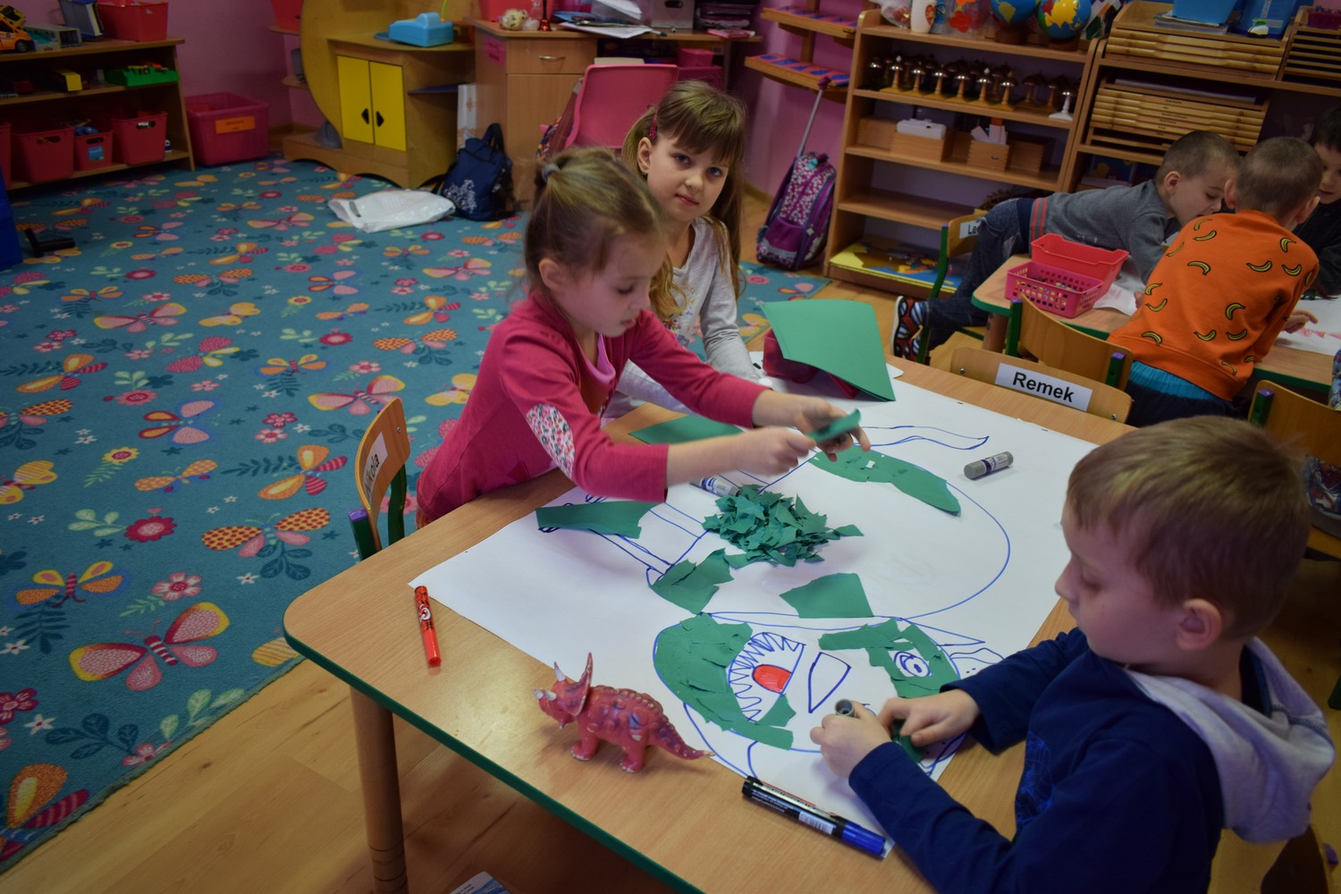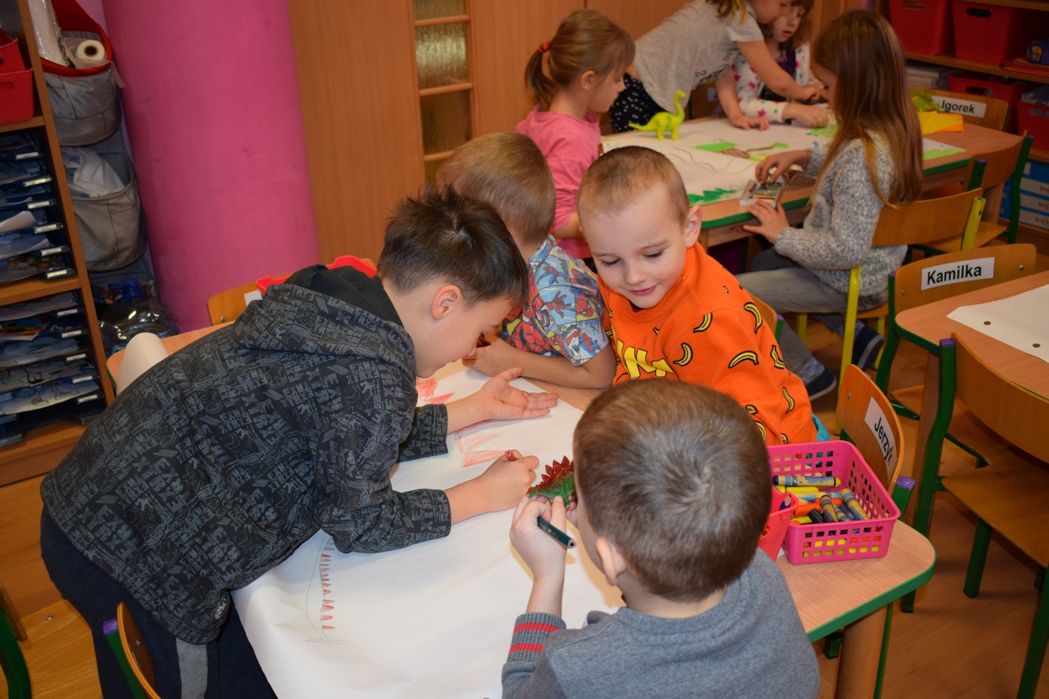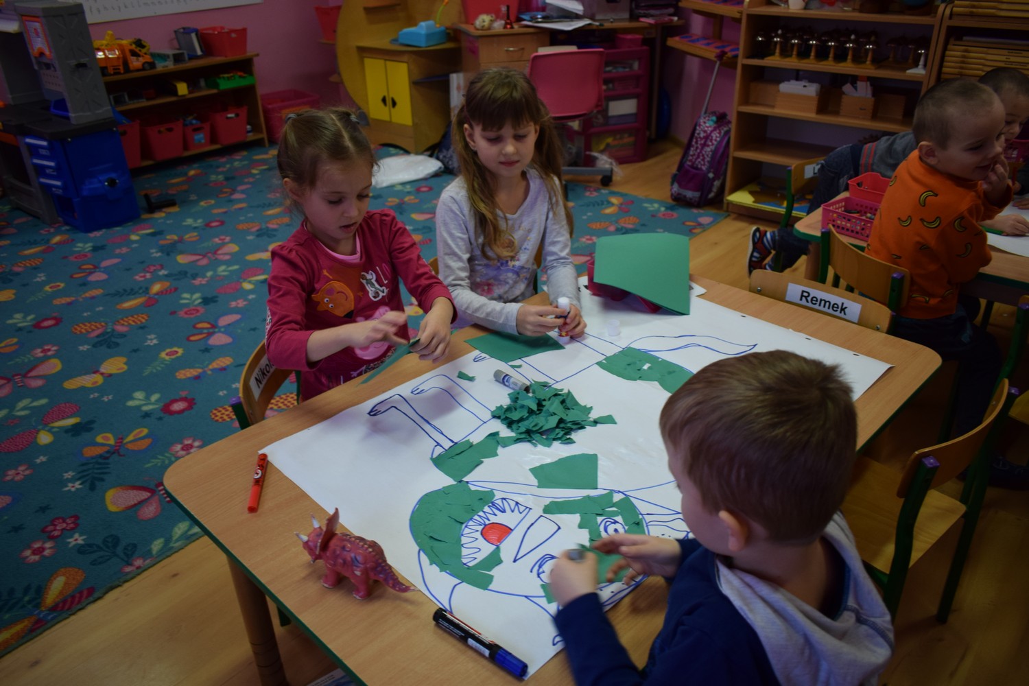 Dzieci z ogrom­nym zaan­ga­żo­wa­niem wykle­jały postaci pre­hi­sto­rycz­nych gadów, współ­pra­cu­jąc ze sobą. Pow­stały piękne gru­powe obrazy, które będą zdo­biły nasz przed­szkolny hol.