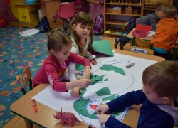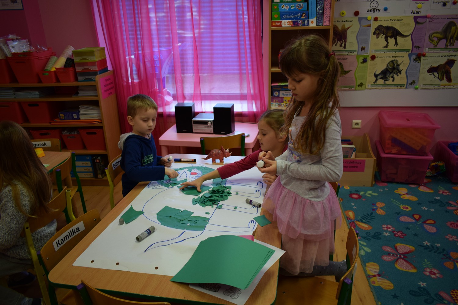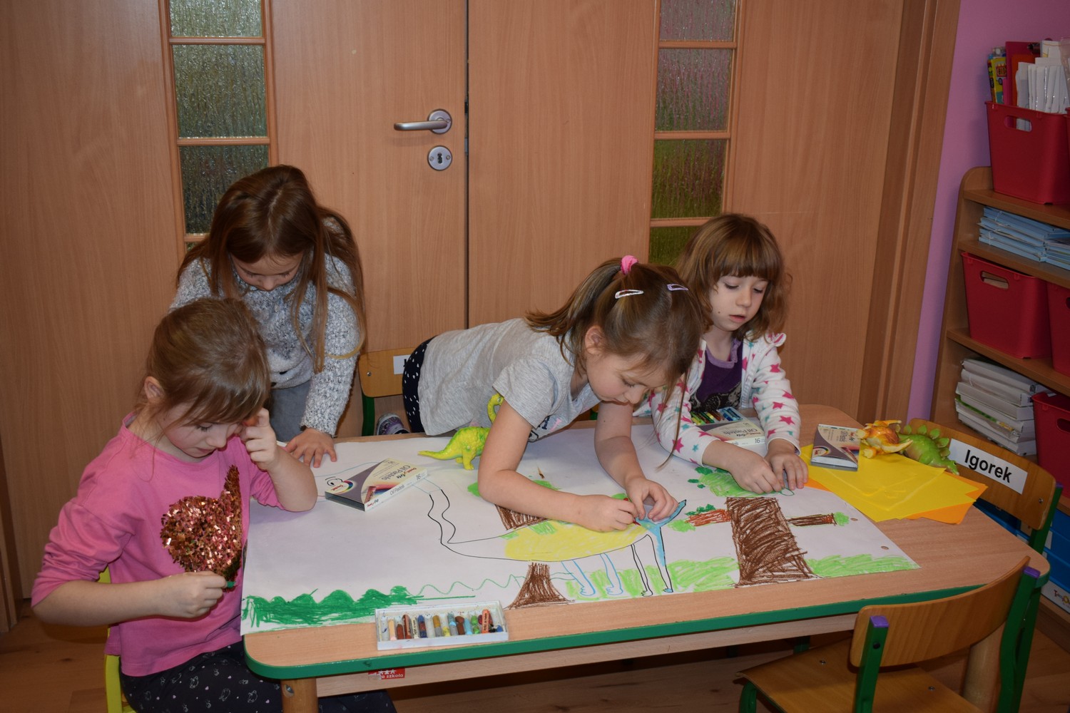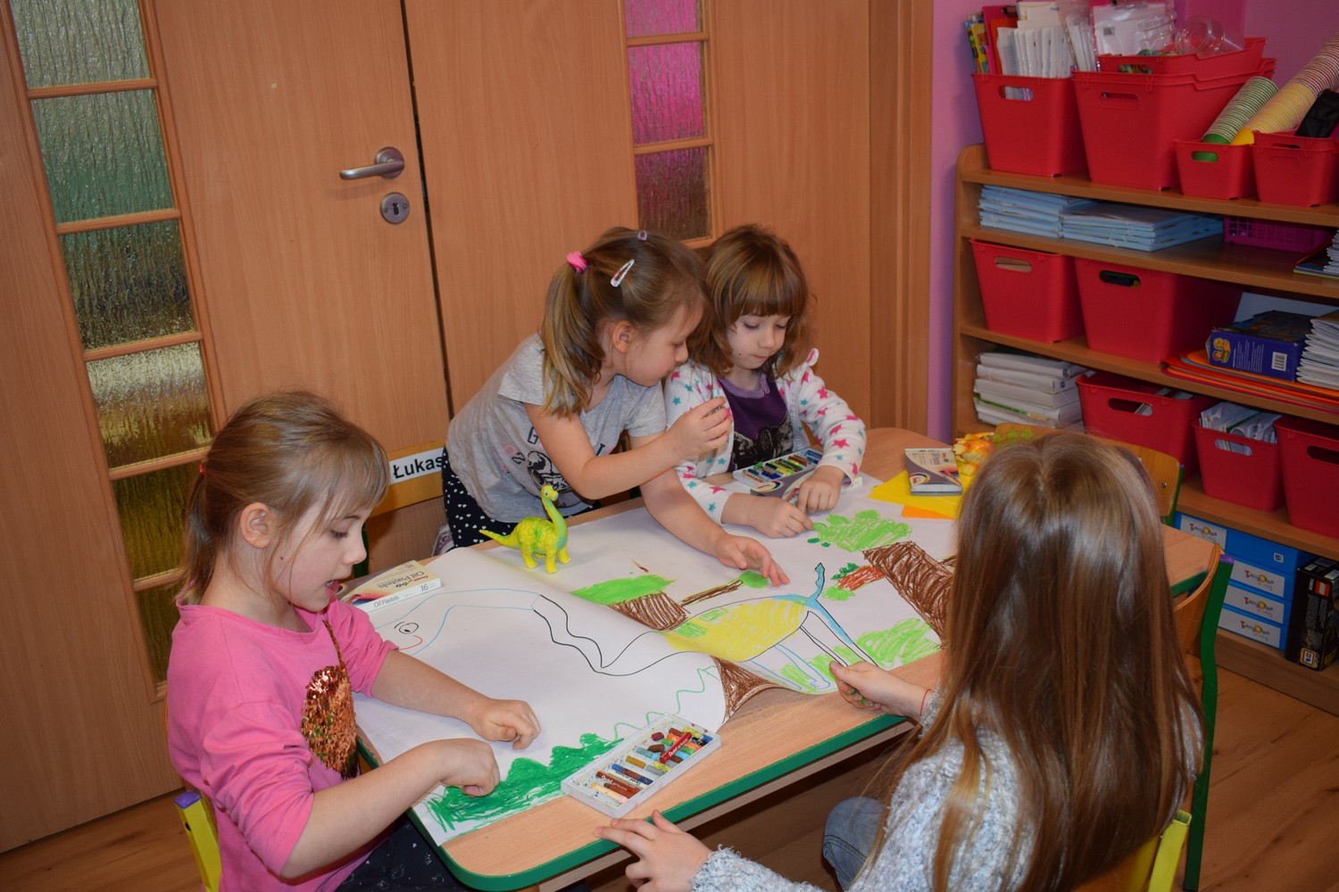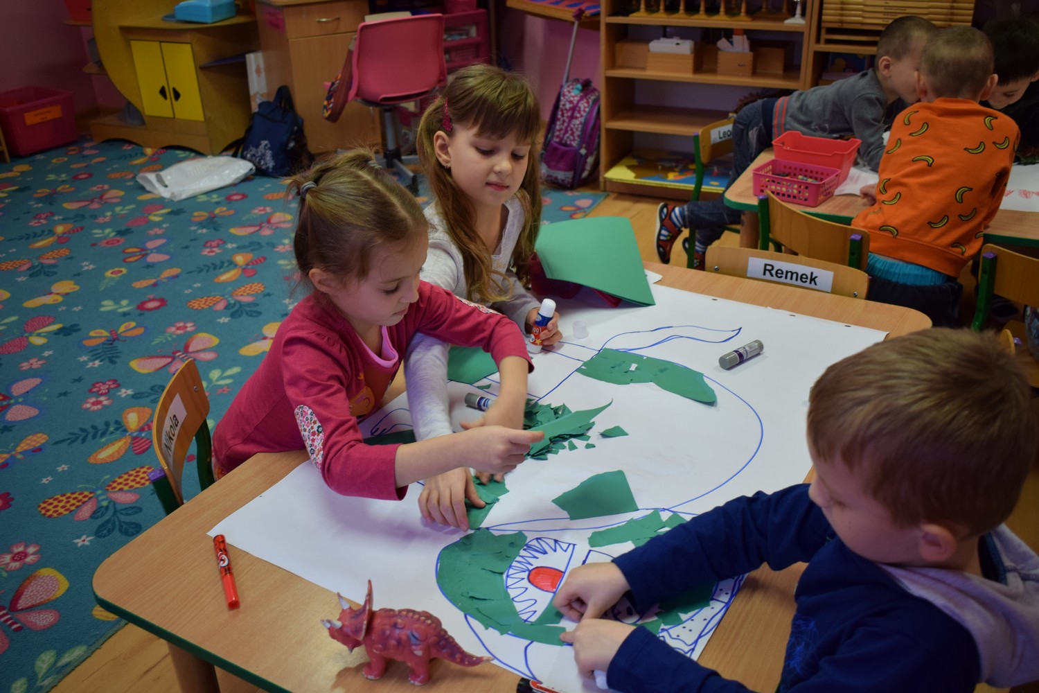 Dzieci z ogrom­nym zaan­ga­żo­wa­niem wykle­jały postaci pre­hi­sto­rycz­nych gadów, współ­pra­cu­jąc ze sobą. Pow­stały piękne gru­powe obrazy, które będą zdo­biły nasz przed­szkolny hol.