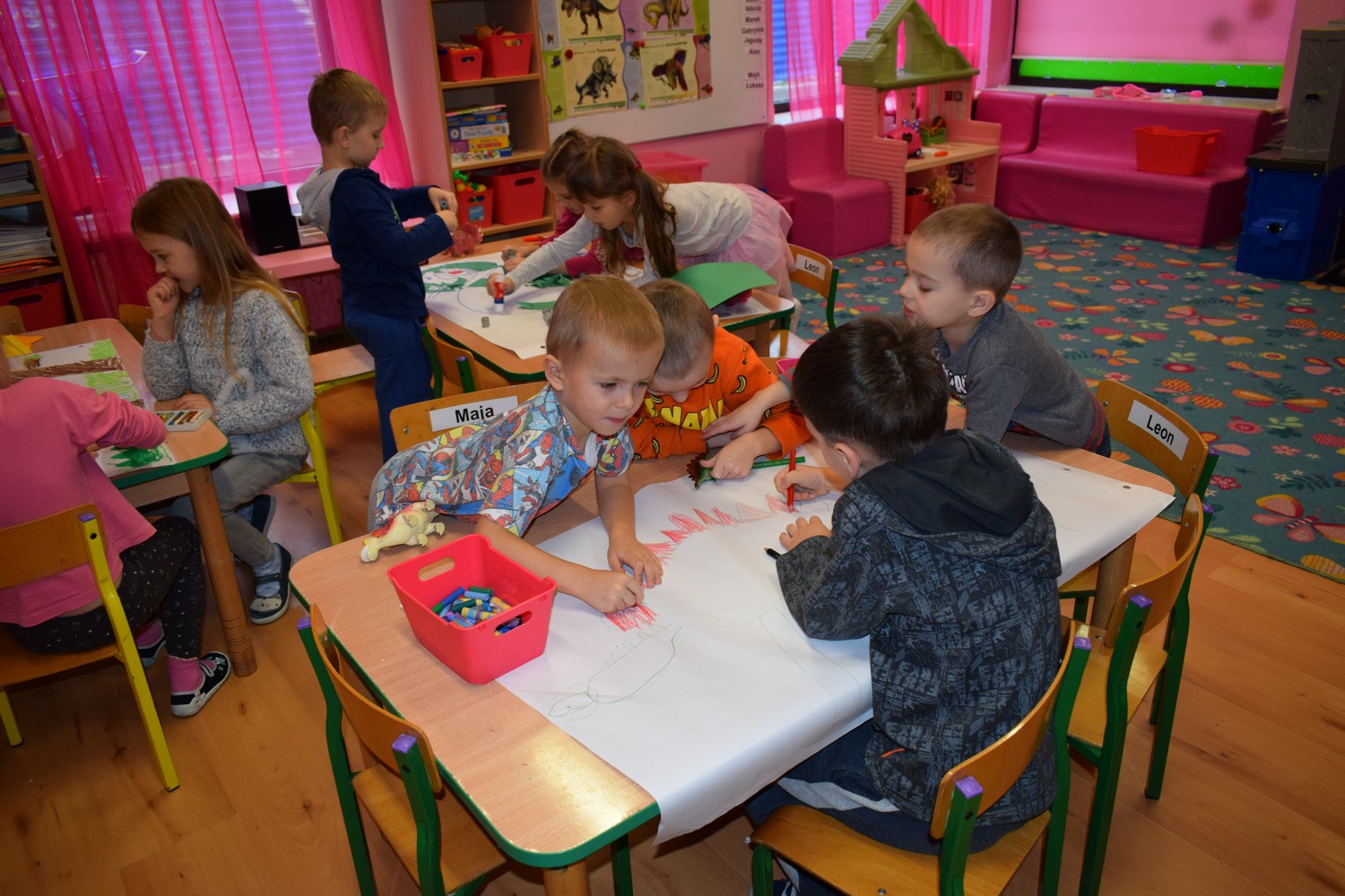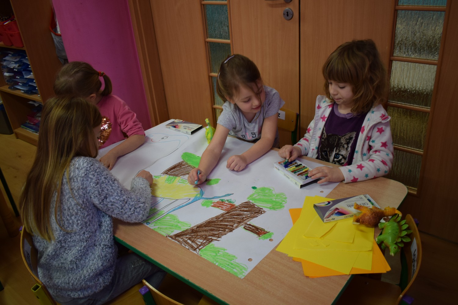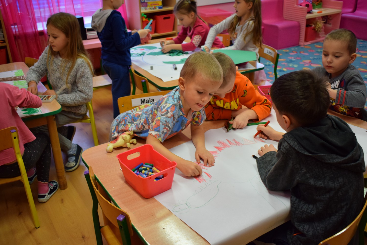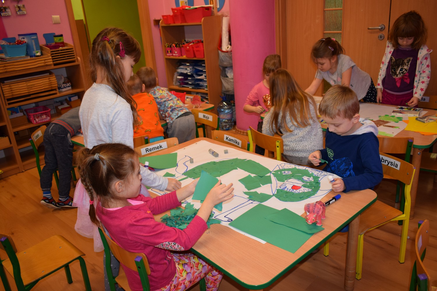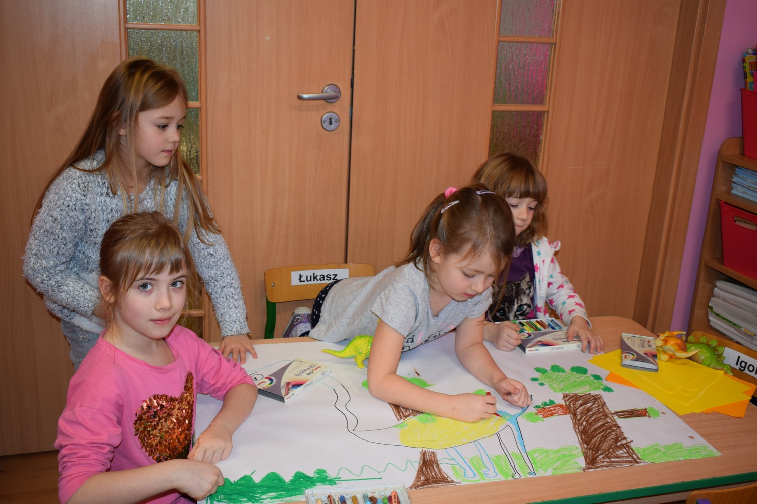 Dzieci z ogrom­nym zaan­ga­żo­wa­niem wykle­jały postaci pre­hi­sto­rycz­nych gadów, współ­pra­cu­jąc ze sobą. Pow­stały piękne gru­powe obrazy, które będą zdo­biły nasz przed­szkolny hol.