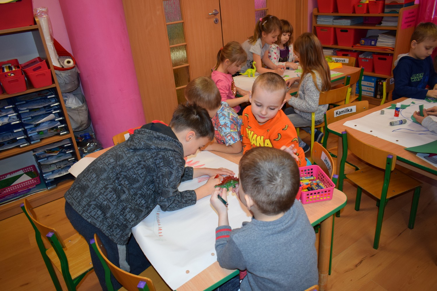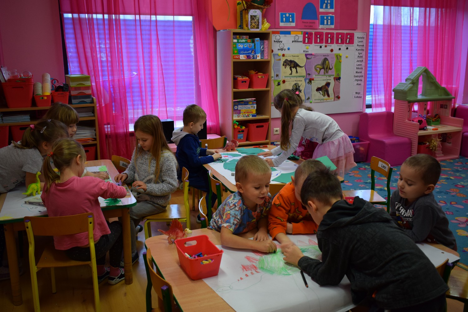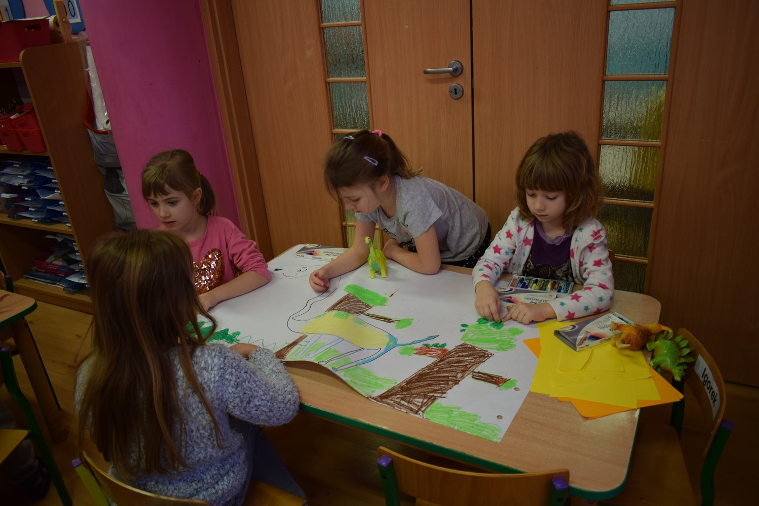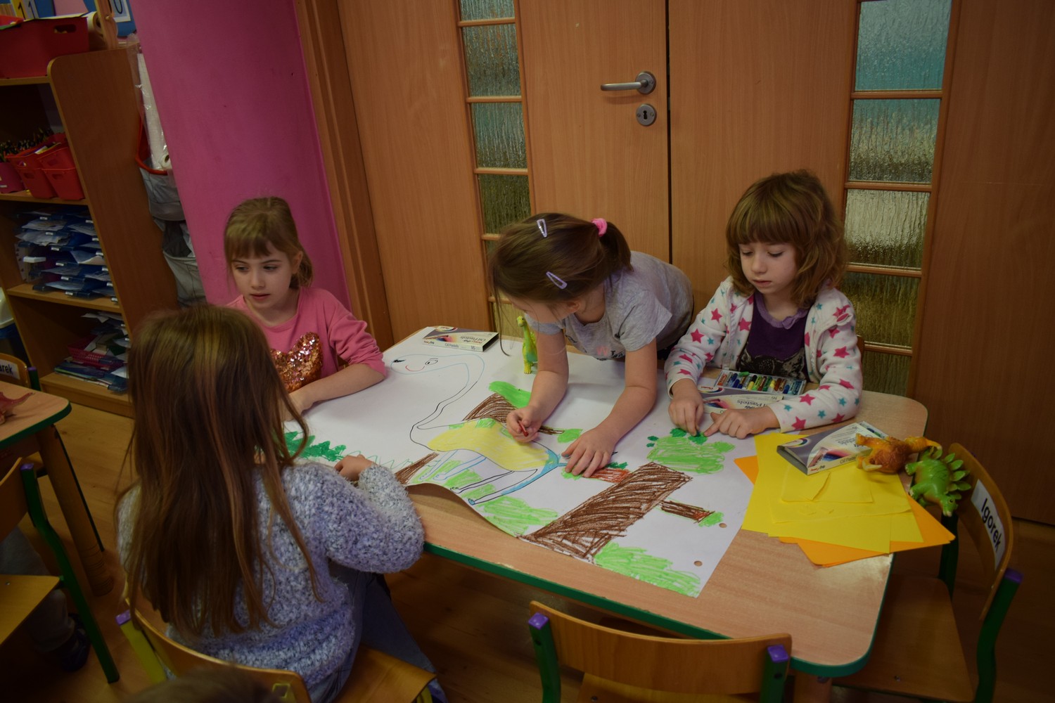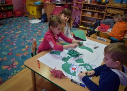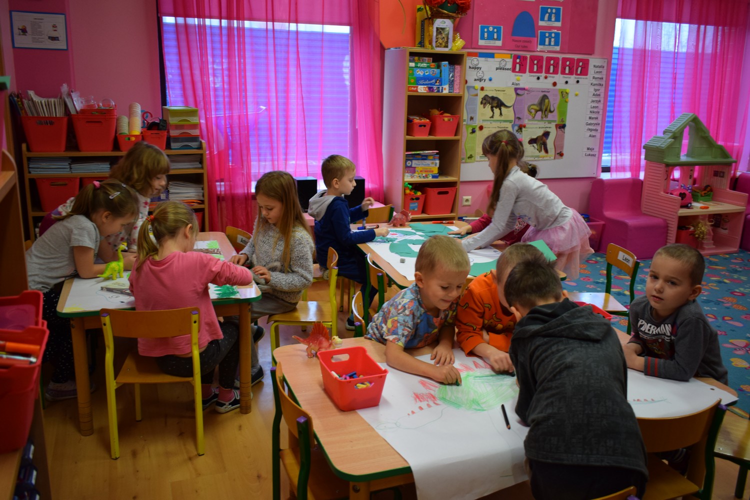 Dzieci z ogrom­nym zaan­ga­żo­wa­niem wykle­jały postaci pre­hi­sto­rycz­nych gadów, współ­pra­cu­jąc ze sobą. Pow­stały piękne gru­powe obrazy, które będą zdo­biły nasz przed­szkolny hol.