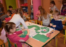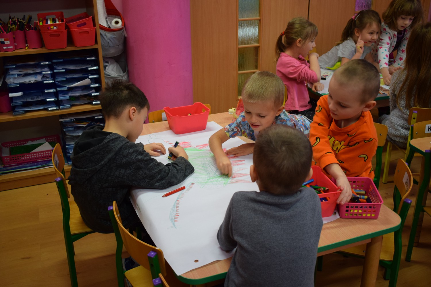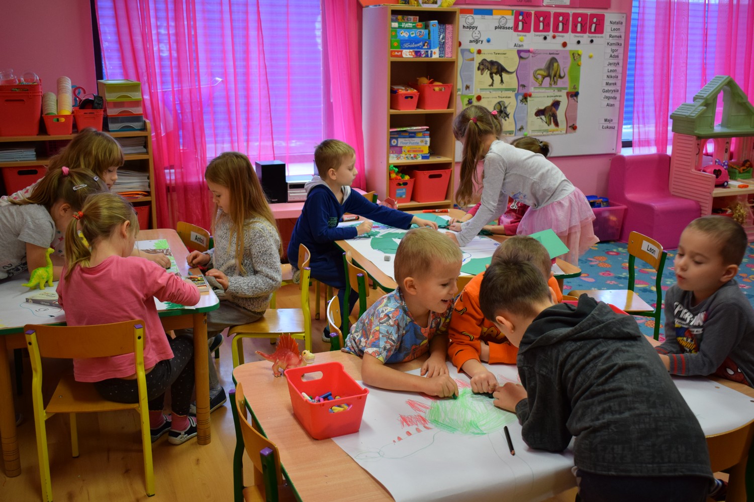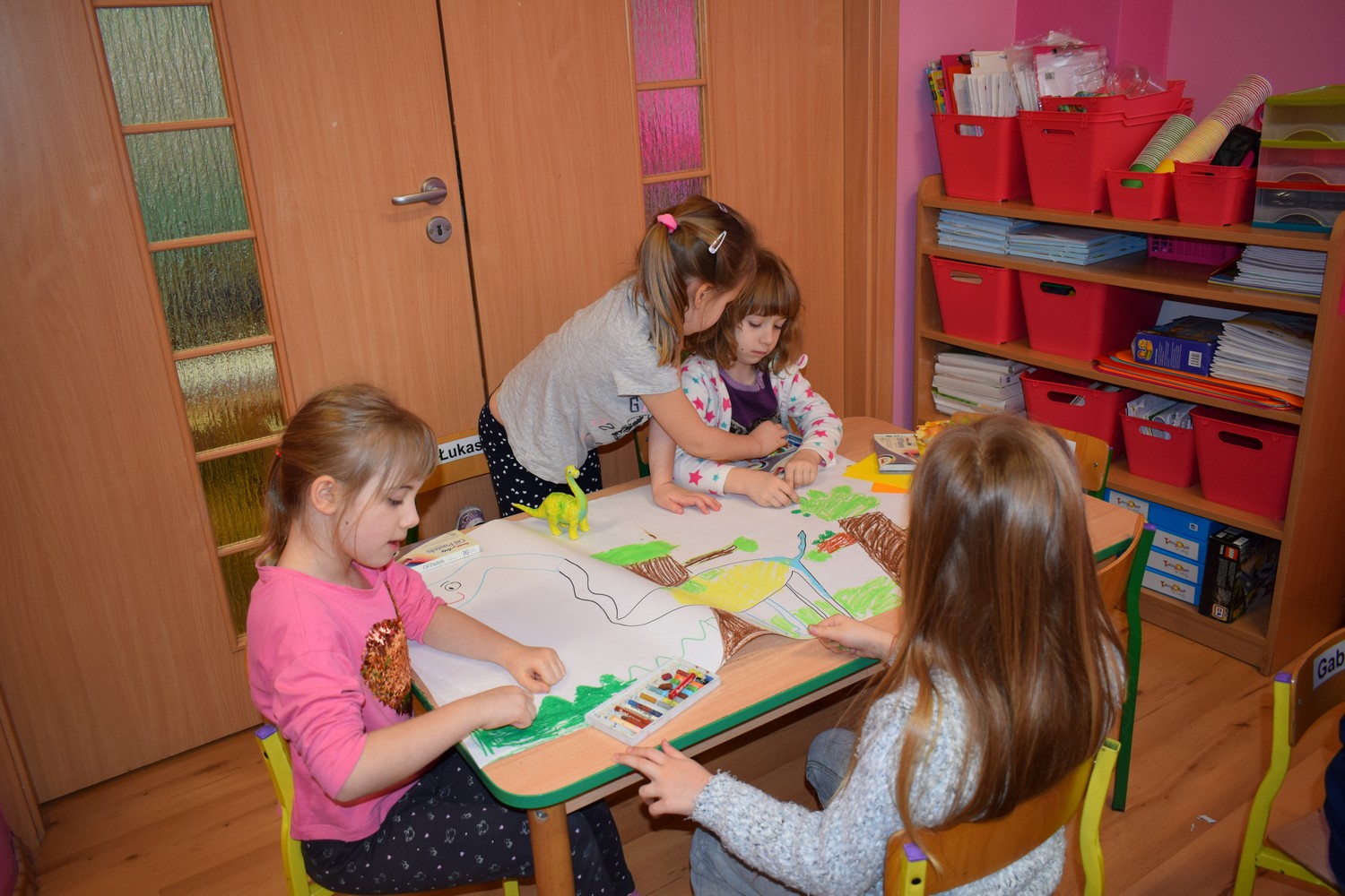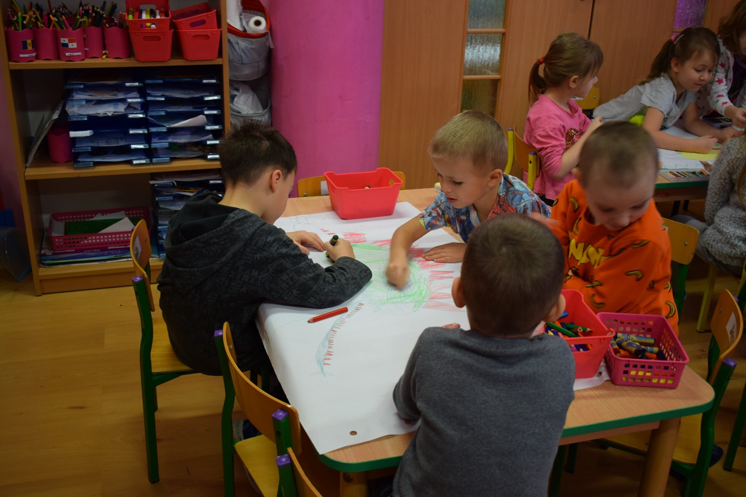 Dzieci z ogrom­nym zaan­ga­żo­wa­niem wykle­jały postaci pre­hi­sto­rycz­nych gadów, współ­pra­cu­jąc ze sobą. Pow­stały piękne gru­powe obrazy, które będą zdo­biły nasz przed­szkolny hol.