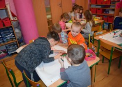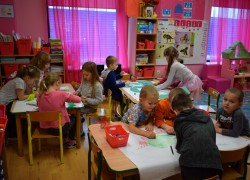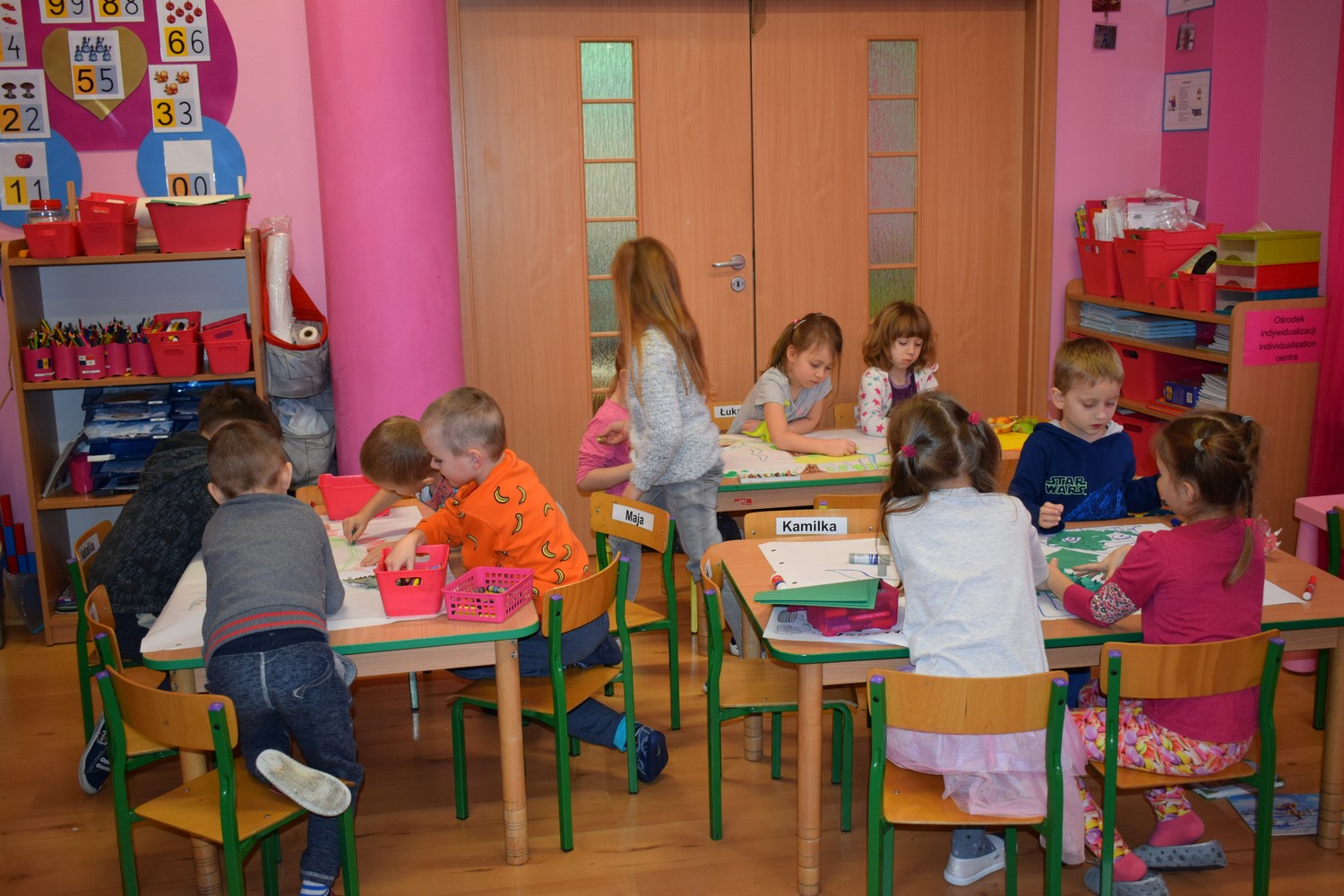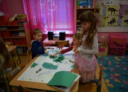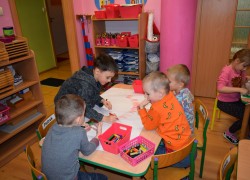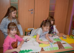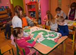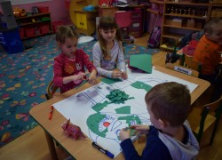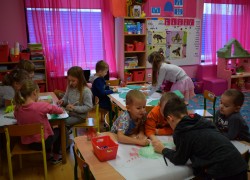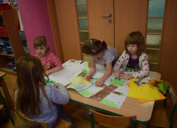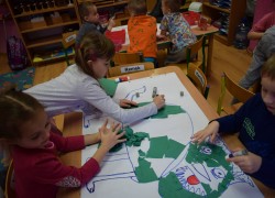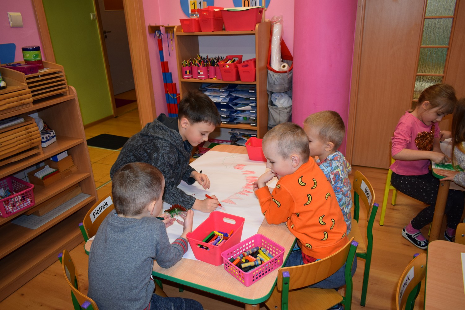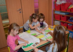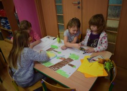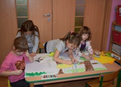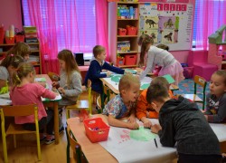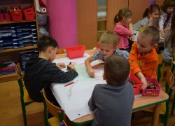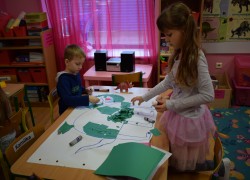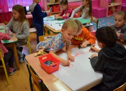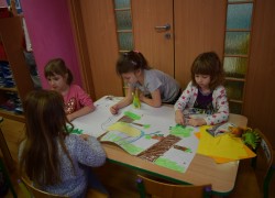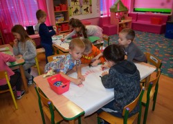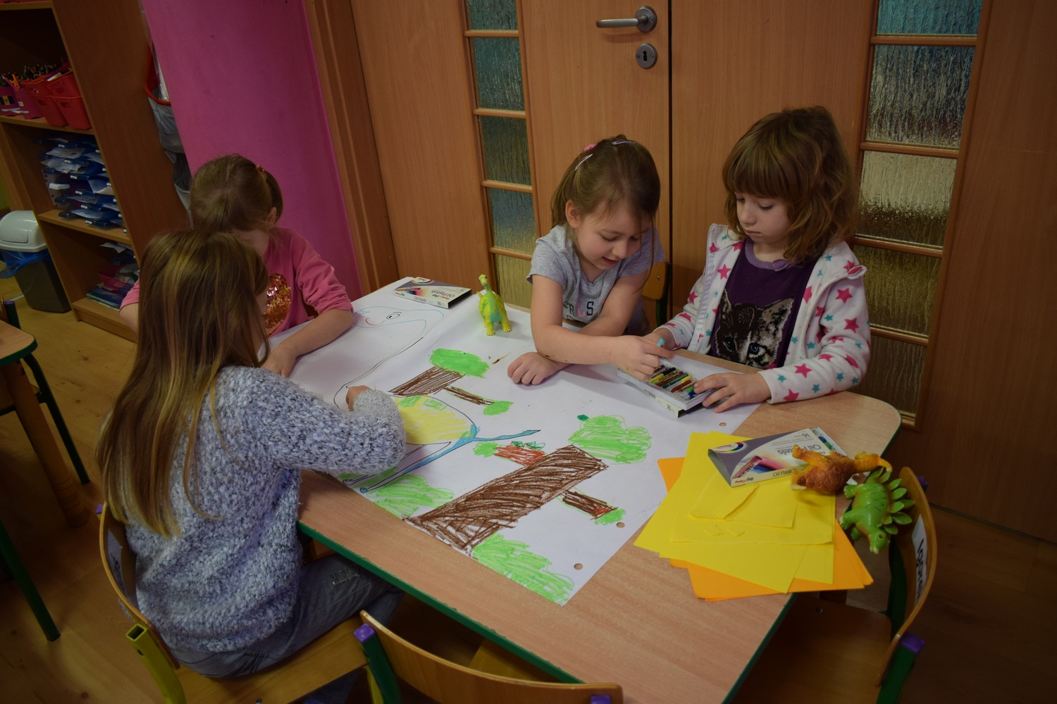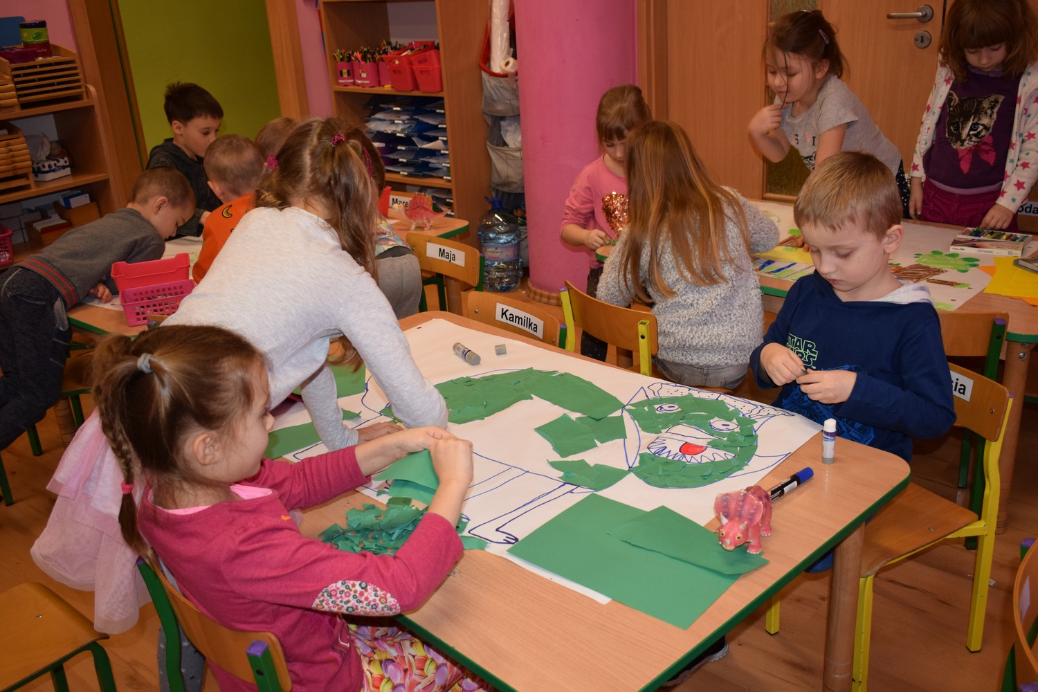 Dzieci z ogrom­nym zaan­ga­żo­wa­niem wykle­jały postaci pre­hi­sto­rycz­nych gadów, współ­pra­cu­jąc ze sobą. Pow­stały piękne gru­powe obrazy, które będą zdo­biły nasz przed­szkolny hol.