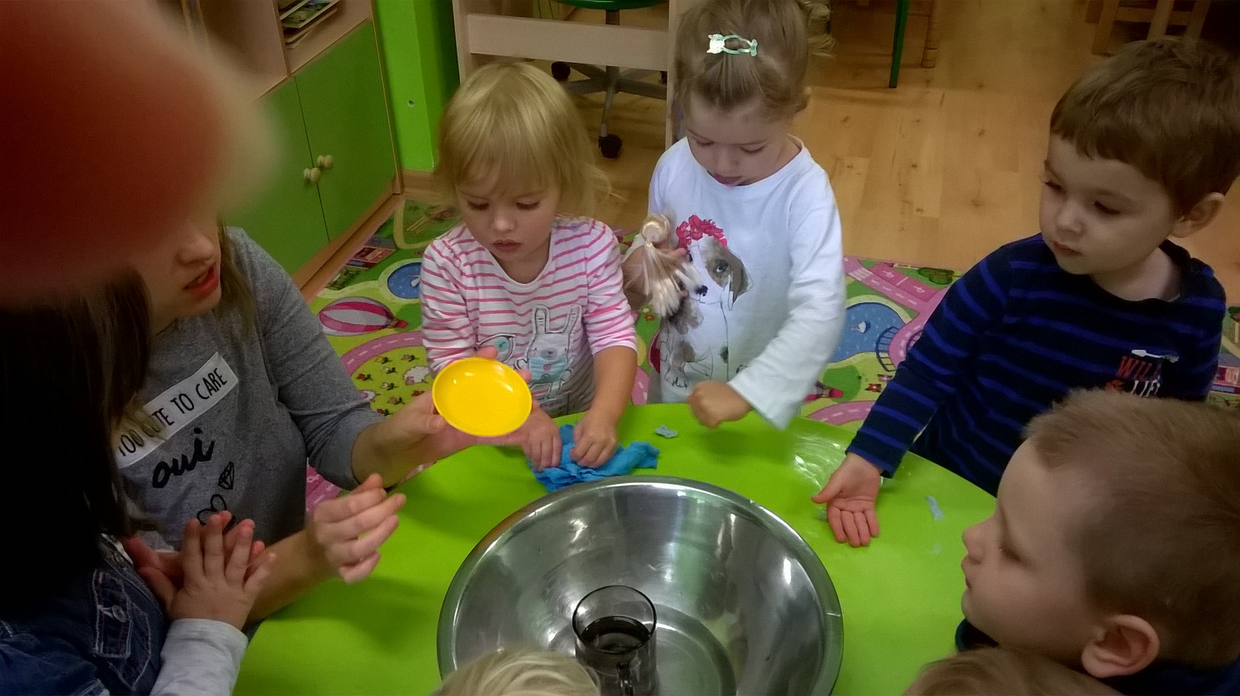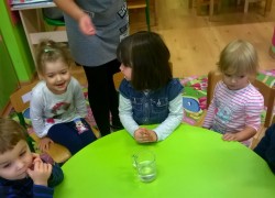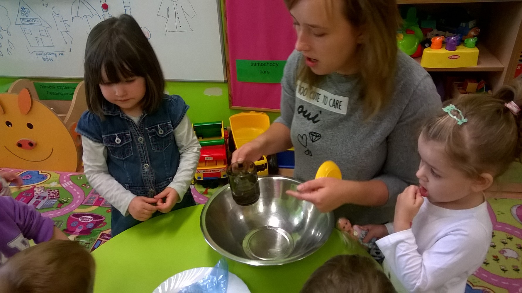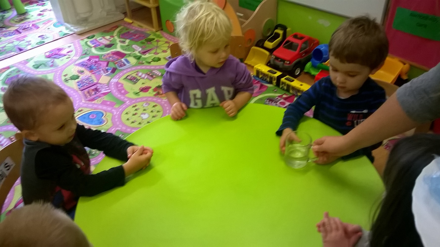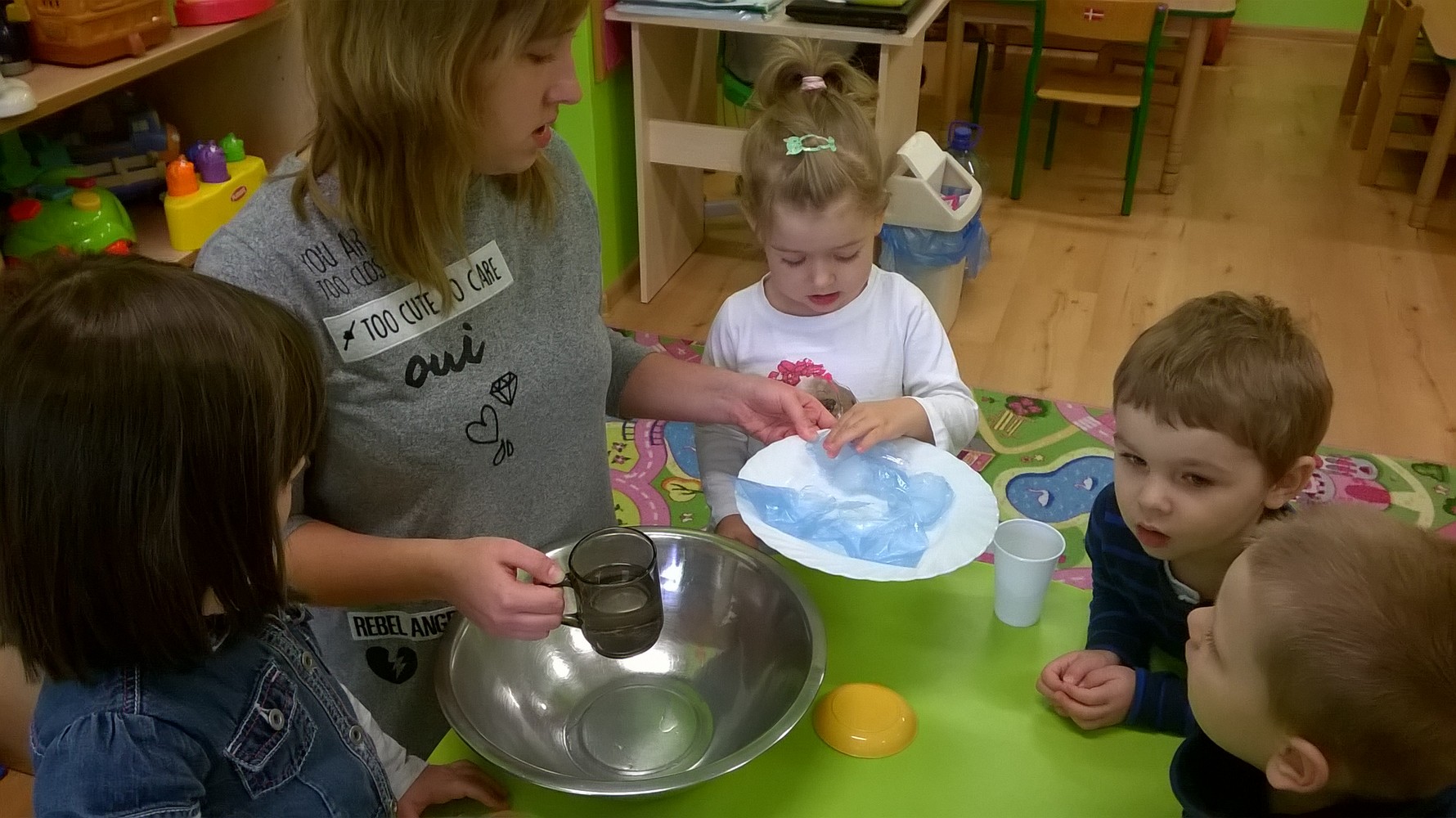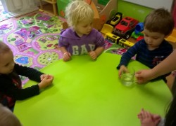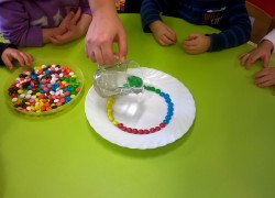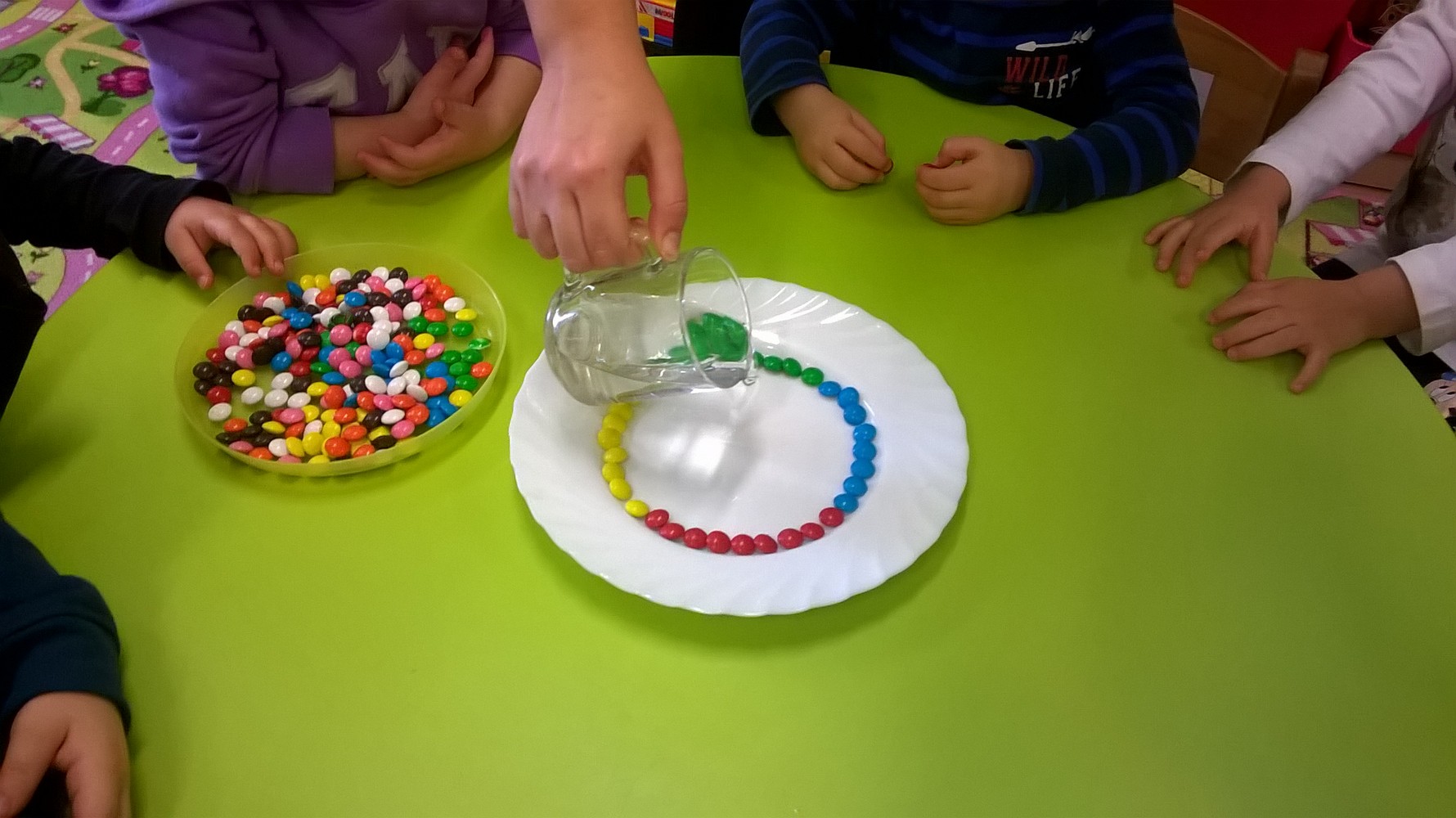 Grupa maluszków w tygodniu poświęconym pogodzie ekperymentowała z lodem, gorącą wodą i kolorowymi cukierkami. Dowiedziały się jak powstaje deszcz i w jaki sposób można zrobić tęczę w domowych warunkach. Już teraz wiedzą że jest bardzo dużo barwników w cukierkach i nie warto jeść ich tak dużo. Przy okazji powtórzyliśmy kolory i wspólnie je klasyfikowaliśmy dla lepszego efektu naszej pracy.