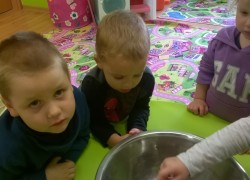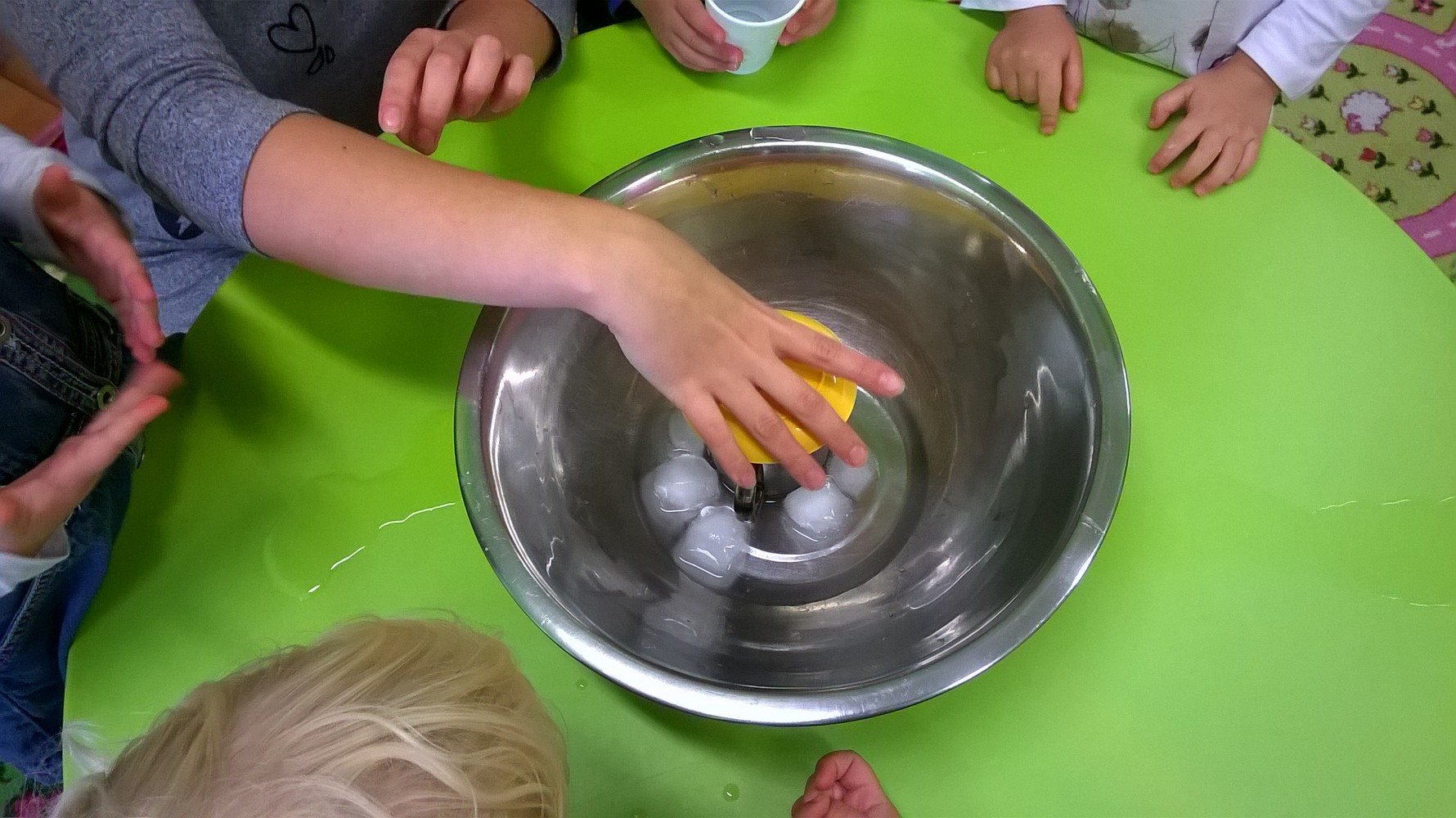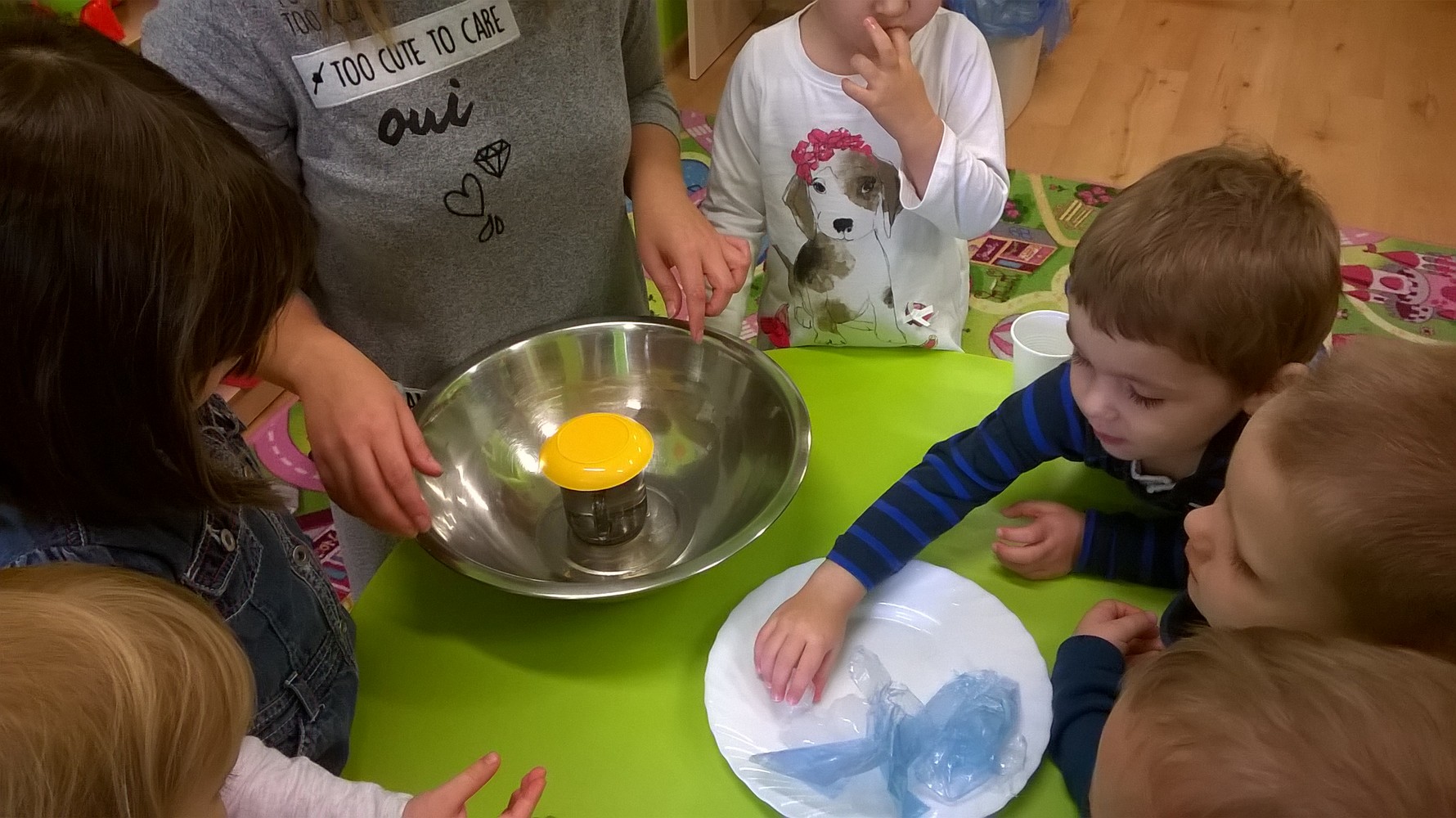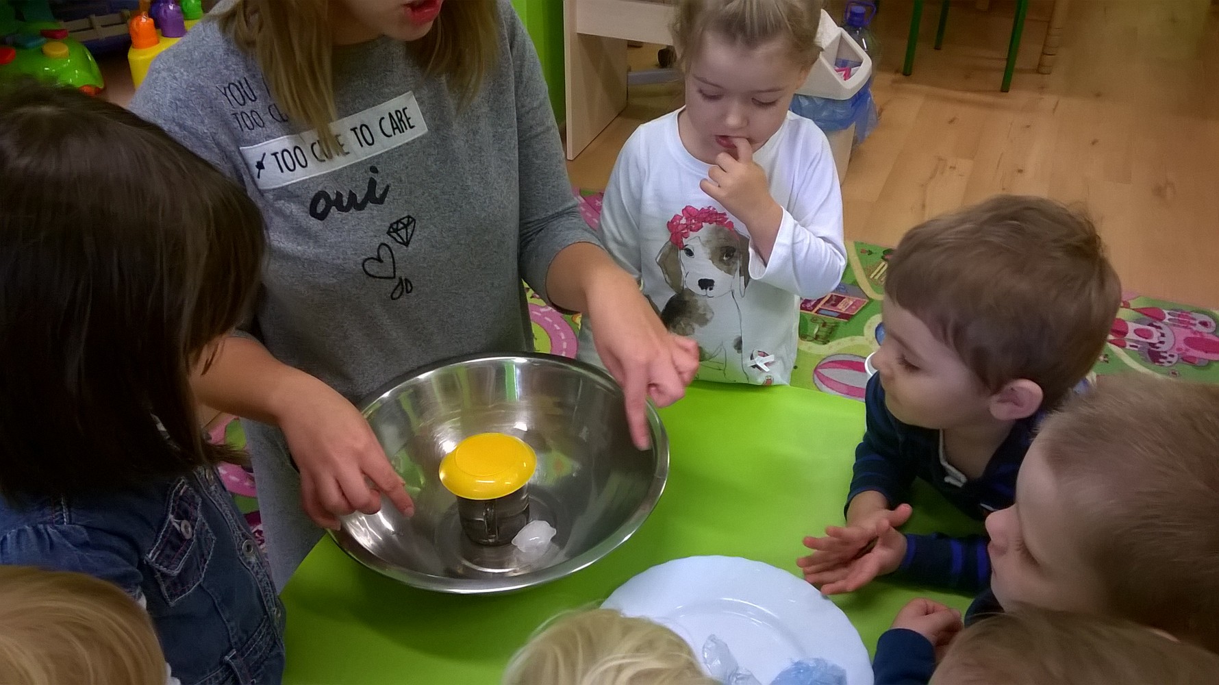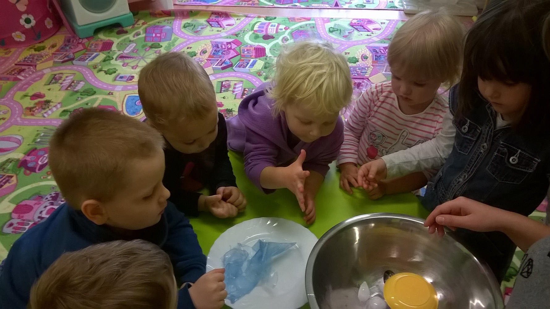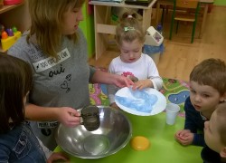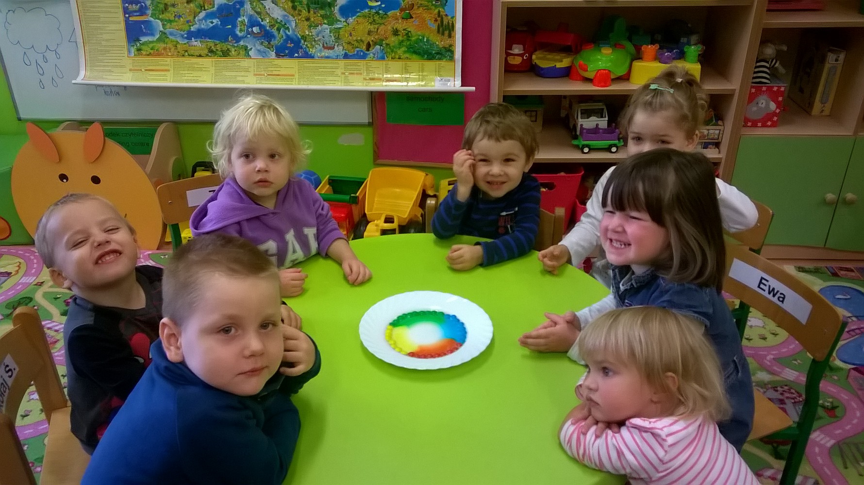 Grupa maluszków w tygodniu poświęconym pogodzie ekperymentowała z lodem, gorącą wodą i kolorowymi cukierkami. Dowiedziały się jak powstaje deszcz i w jaki sposób można zrobić tęczę w domowych warunkach. Już teraz wiedzą że jest bardzo dużo barwników w cukierkach i nie warto jeść ich tak dużo. Przy okazji powtórzyliśmy kolory i wspólnie je klasyfikowaliśmy dla lepszego efektu naszej pracy.
