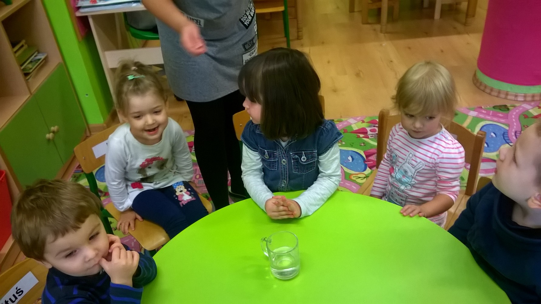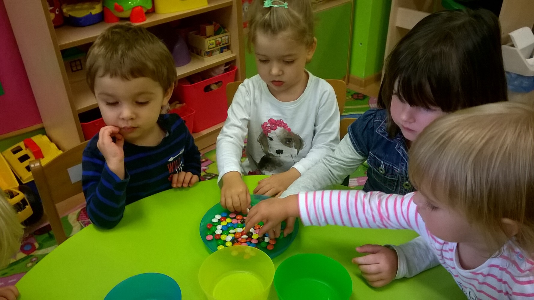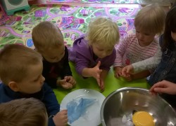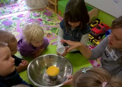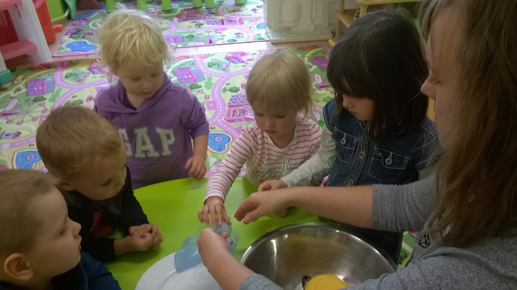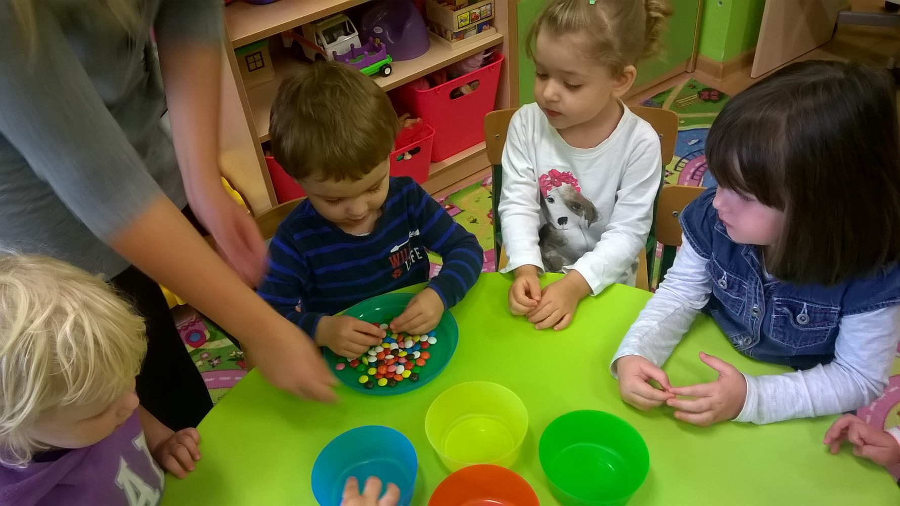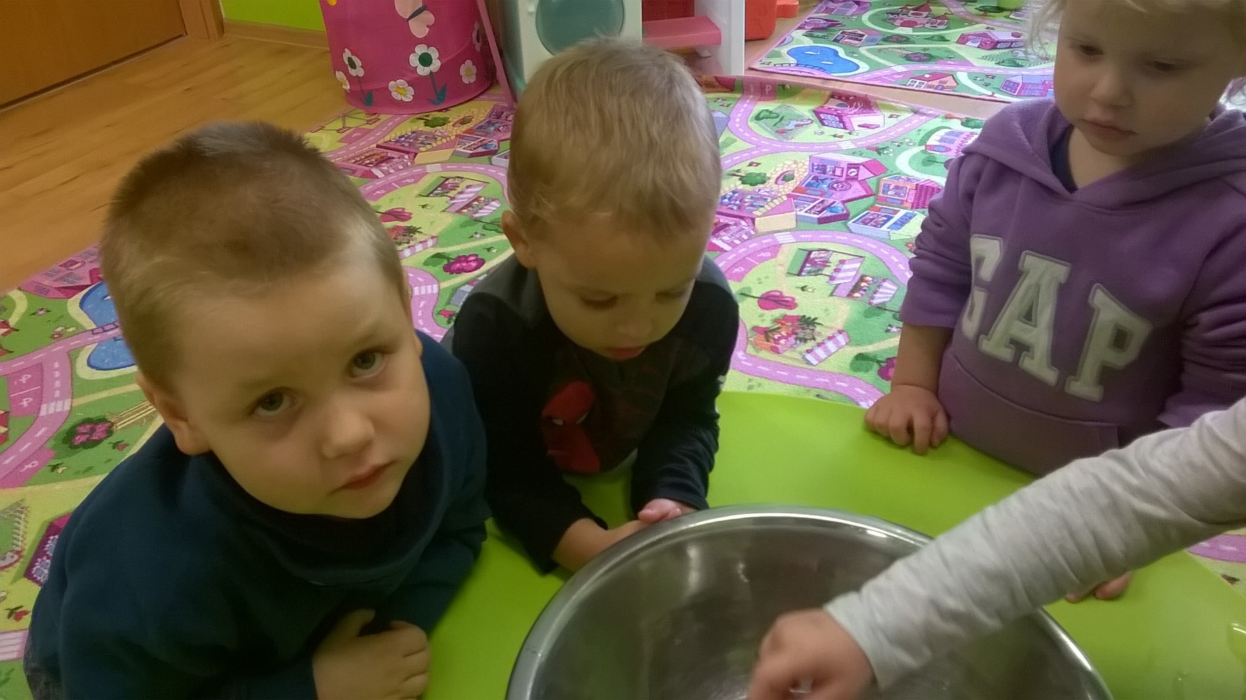 Grupa maluszków w tygodniu poświęconym pogodzie ekperymentowała z lodem, gorącą wodą i kolorowymi cukierkami. Dowiedziały się jak powstaje deszcz i w jaki sposób można zrobić tęczę w domowych warunkach. Już teraz wiedzą że jest bardzo dużo barwników w cukierkach i nie warto jeść ich tak dużo. Przy okazji powtórzyliśmy kolory i wspólnie je klasyfikowaliśmy dla lepszego efektu naszej pracy.