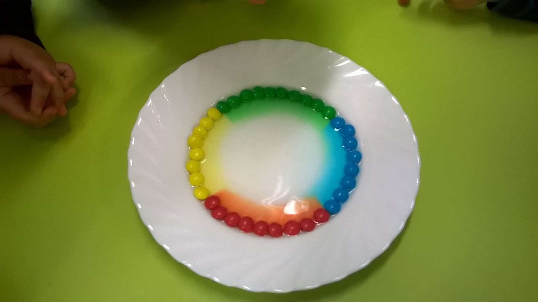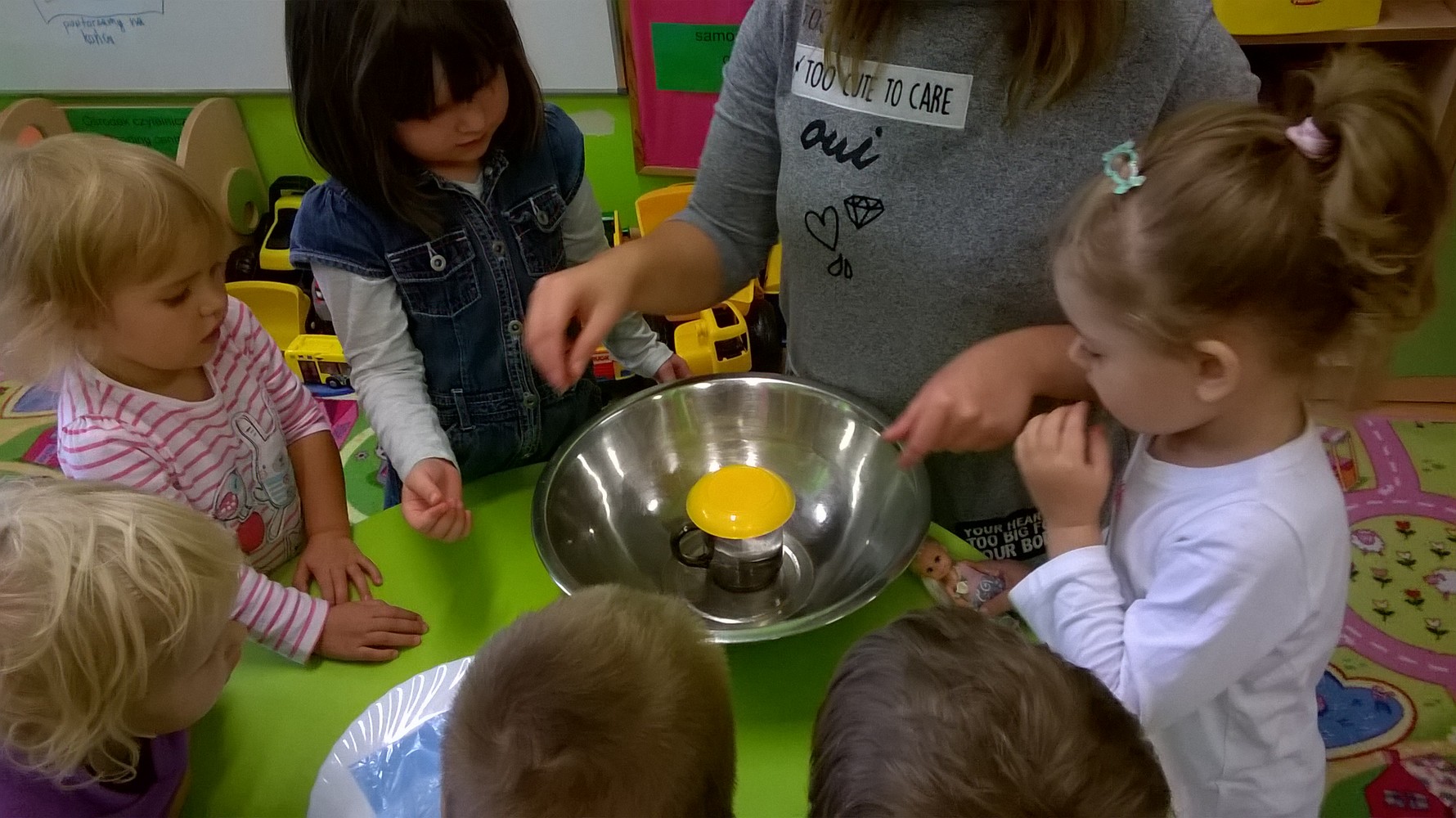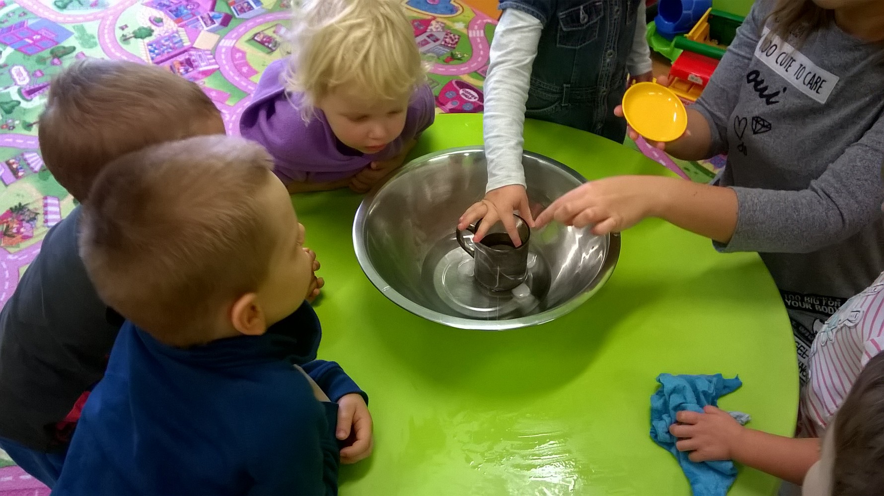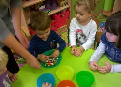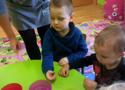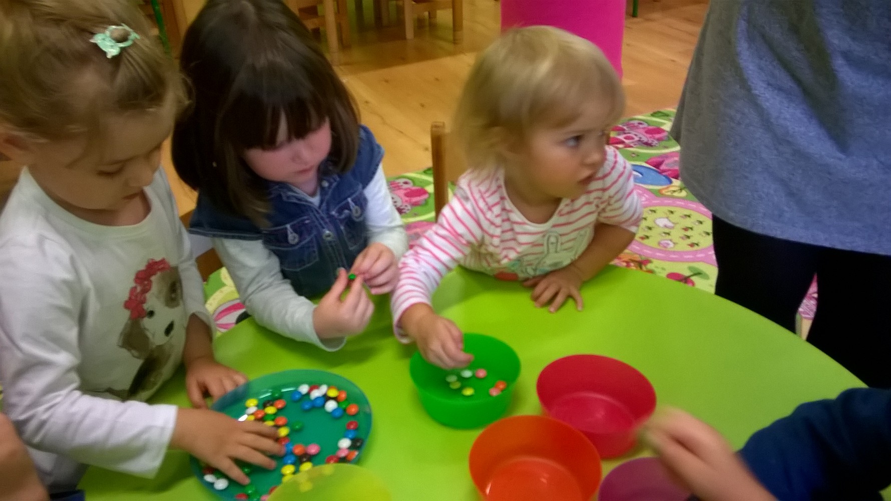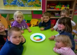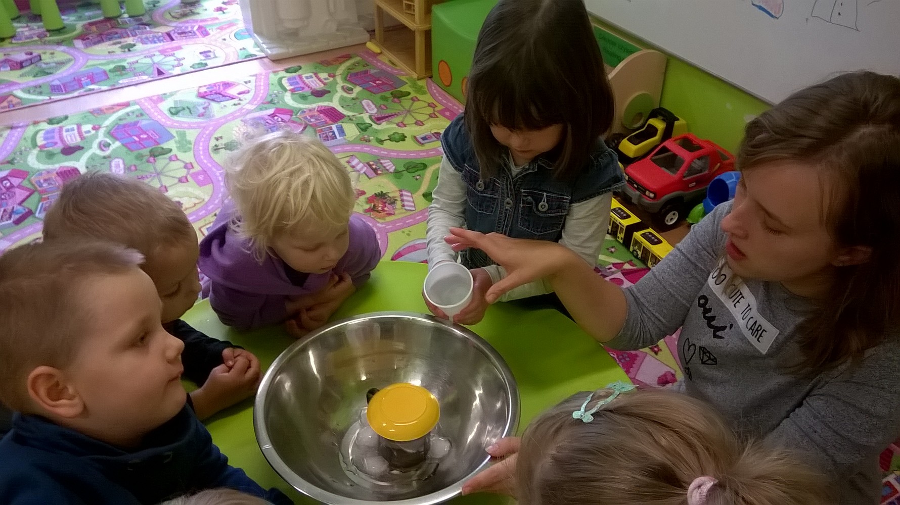 Grupa maluszków w tygodniu poświęconym pogodzie ekperymentowała z lodem, gorącą wodą i kolorowymi cukierkami. Dowiedziały się jak powstaje deszcz i w jaki sposób można zrobić tęczę w domowych warunkach. Już teraz wiedzą że jest bardzo dużo barwników w cukierkach i nie warto jeść ich tak dużo. Przy okazji powtórzyliśmy kolory i wspólnie je klasyfikowaliśmy dla lepszego efektu naszej pracy.