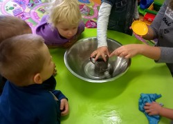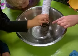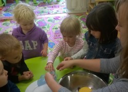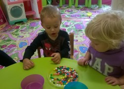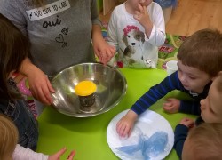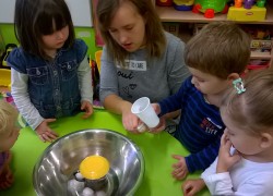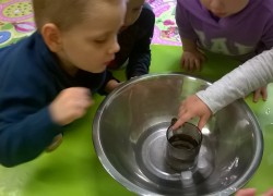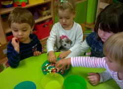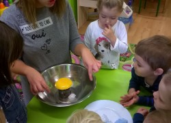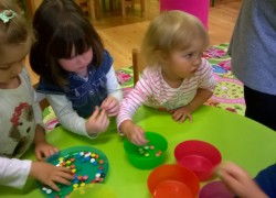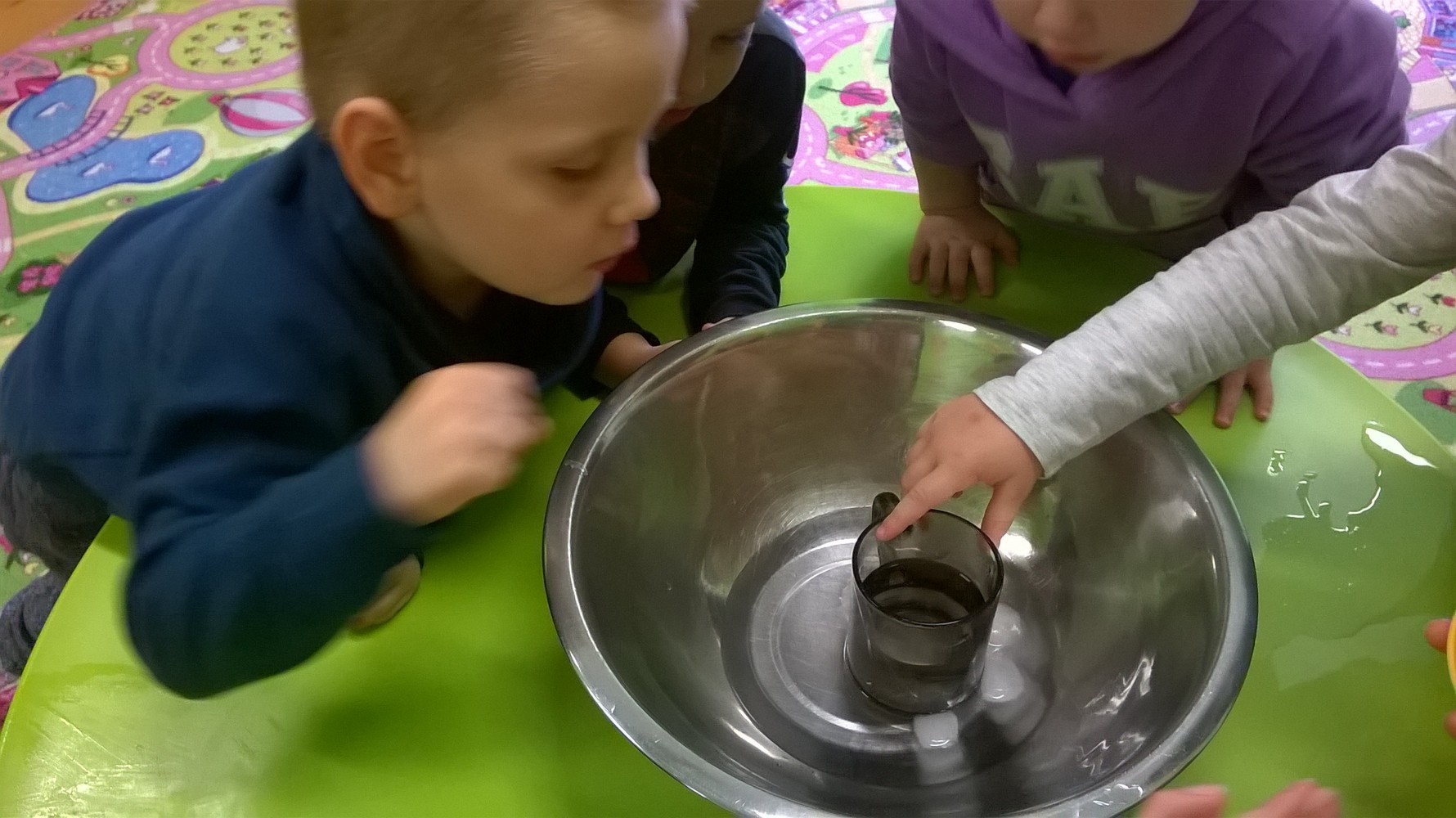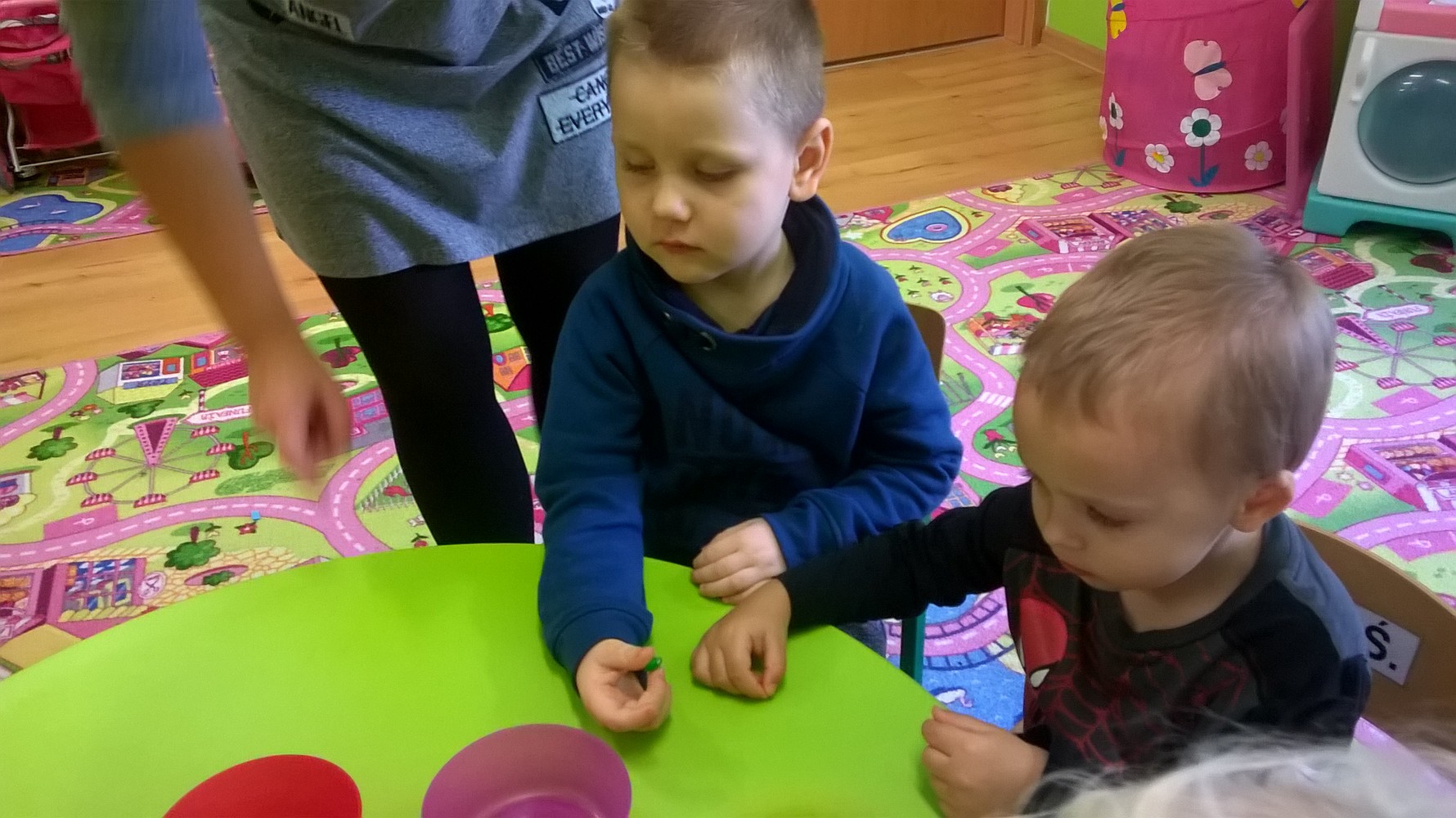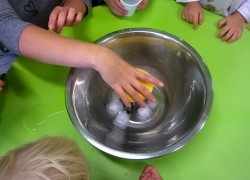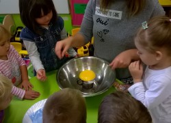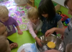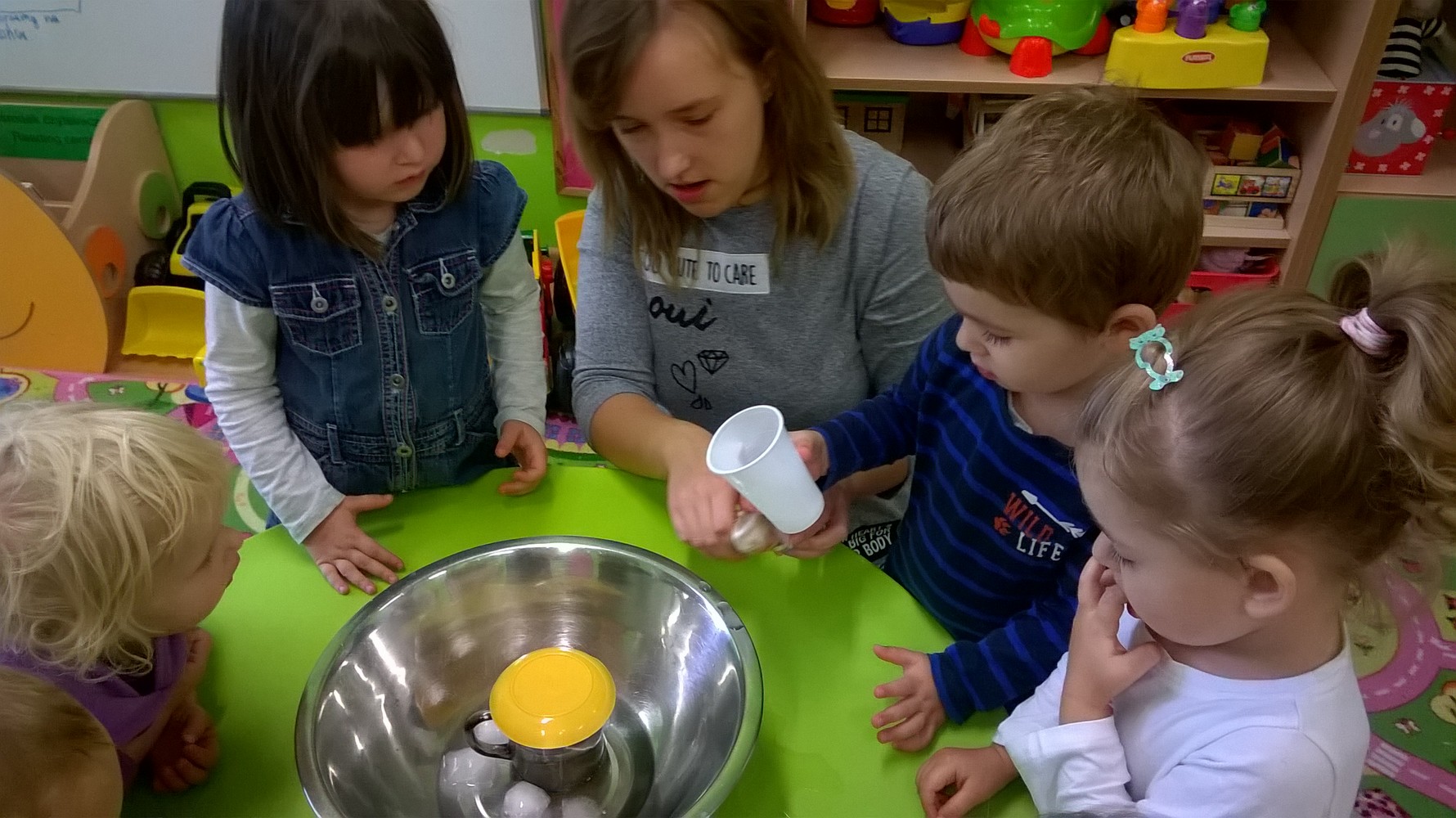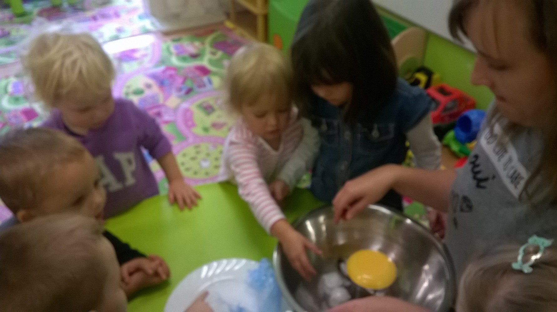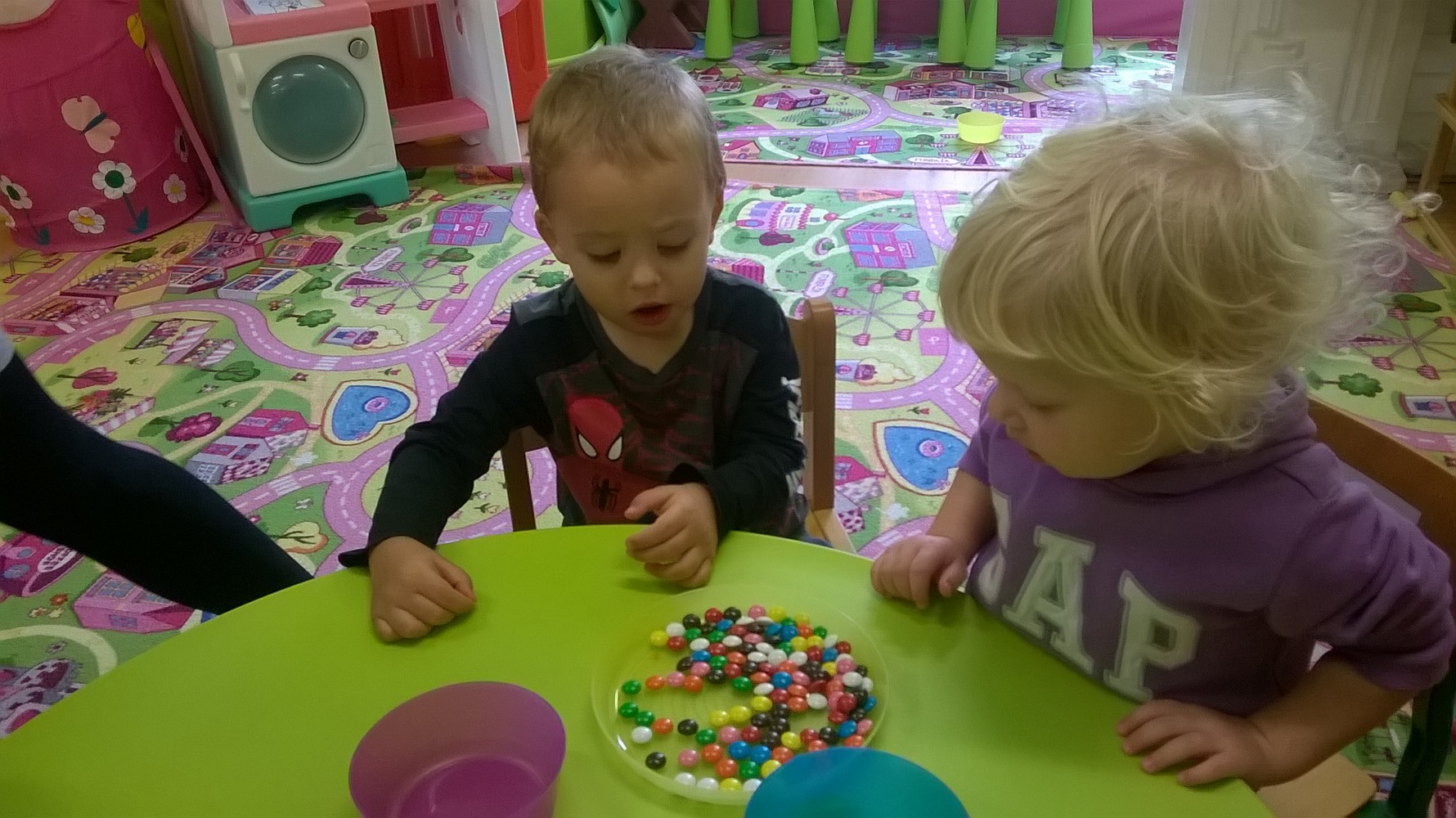 Grupa maluszków w tygodniu poświęconym pogodzie ekperymentowała z lodem, gorącą wodą i kolorowymi cukierkami. Dowiedziały się jak powstaje deszcz i w jaki sposób można zrobić tęczę w domowych warunkach. Już teraz wiedzą że jest bardzo dużo barwników w cukierkach i nie warto jeść ich tak dużo. Przy okazji powtórzyliśmy kolory i wspólnie je klasyfikowaliśmy dla lepszego efektu naszej pracy.
