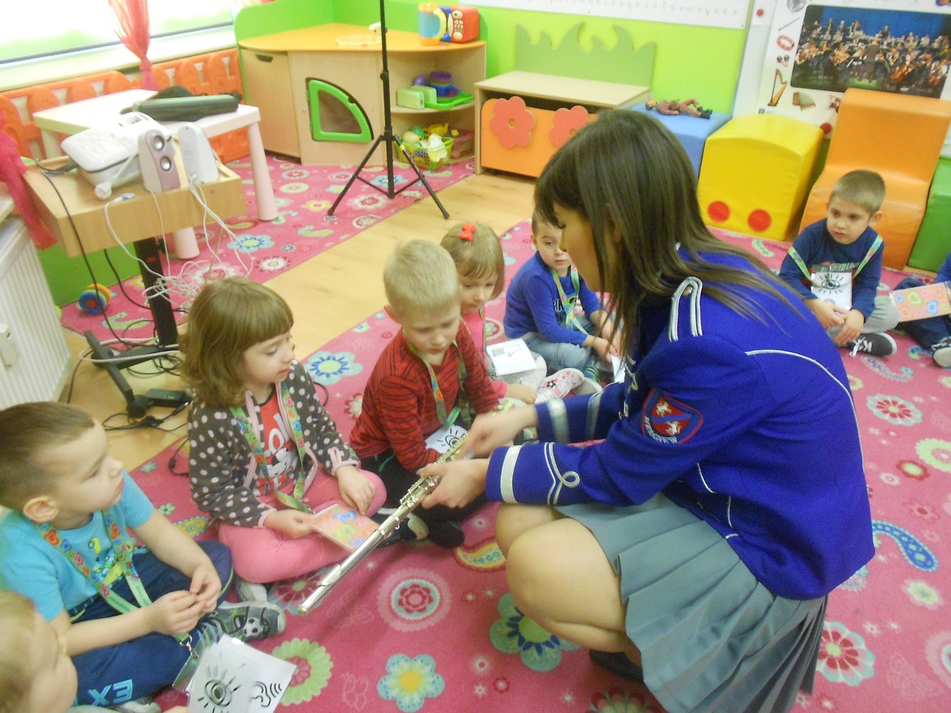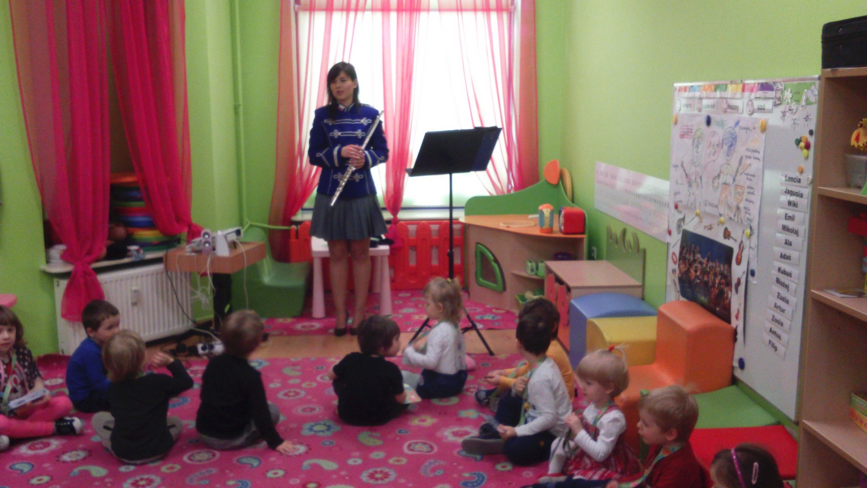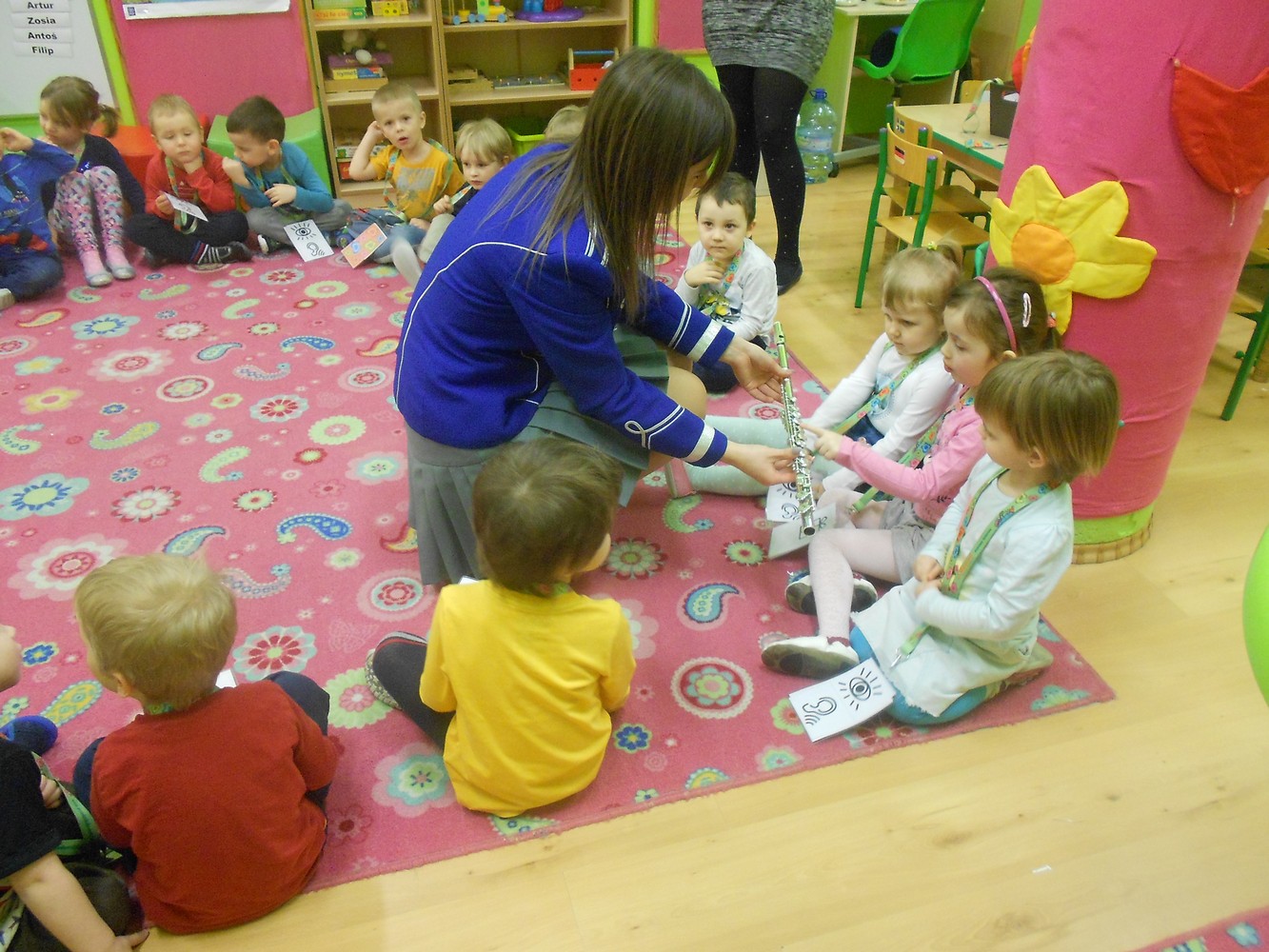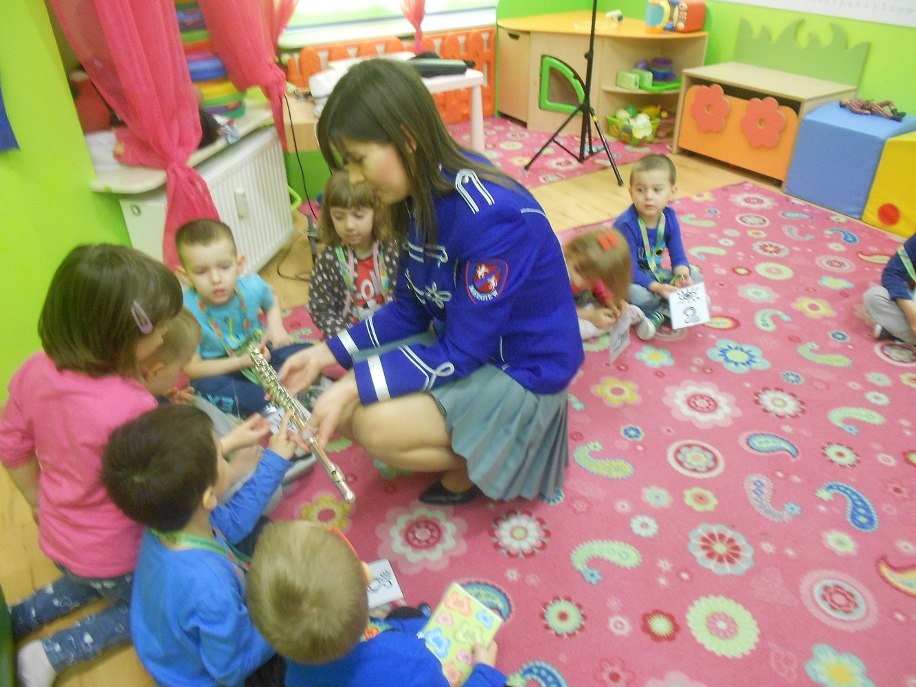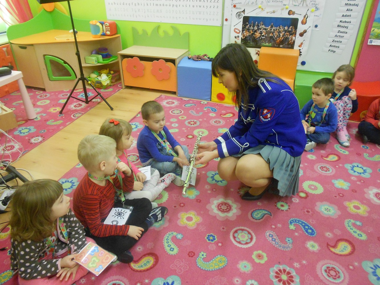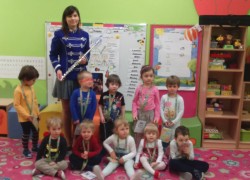 W związku z realizacją tematu tygodnia „Muzyka i sztuka” dzieci z grupy III i II spotkały się z ekspertem od muzyki. Pani Dagmara, która gra w orkiestrze, zapoznała dzieci z budową fletu poprzecznego, jego wyglądem, dźwiękami i zagrała dzieciom kilka utworów muzycznych na tym instrumencie.