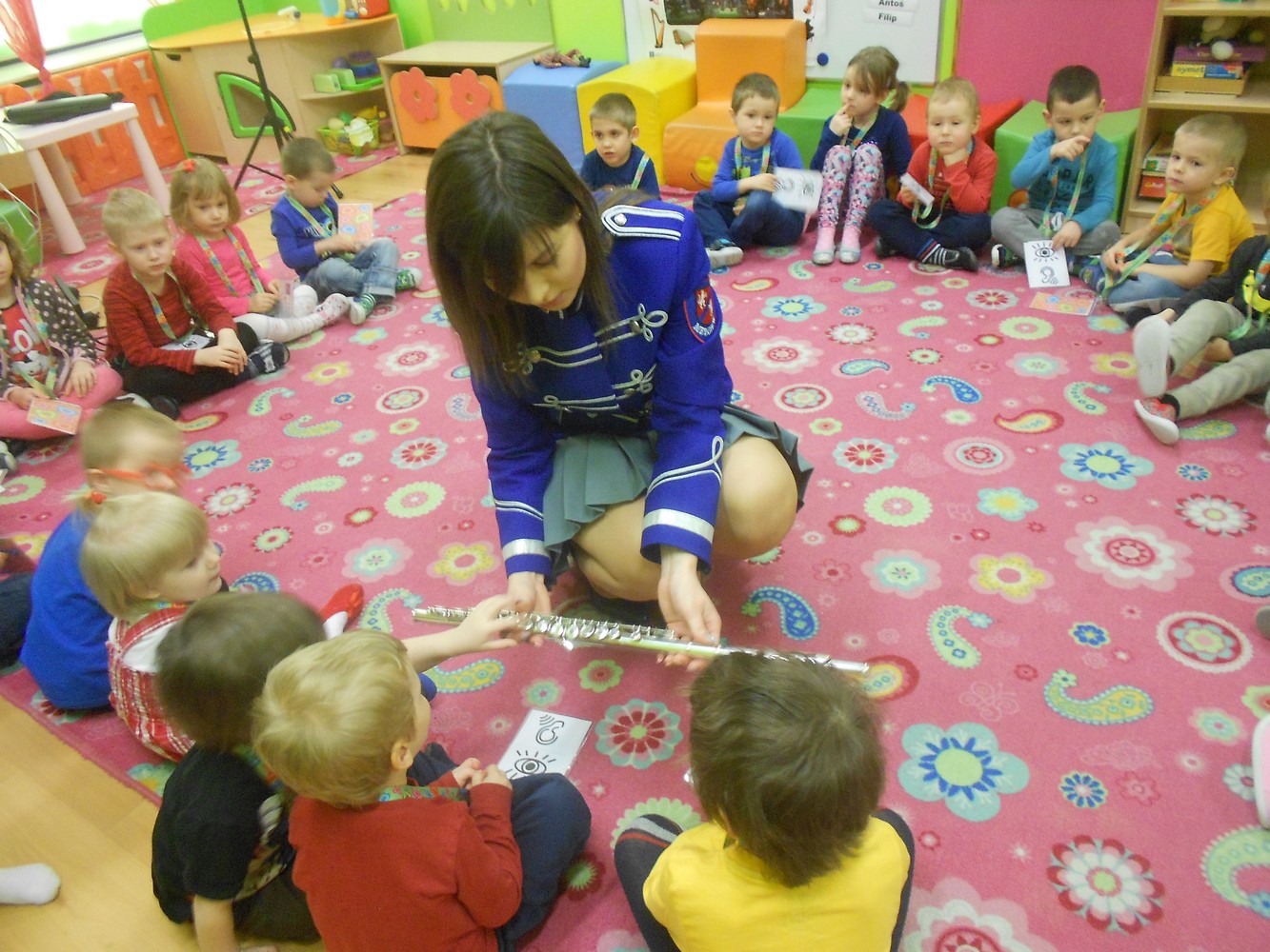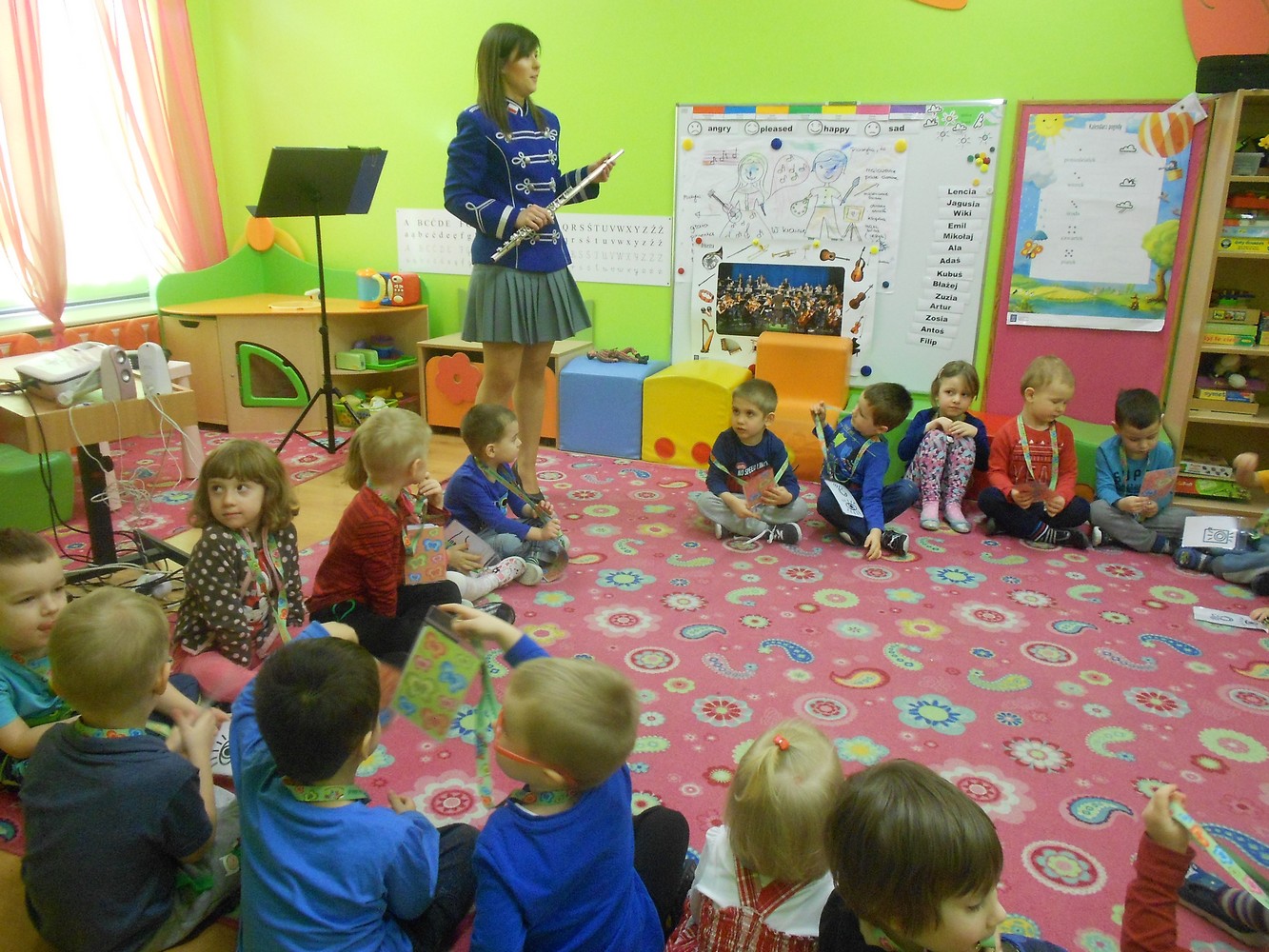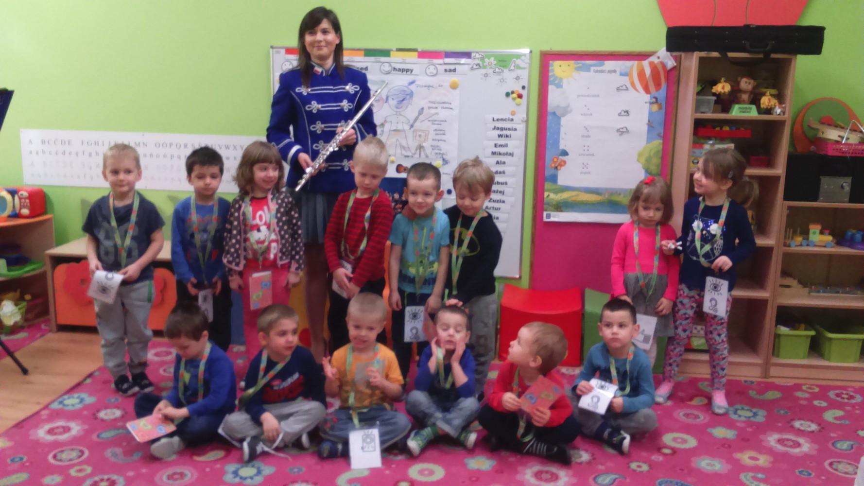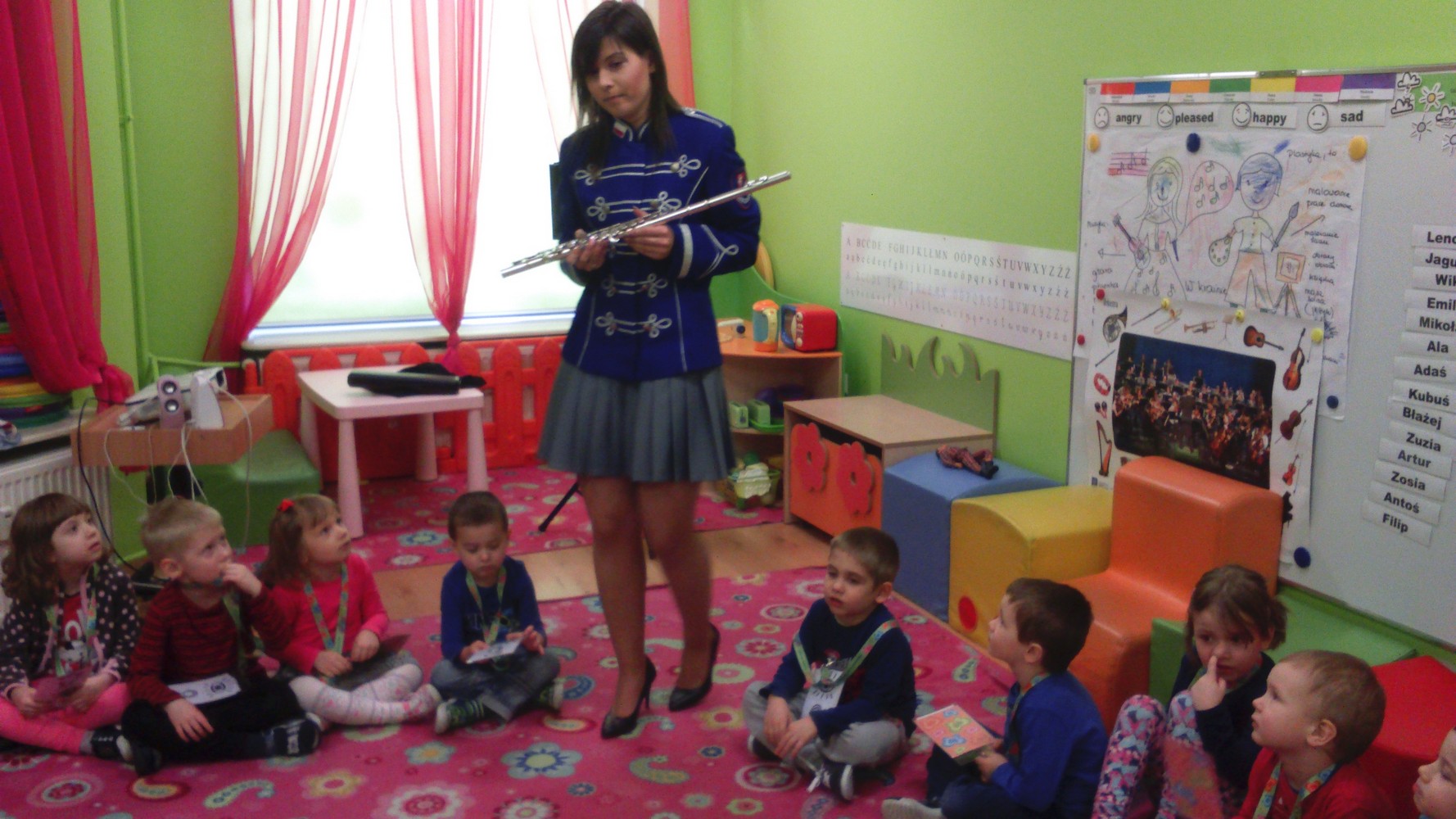 W związku z realizacją tematu tygodnia „Muzyka i sztuka” dzieci z grupy III i II spotkały się z ekspertem od muzyki. Pani Dagmara, która gra w orkiestrze, zapoznała dzieci z budową fletu poprzecznego, jego wyglądem, dźwiękami i zagrała dzieciom kilka utworów muzycznych na tym instrumencie.