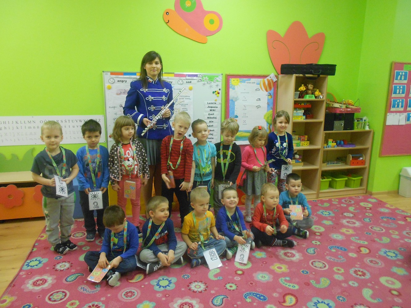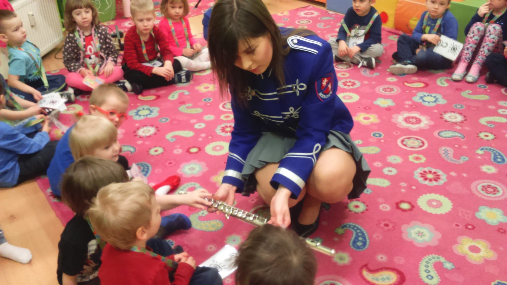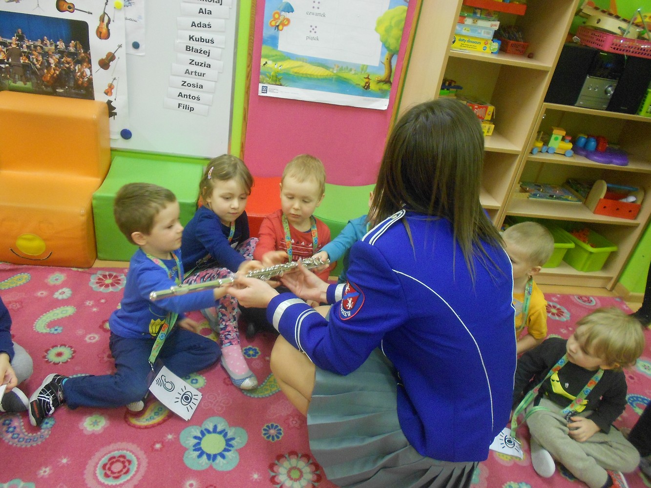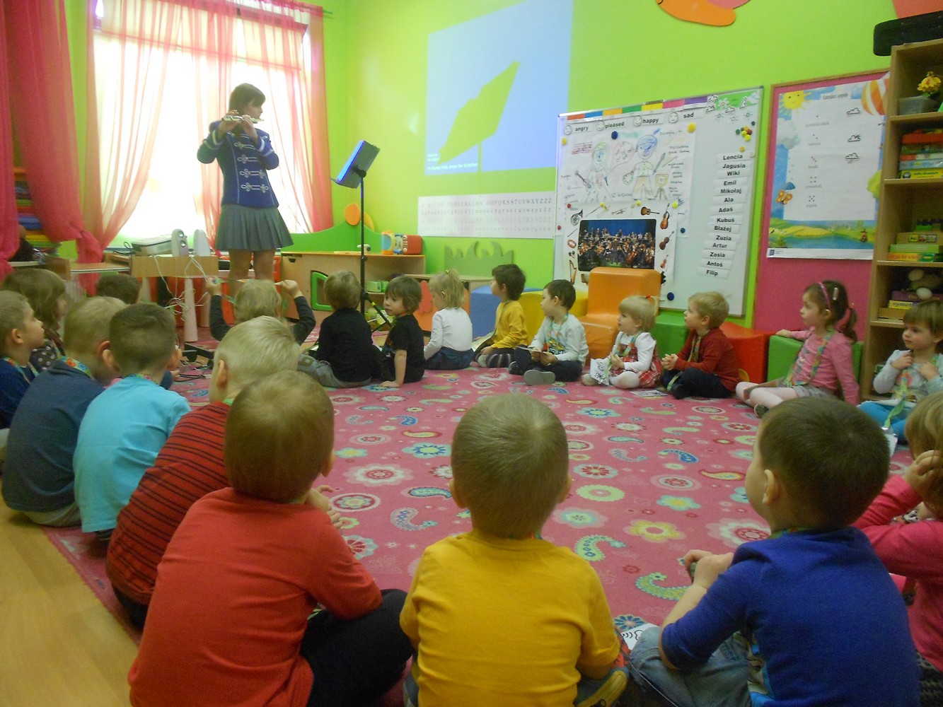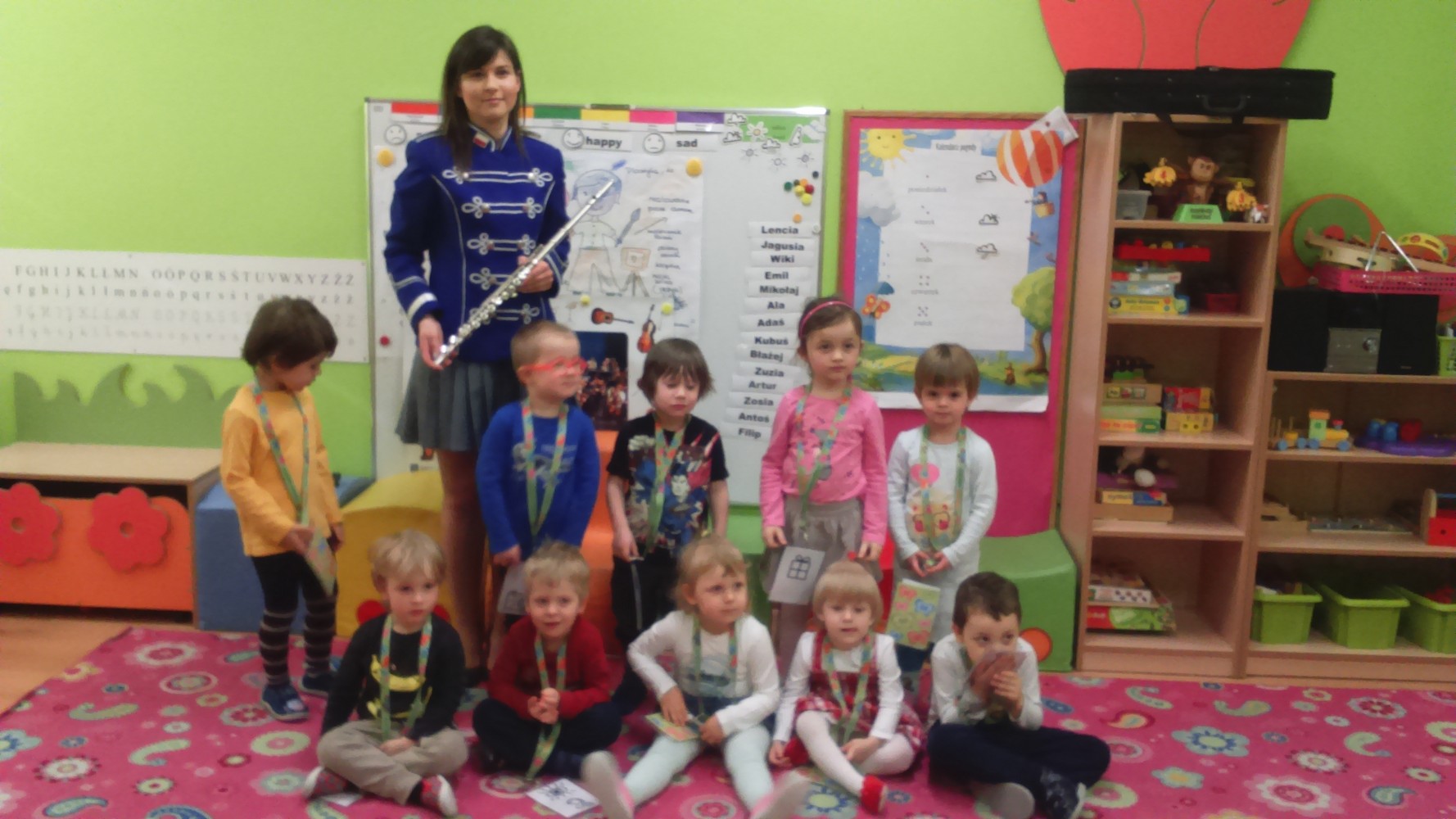 W związku z realizacją tematu tygodnia „Muzyka i sztuka” dzieci z grupy III i II spotkały się z ekspertem od muzyki. Pani Dagmara, która gra w orkiestrze, zapoznała dzieci z budową fletu poprzecznego, jego wyglądem, dźwiękami i zagrała dzieciom kilka utworów muzycznych na tym instrumencie.