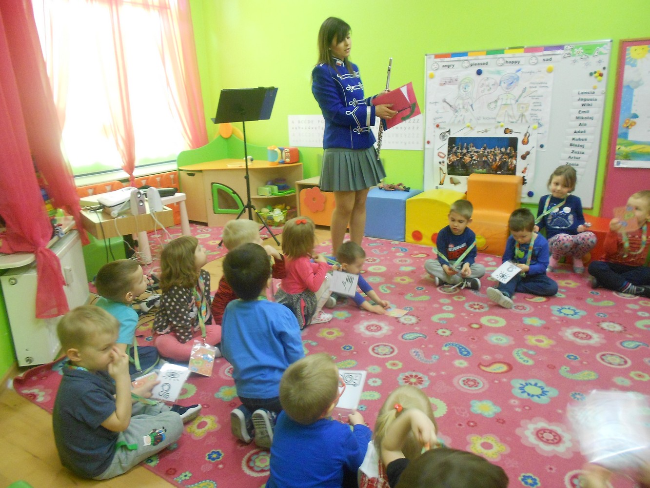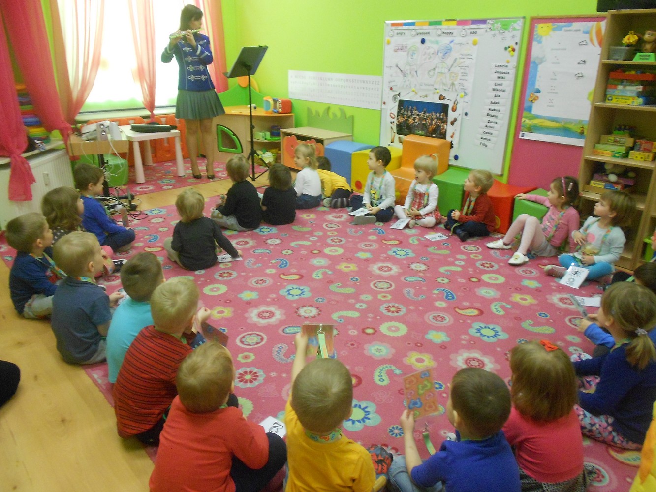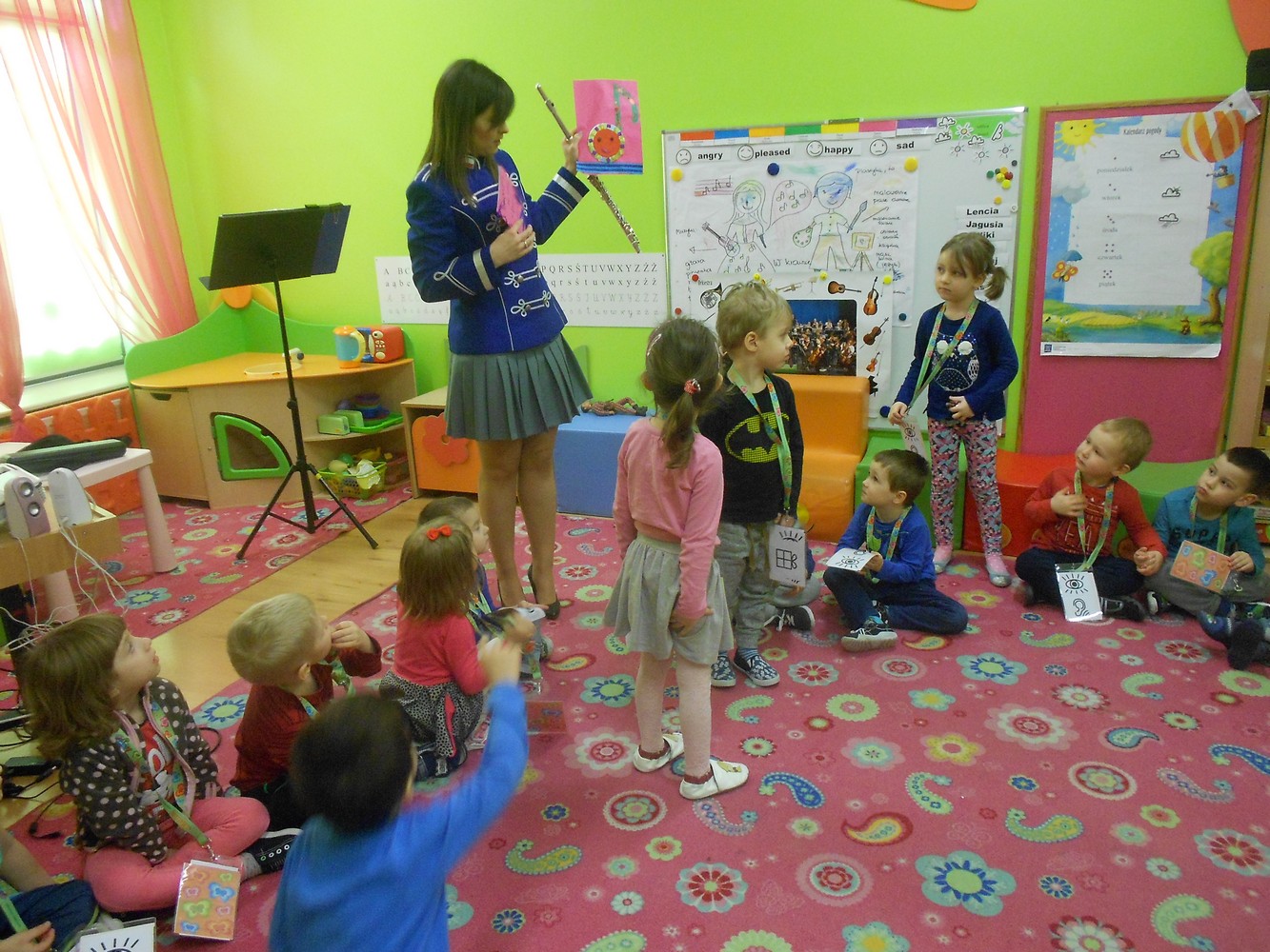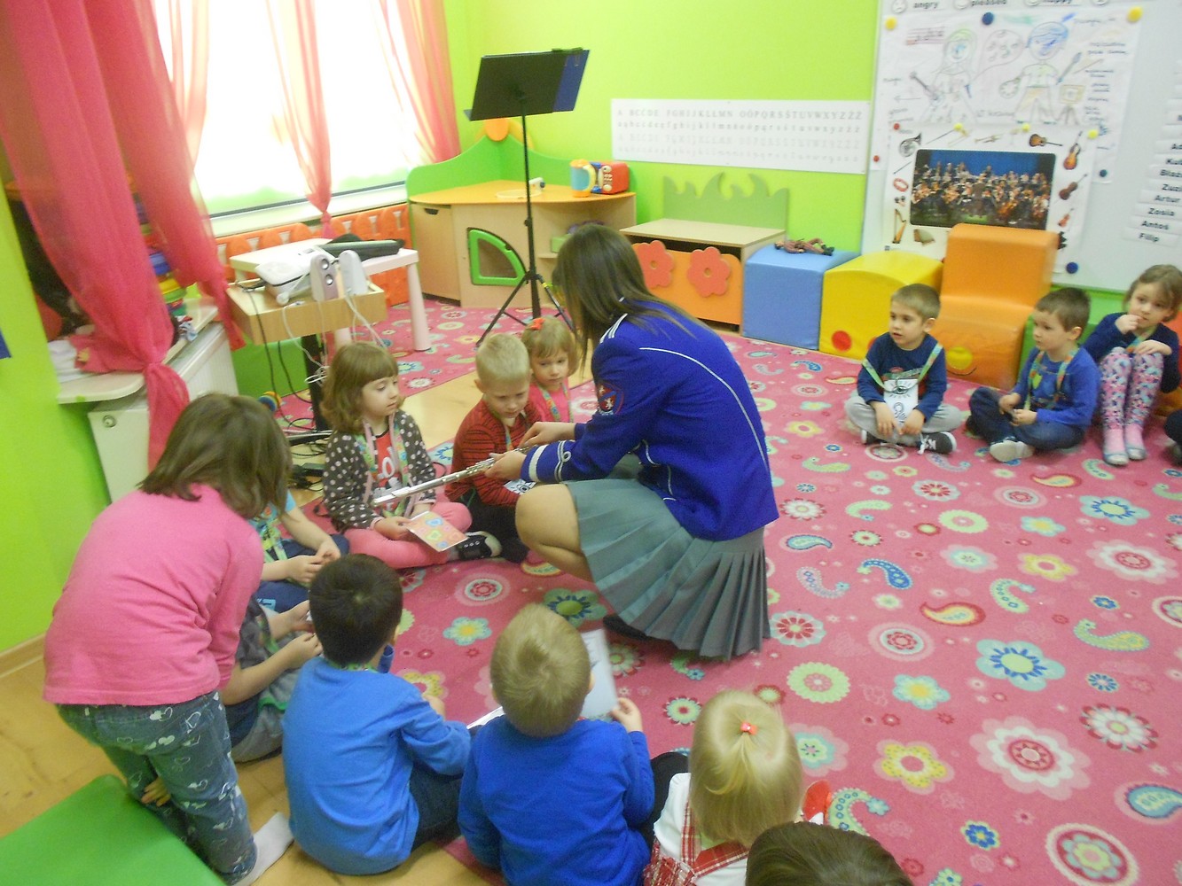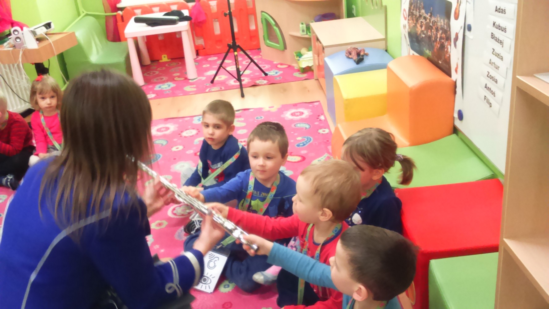 W związku z realizacją tematu tygodnia „Muzyka i sztuka” dzieci z grupy III i II spotkały się z ekspertem od muzyki. Pani Dagmara, która gra w orkiestrze, zapoznała dzieci z budową fletu poprzecznego, jego wyglądem, dźwiękami i zagrała dzieciom kilka utworów muzycznych na tym instrumencie.