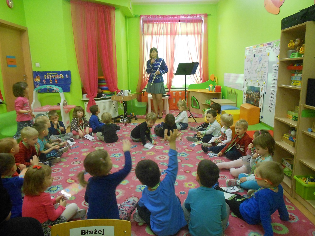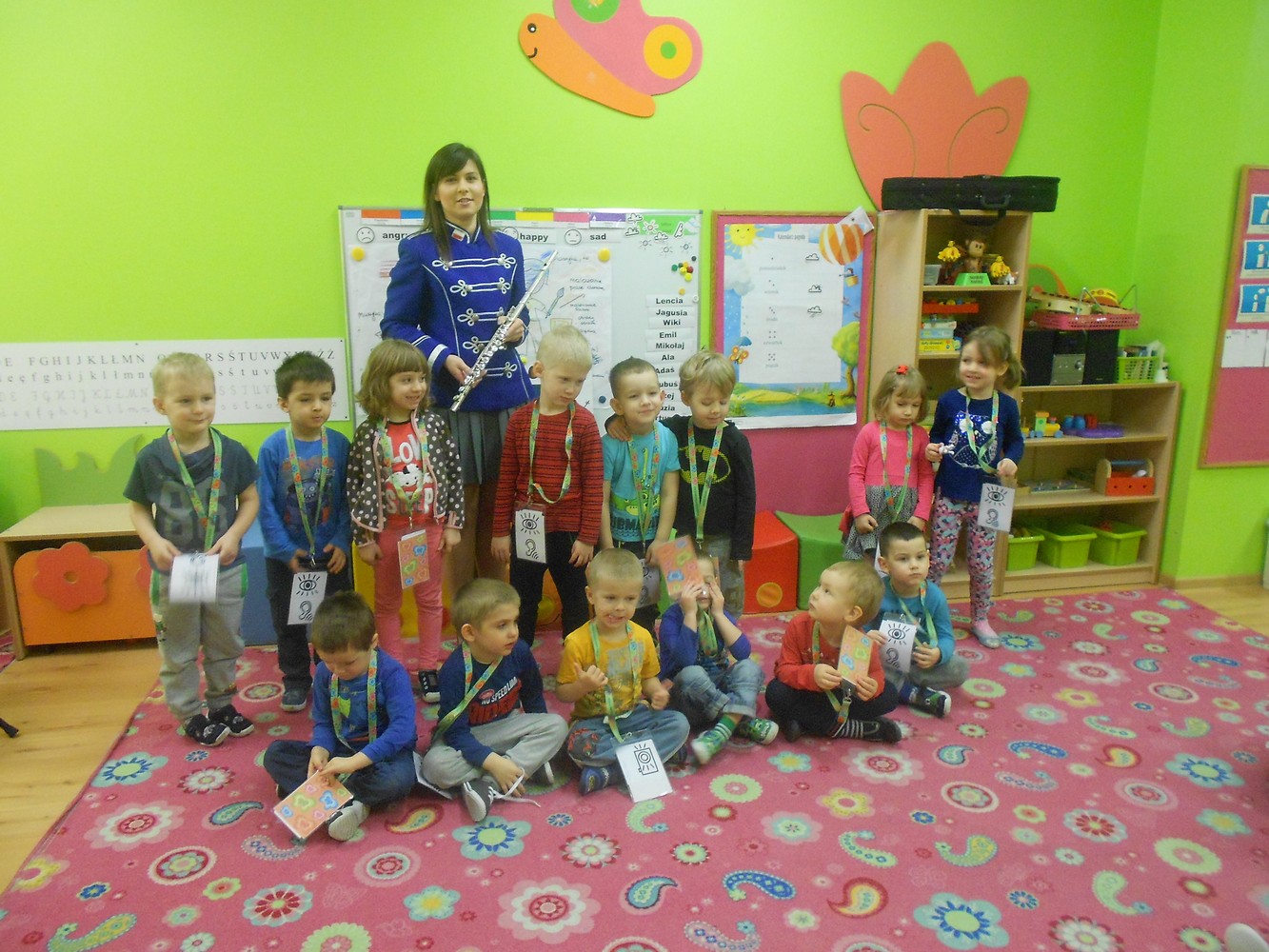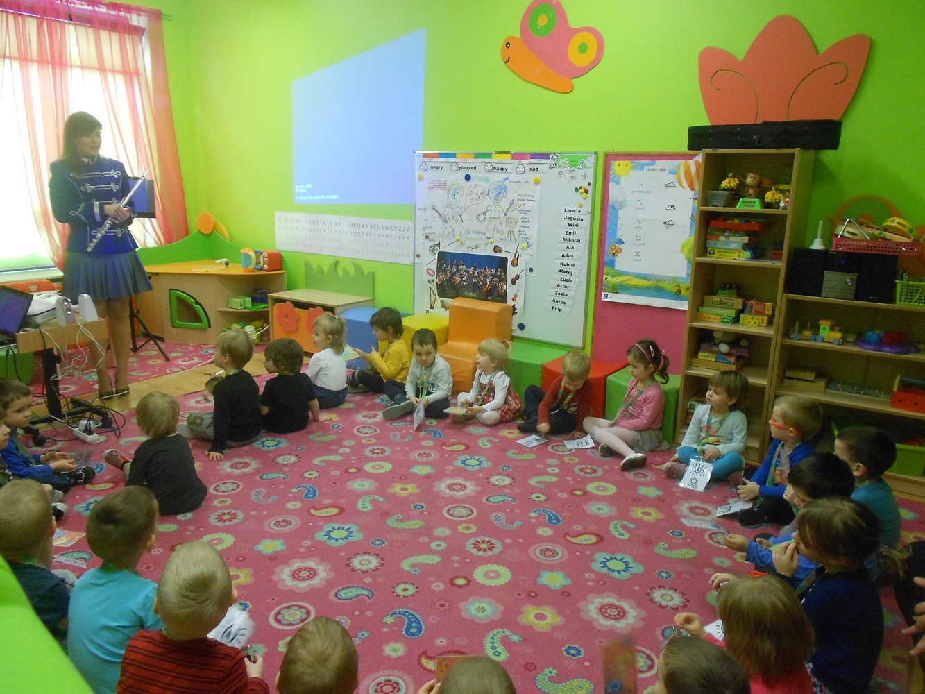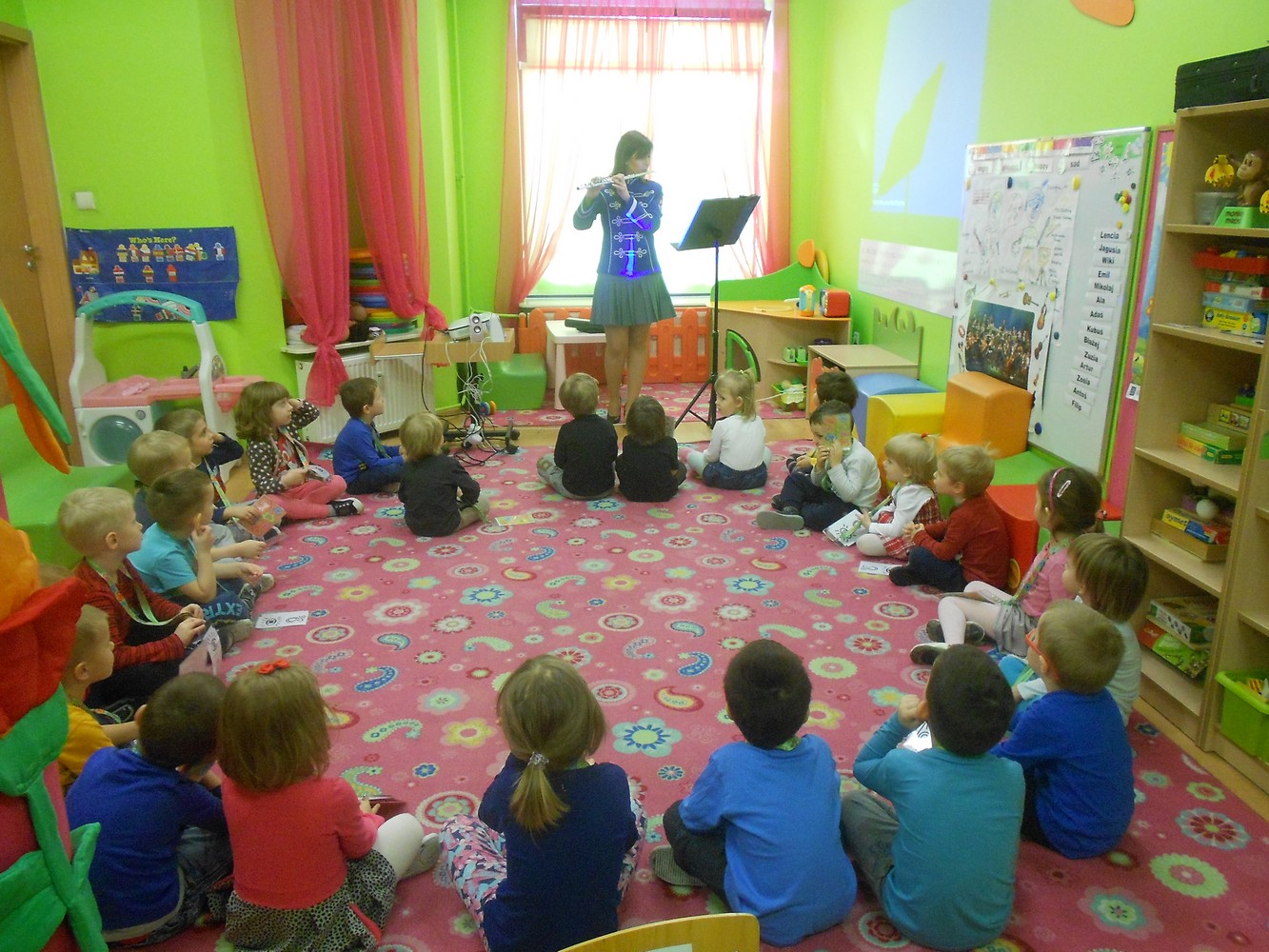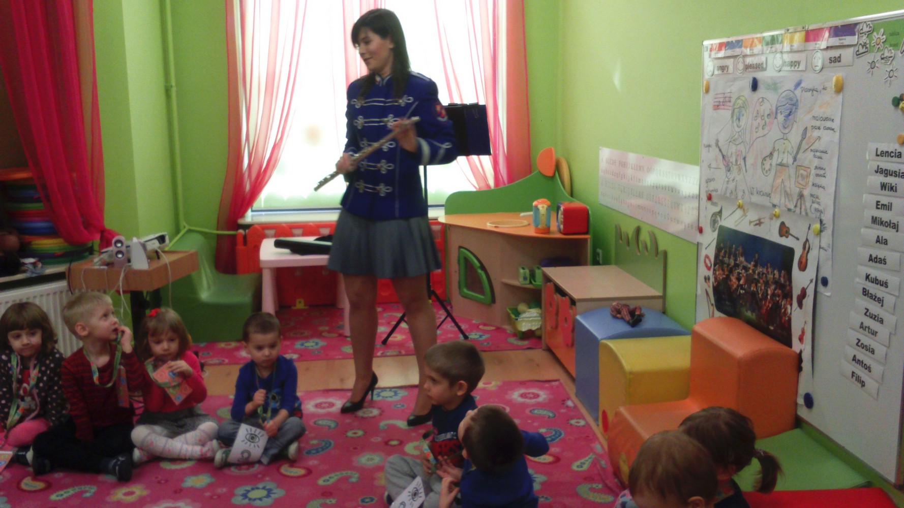 W związku z realizacją tematu tygodnia „Muzyka i sztuka” dzieci z grupy III i II spotkały się z ekspertem od muzyki. Pani Dagmara, która gra w orkiestrze, zapoznała dzieci z budową fletu poprzecznego, jego wyglądem, dźwiękami i zagrała dzieciom kilka utworów muzycznych na tym instrumencie.