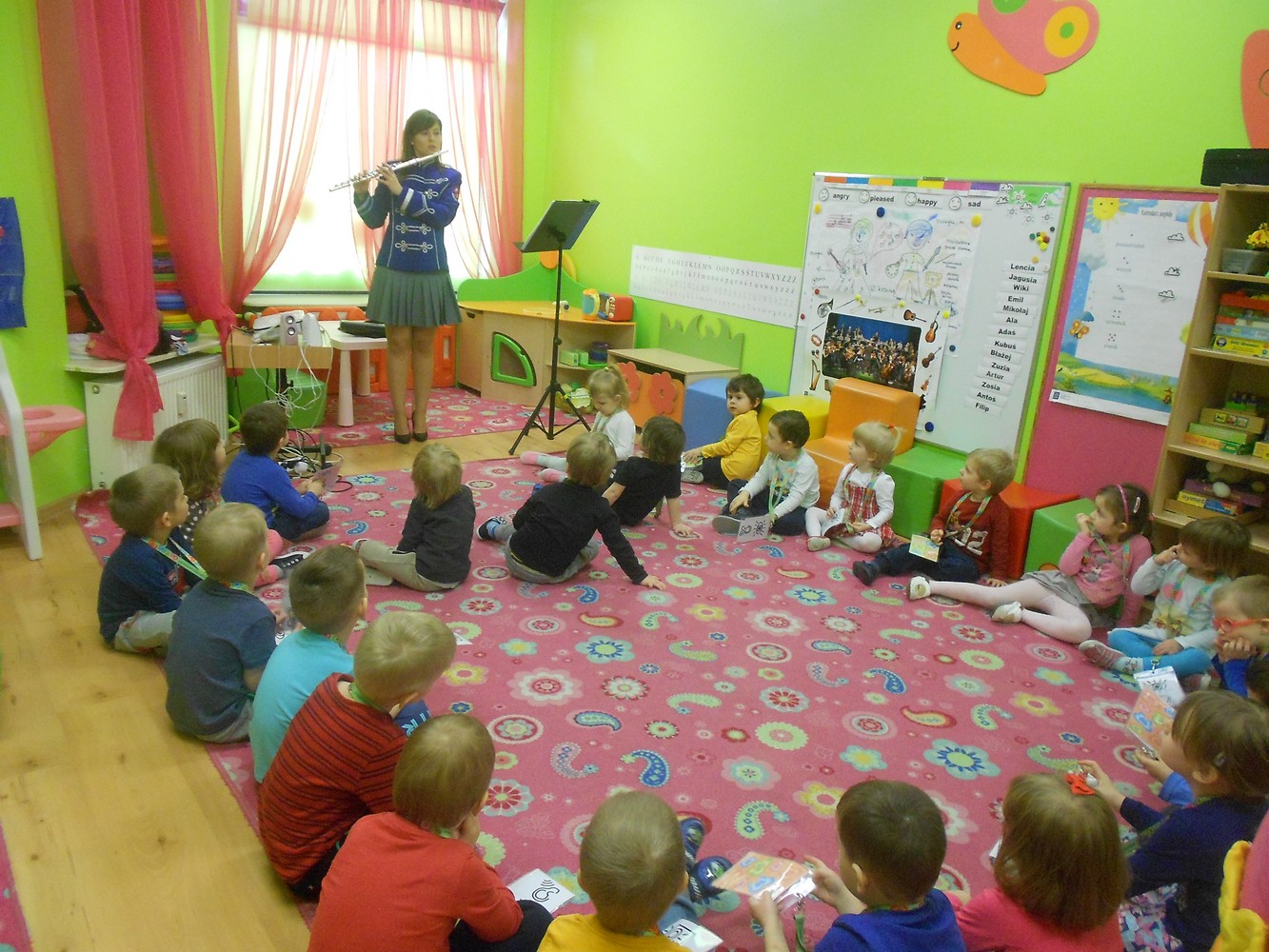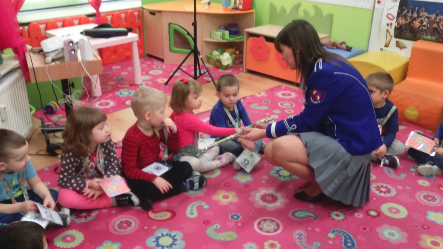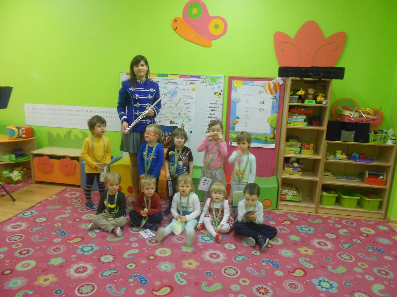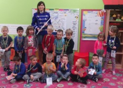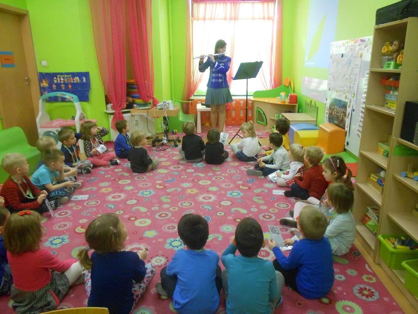 W związku z realizacją tematu tygodnia „Muzyka i sztuka” dzieci z grupy III i II spotkały się z ekspertem od muzyki. Pani Dagmara, która gra w orkiestrze, zapoznała dzieci z budową fletu poprzecznego, jego wyglądem, dźwiękami i zagrała dzieciom kilka utworów muzycznych na tym instrumencie.