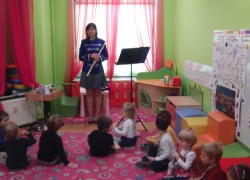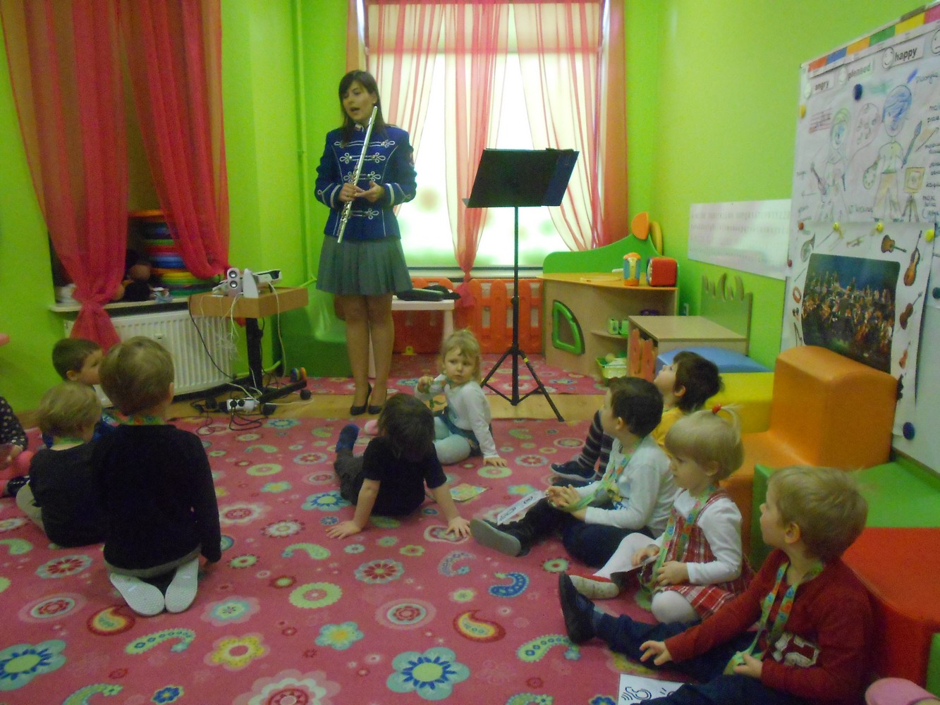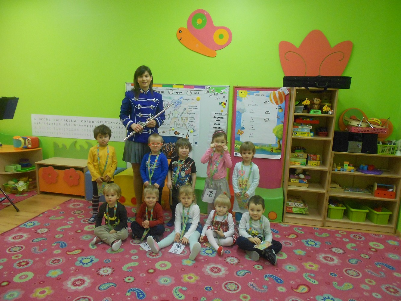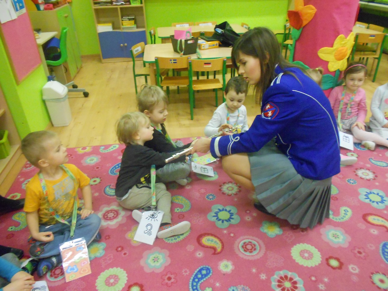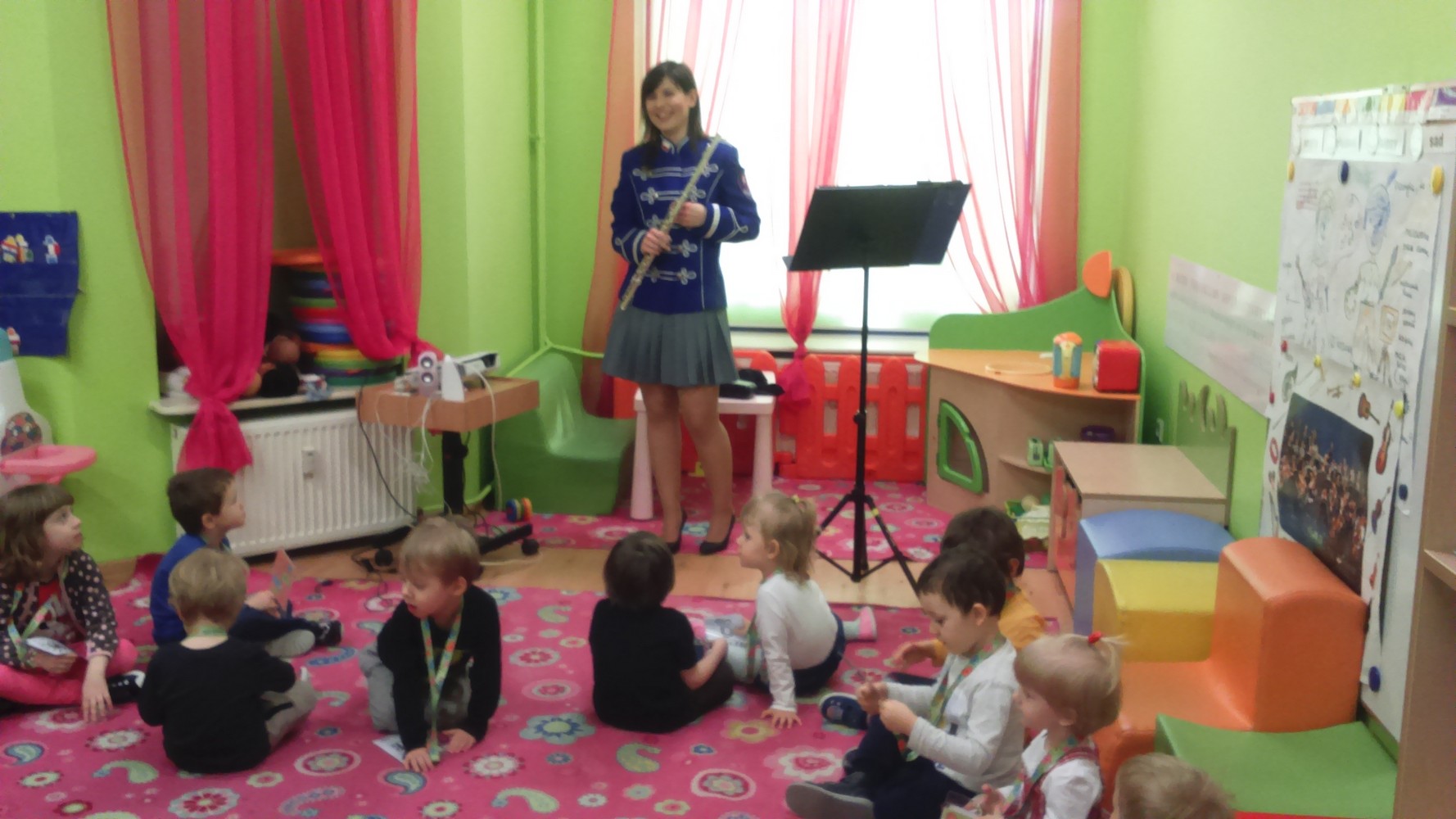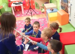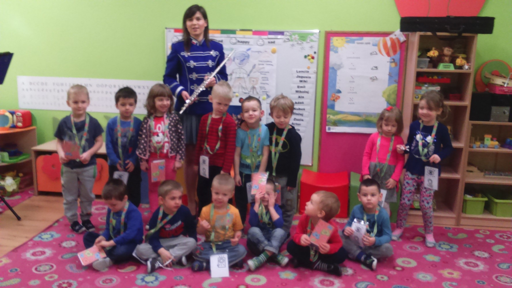 W związku z realizacją tematu tygodnia „Muzyka i sztuka” dzieci z grupy III i II spotkały się z ekspertem od muzyki. Pani Dagmara, która gra w orkiestrze, zapoznała dzieci z budową fletu poprzecznego, jego wyglądem, dźwiękami i zagrała dzieciom kilka utworów muzycznych na tym instrumencie.