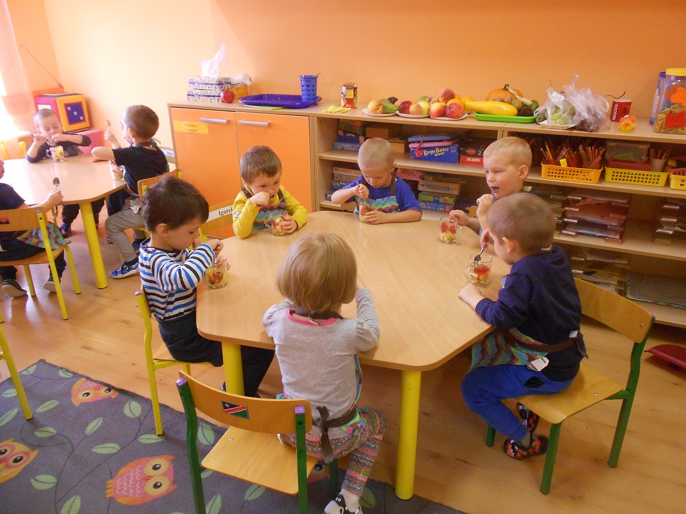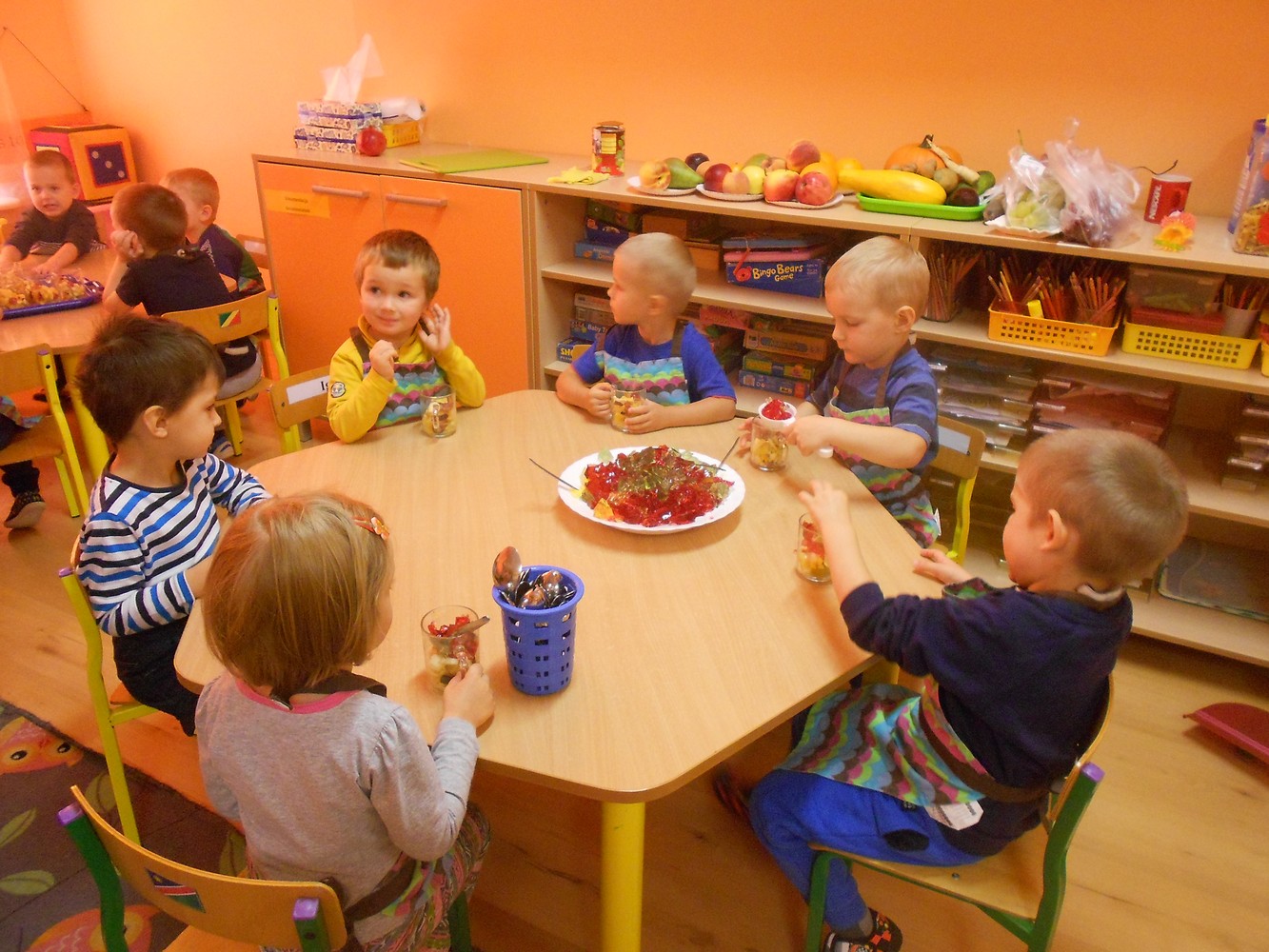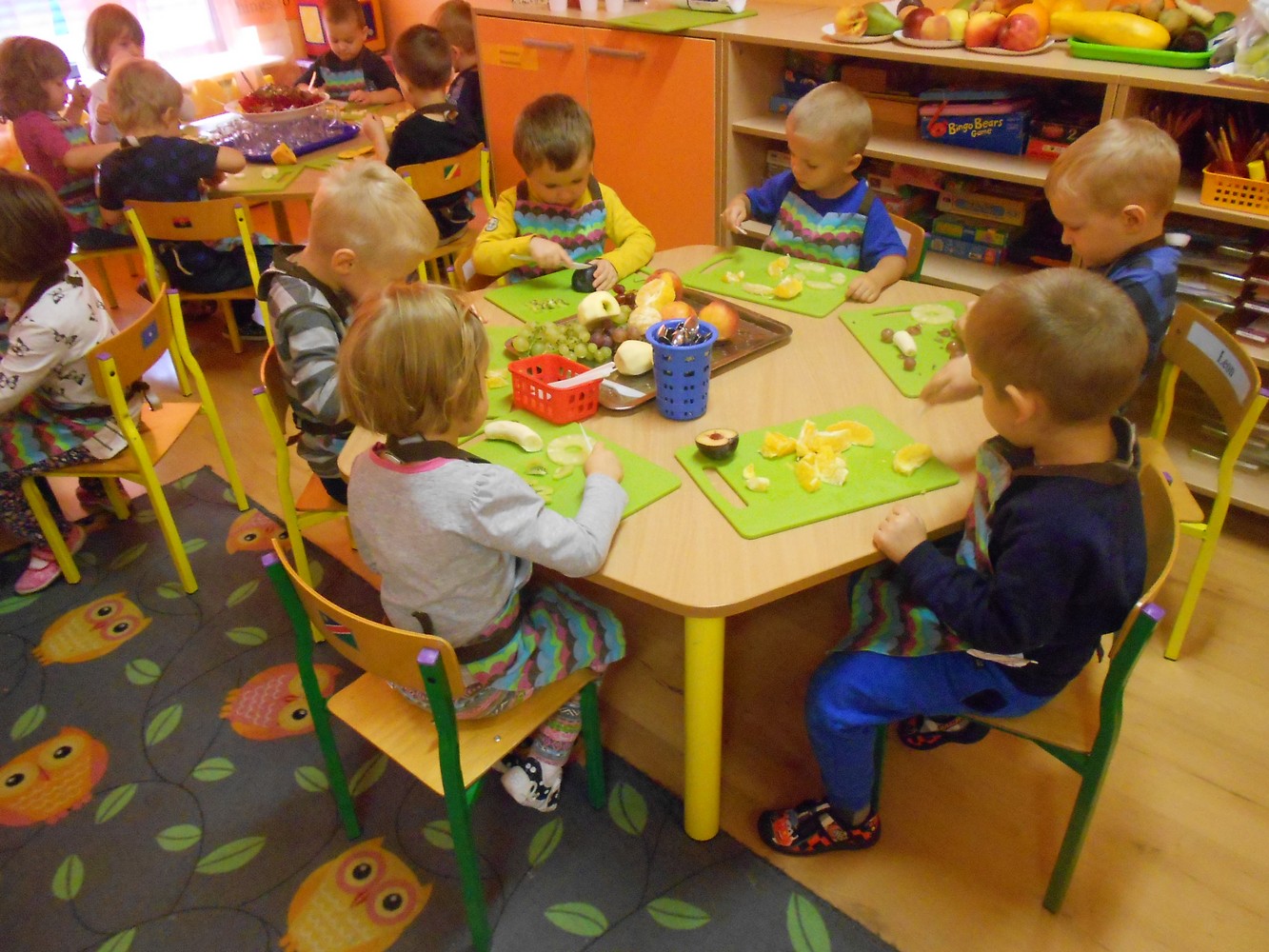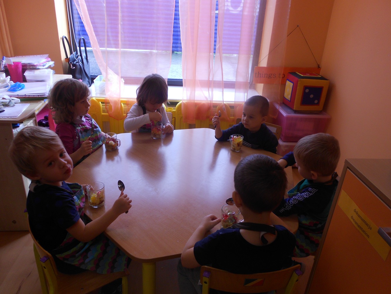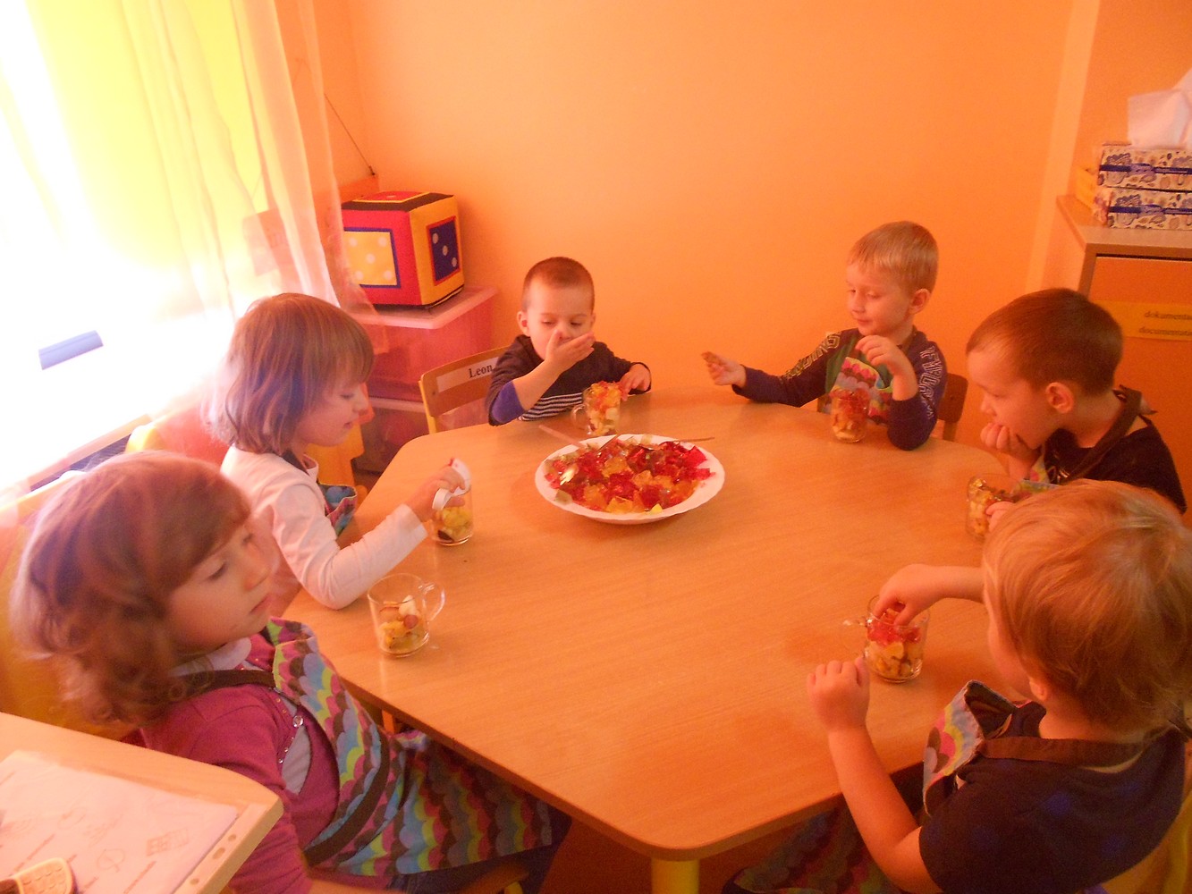 Kształ­tu­jąc wła­ściwe nawyki żywie­niowe oraz znając war­to­ści odżyw­cze owoców dzieci w grupie III pod­czas zajęć kuli­nar­nych samo­dziel­nie przy­go­to­wały deser owo­cowy.