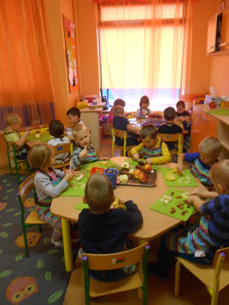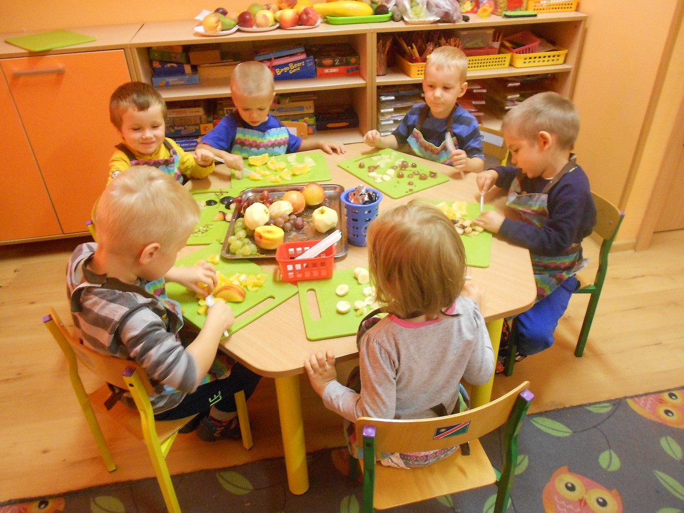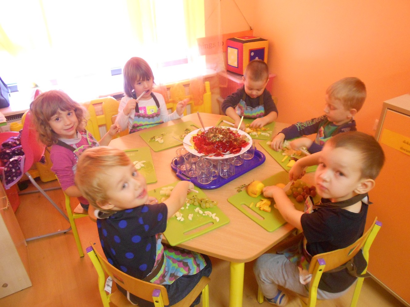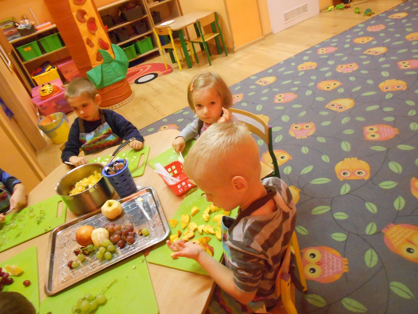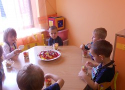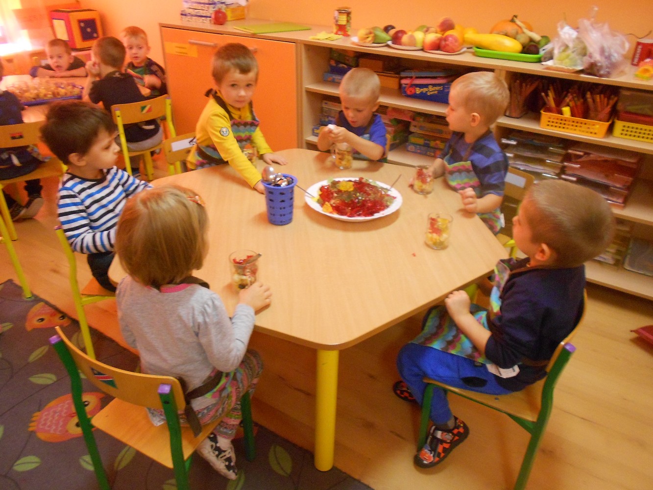 Kształ­tu­jąc wła­ściwe nawyki żywie­niowe oraz znając war­to­ści odżyw­cze owoców dzieci w grupie III pod­czas zajęć kuli­nar­nych samo­dziel­nie przy­go­to­wały deser owo­cowy.