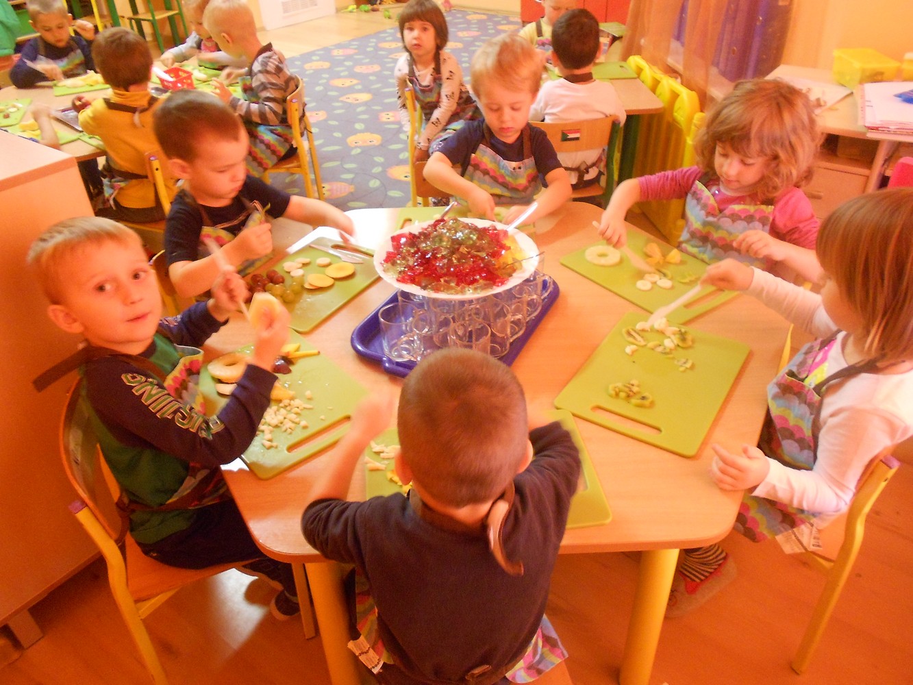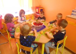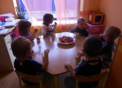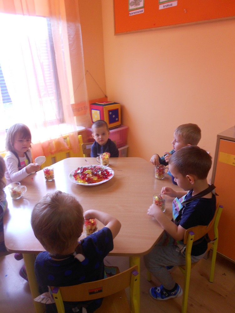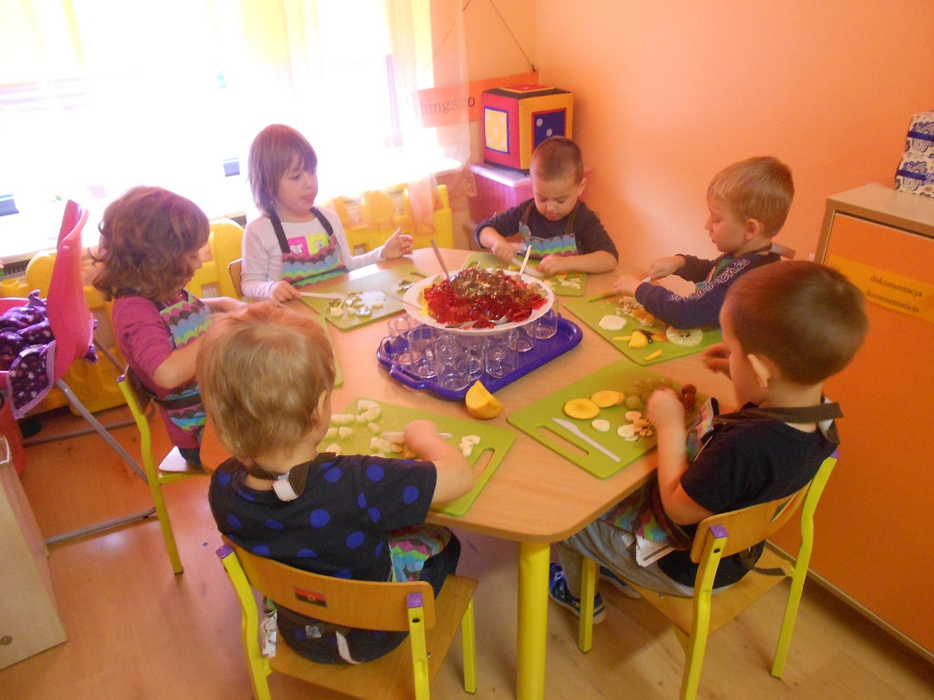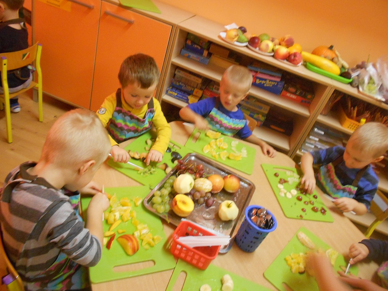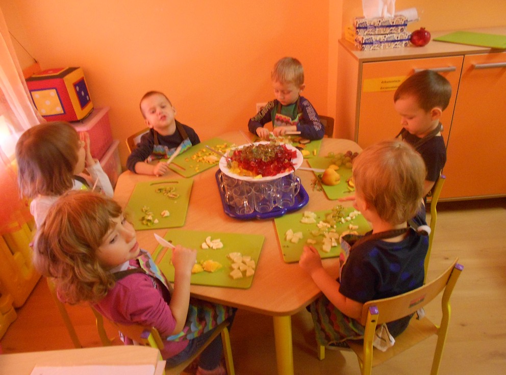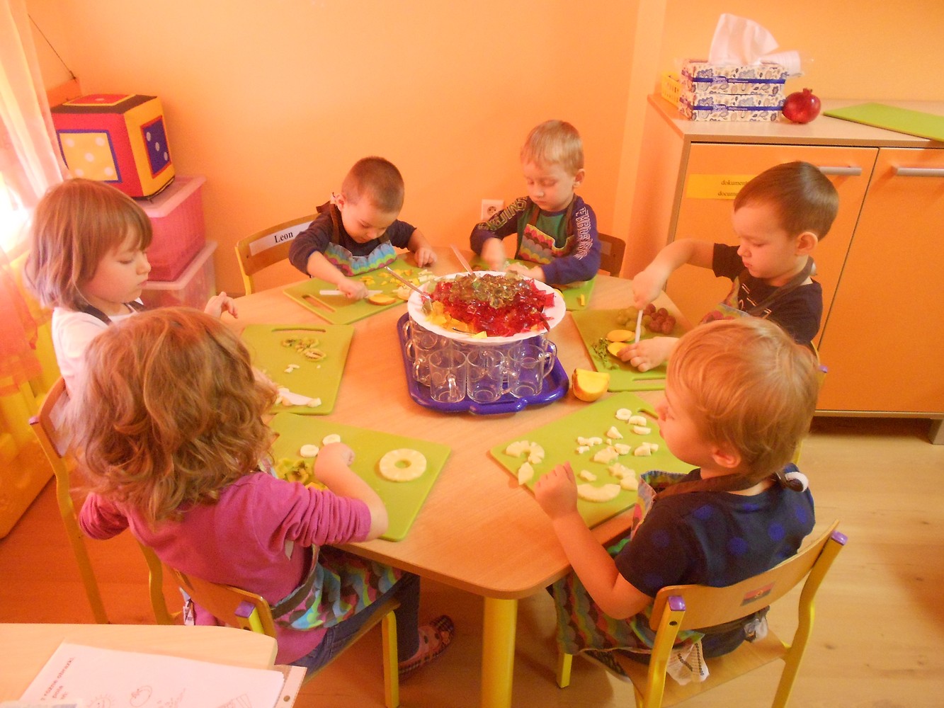 Kształ­tu­jąc wła­ściwe nawyki żywie­niowe oraz znając war­to­ści odżyw­cze owoców dzieci w grupie III pod­czas zajęć kuli­nar­nych samo­dziel­nie przy­go­to­wały deser owo­cowy.