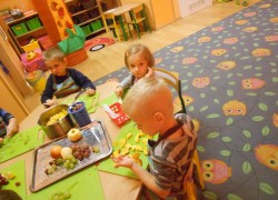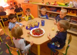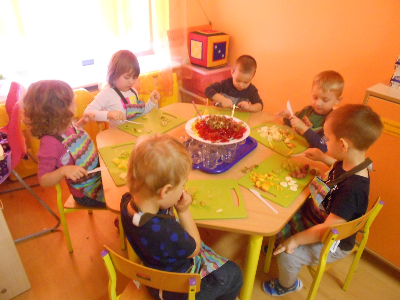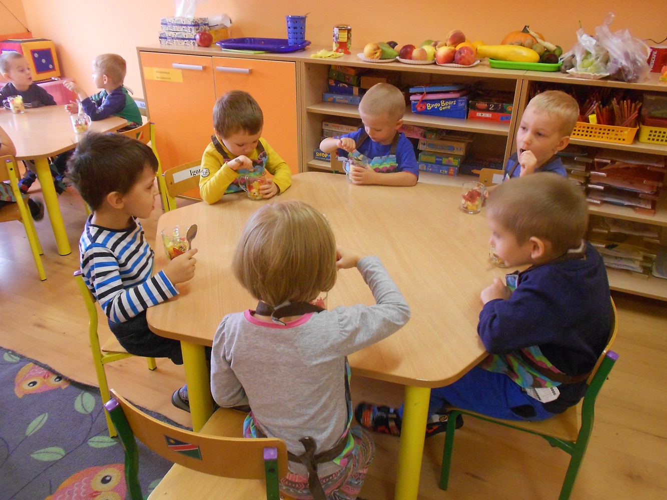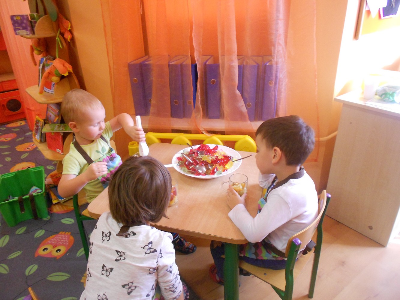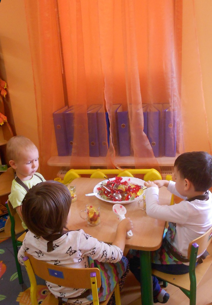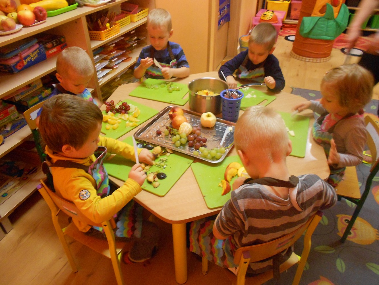 Kształ­tu­jąc wła­ściwe nawyki żywie­niowe oraz znając war­to­ści odżyw­cze owoców dzieci w grupie III pod­czas zajęć kuli­nar­nych samo­dziel­nie przy­go­to­wały deser owo­cowy.