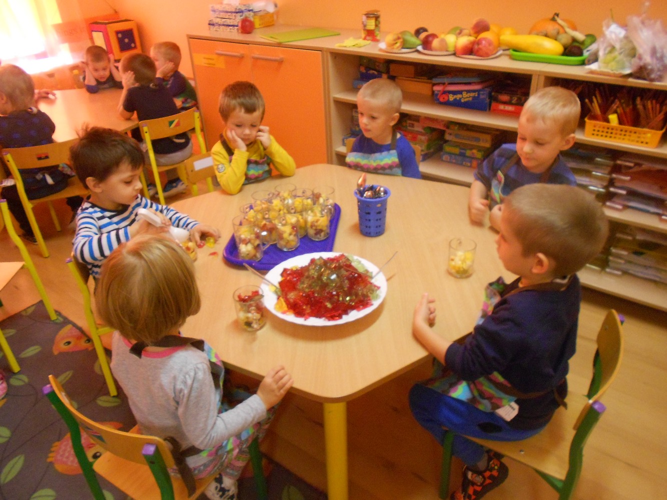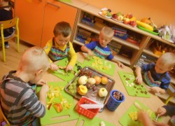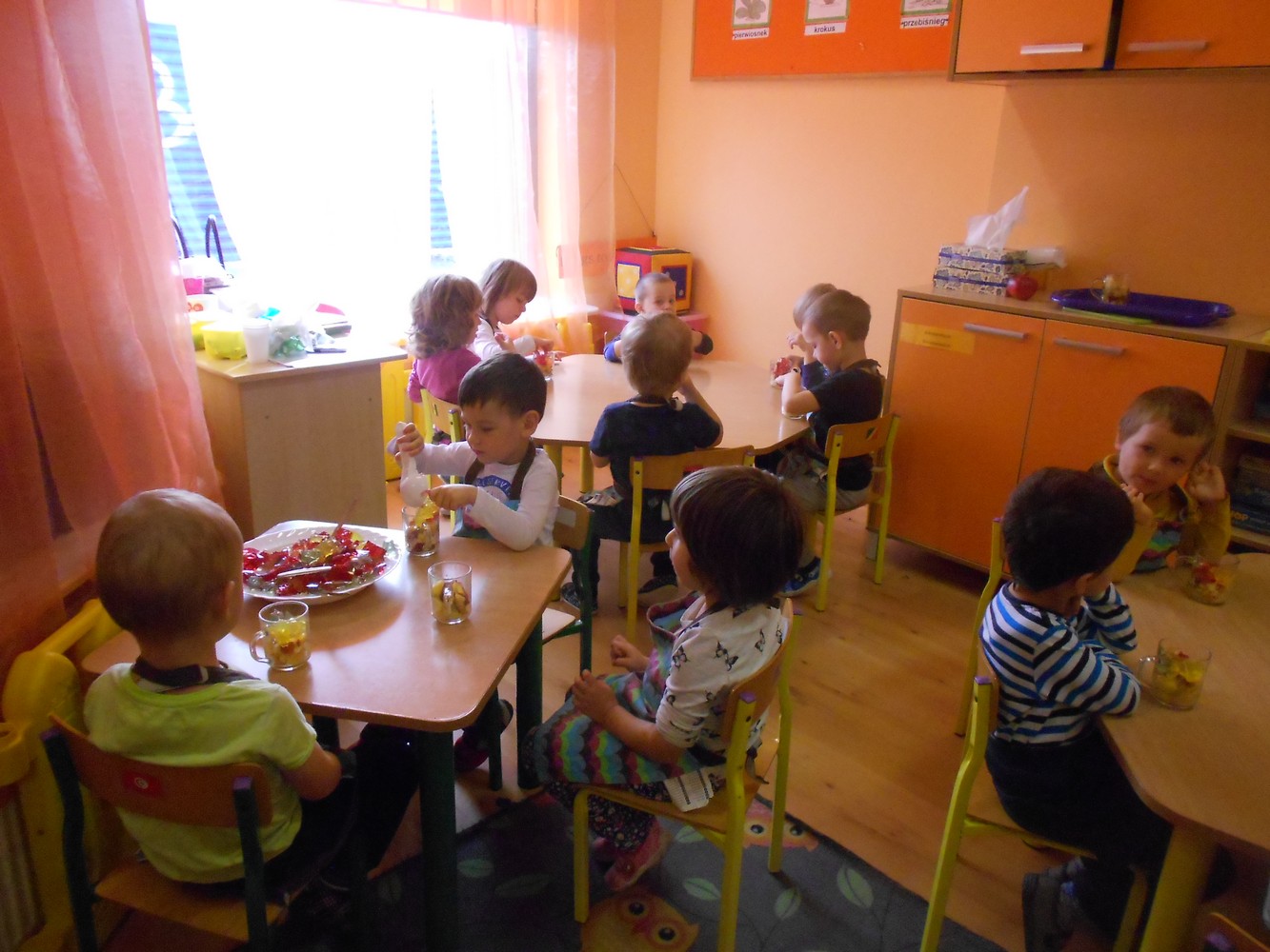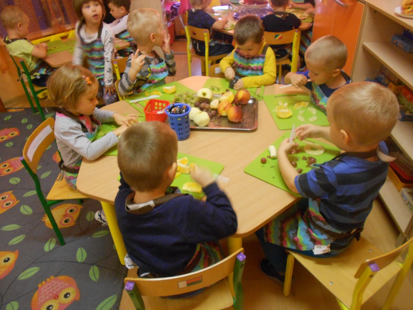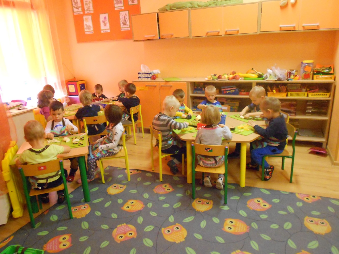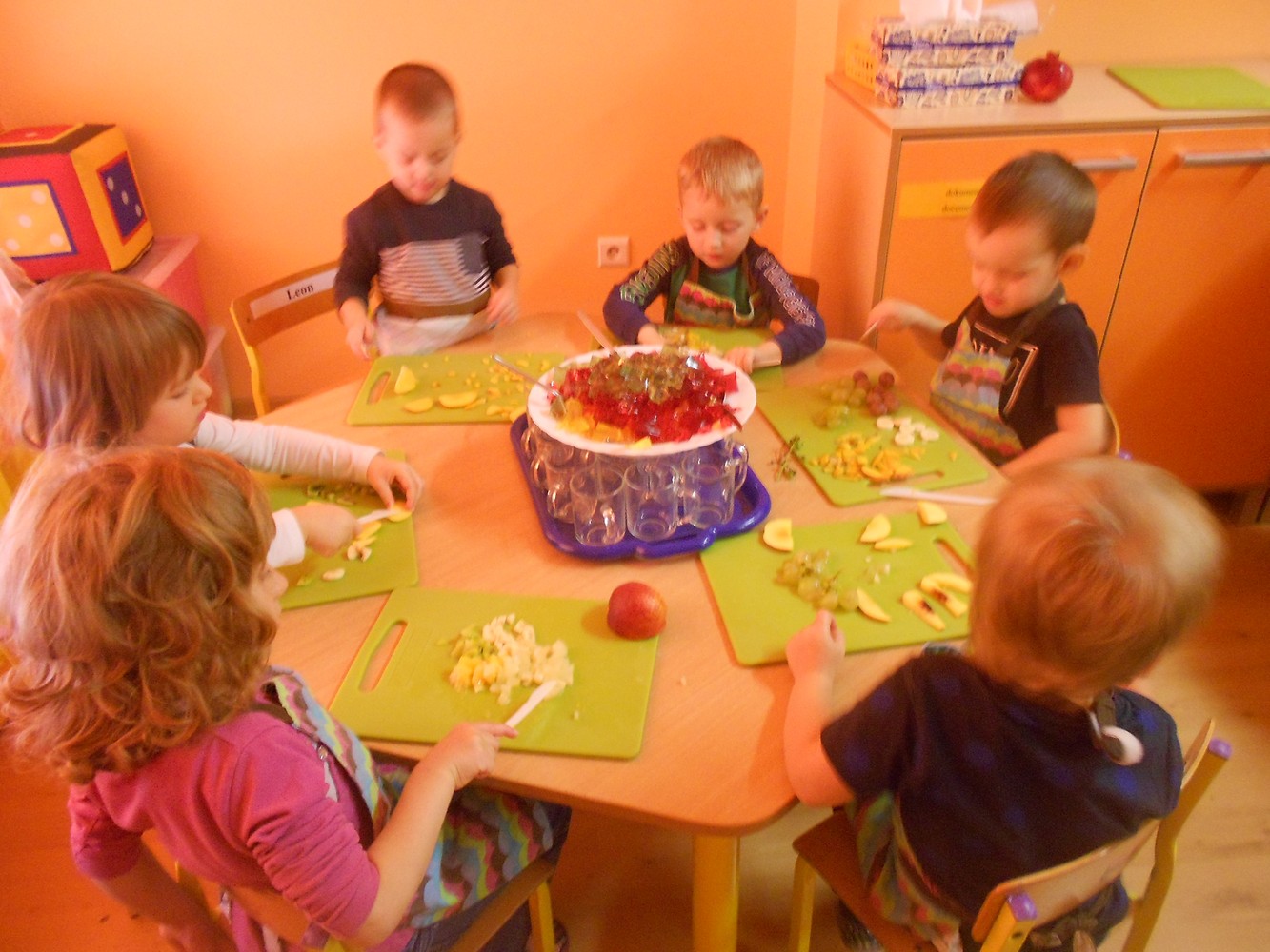 Kształ­tu­jąc wła­ściwe nawyki żywie­niowe oraz znając war­to­ści odżyw­cze owoców dzieci w grupie III pod­czas zajęć kuli­nar­nych samo­dziel­nie przy­go­to­wały deser owo­cowy.
