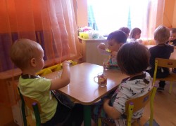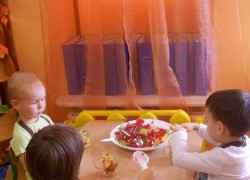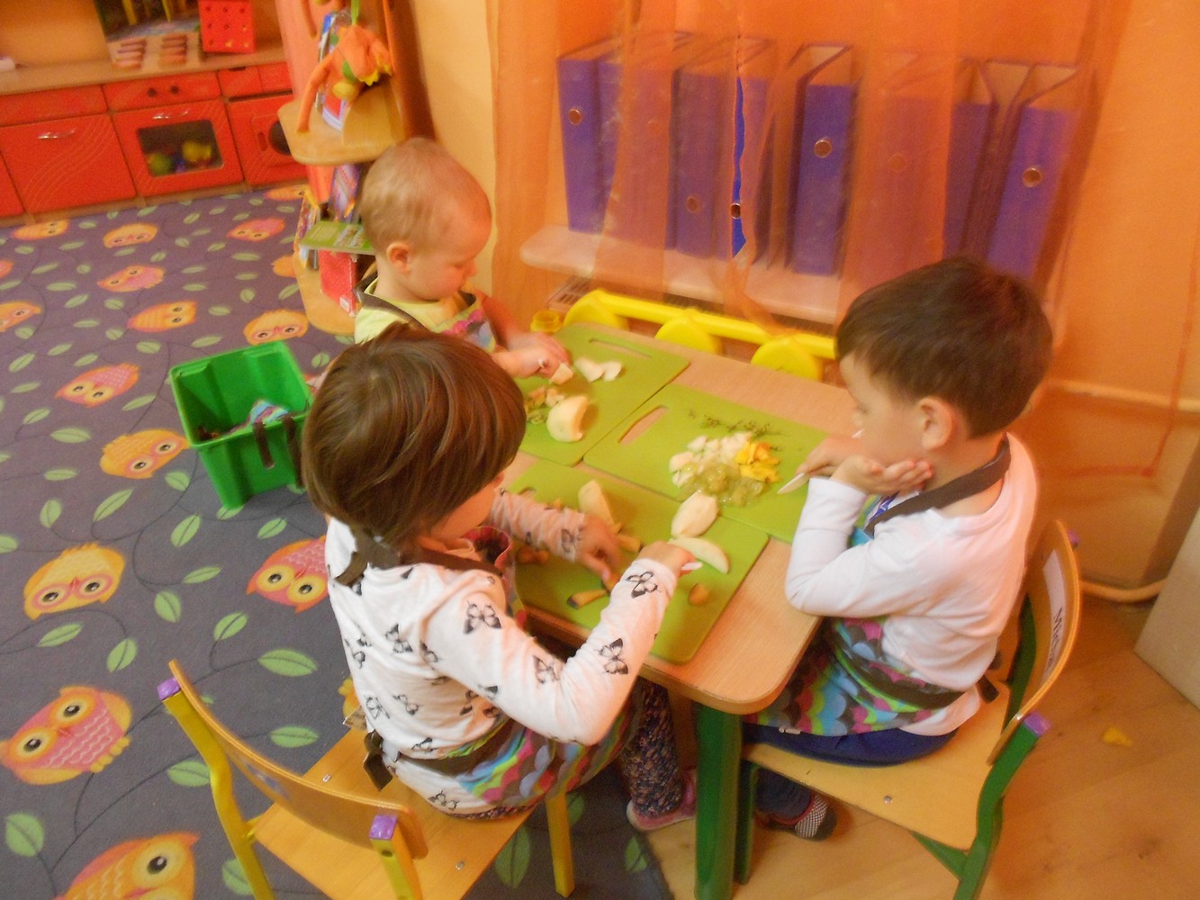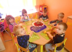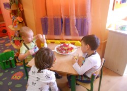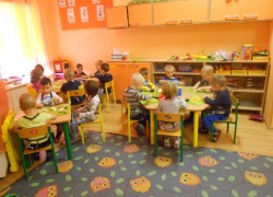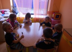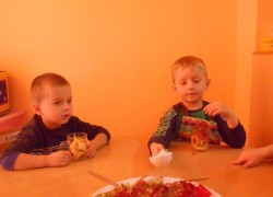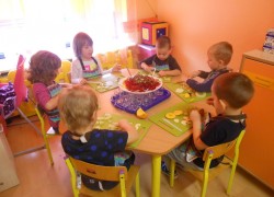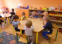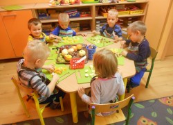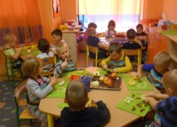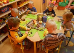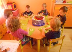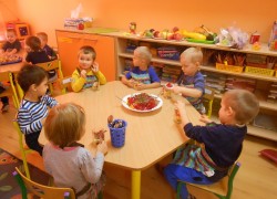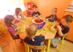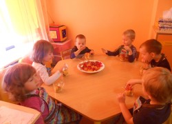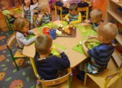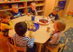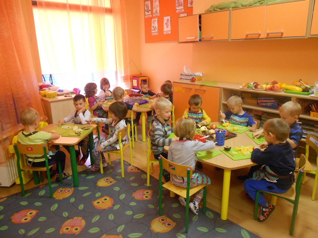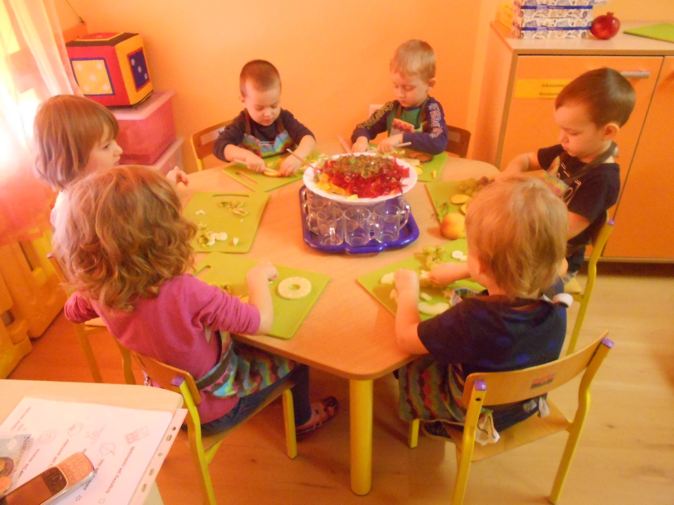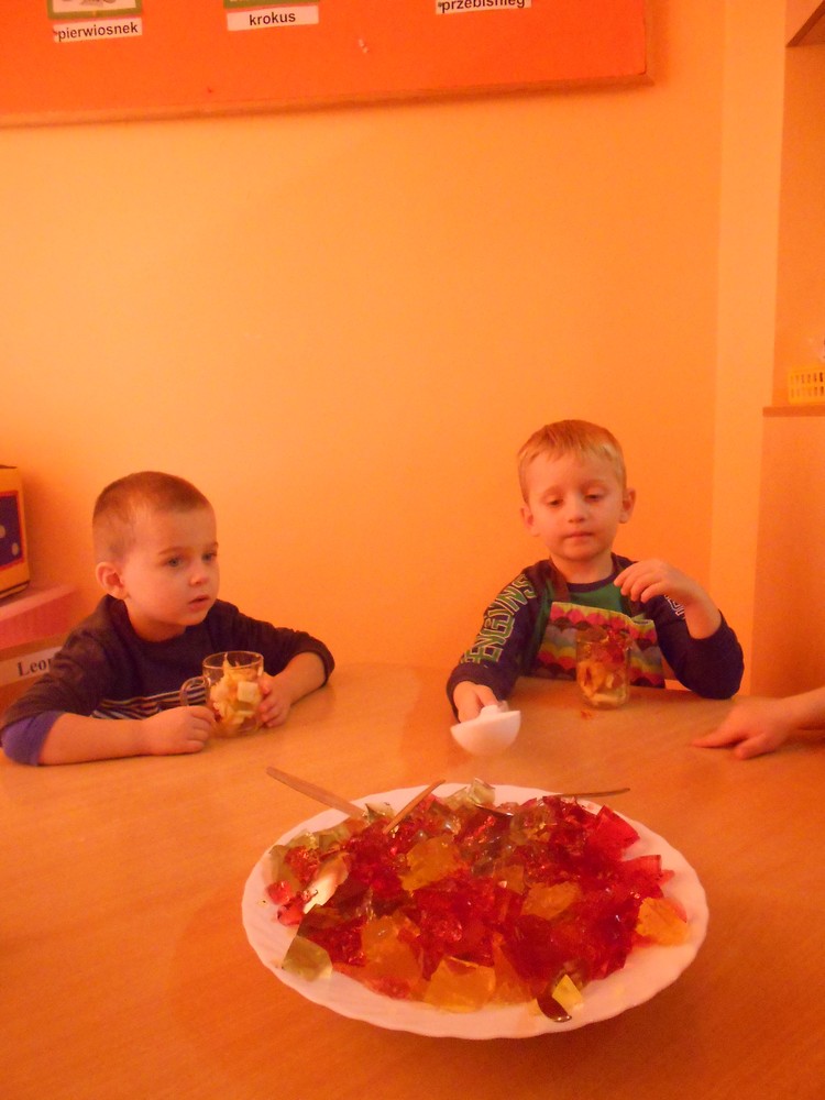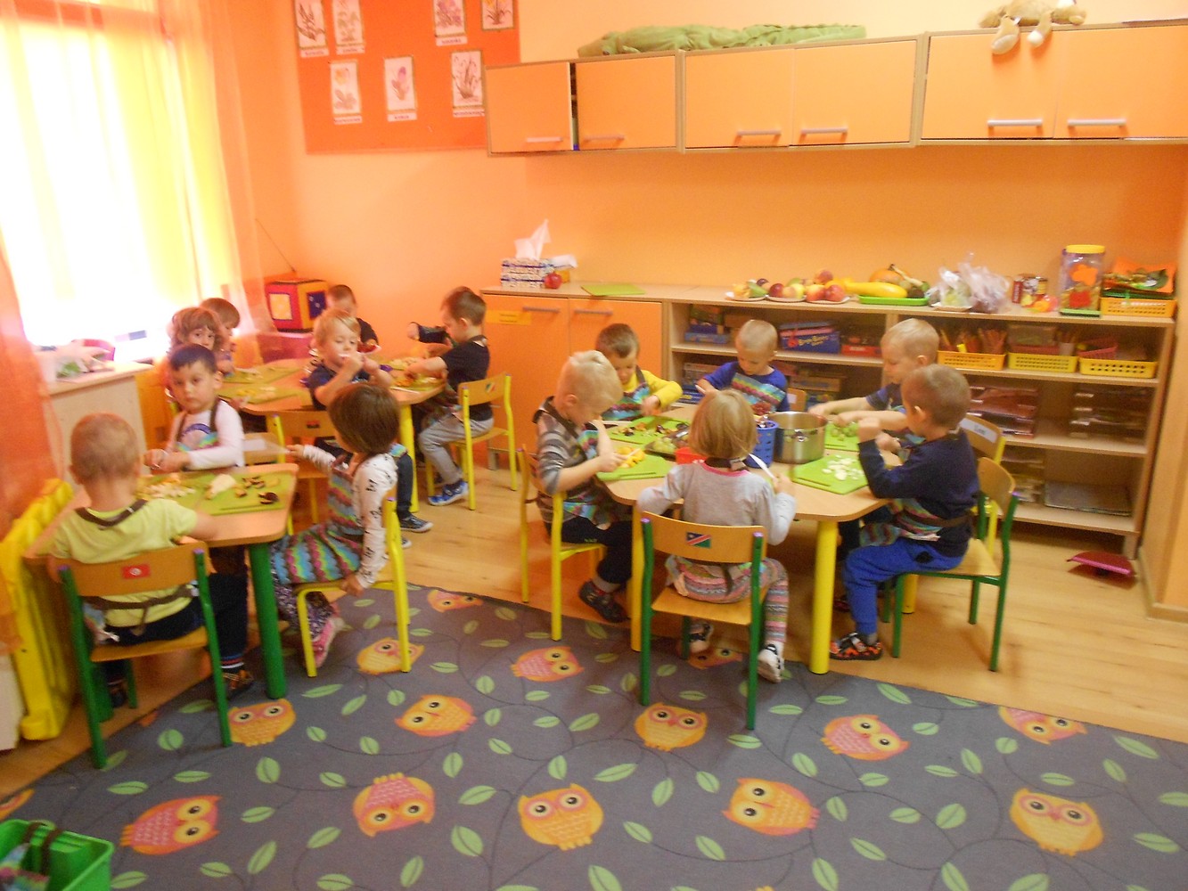 Kształ­tu­jąc wła­ściwe nawyki żywie­niowe oraz znając war­to­ści odżyw­cze owoców dzieci w grupie III pod­czas zajęć kuli­nar­nych samo­dziel­nie przy­go­to­wały deser owo­cowy.